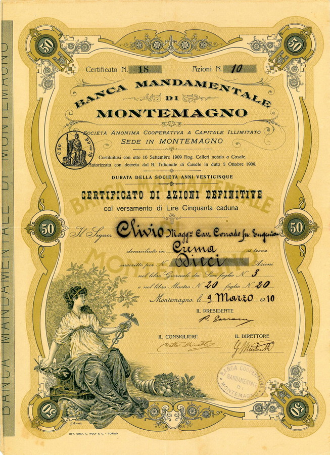 - 1910 - BANCA MANDAMENTALE DI MONTEMAGNO ILLUSTRATORE G. MORELLO 10 AZIONI.