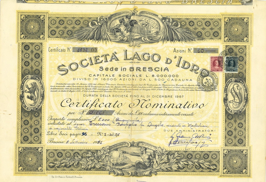 Precedente Lotto 415 Successivo Capitolium Art - Via Carlo Cattaneo 55, 25121 Brescia Asta 521 | NUMISMATICA IV Tornata, 319-419 mercoledì 7 maggio 2025 ore 19:00 (UTC +01:00) - 1951 - LAGO D'IDRO - 10 AZIONI BRESCIA. 1951 - LAGO D'IDRO - 10 AZIONI BRESCIA. . .