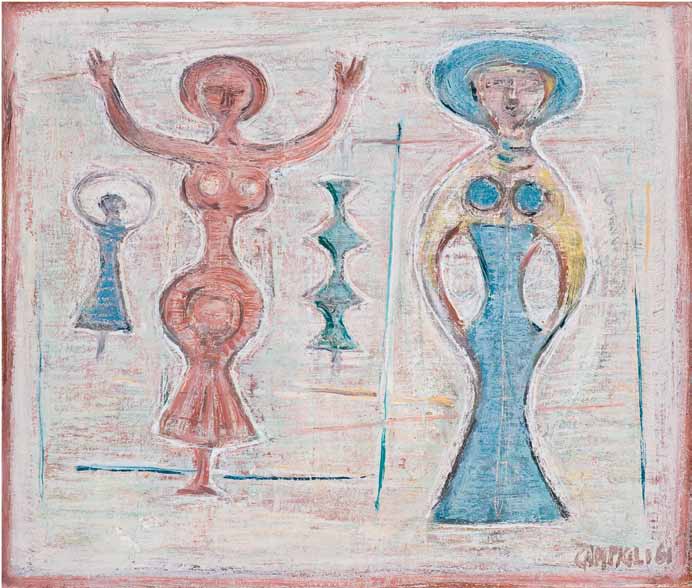 Massimo Campigli Firenze 1895 - Saint Tropez 1971 Figure, 1961 olio su tela, cm 29x34. Firmato e datato in basso a destra: Campigli 61 Provenienza: Venezia, Galleria del Cavallino (timbro al verso); collezione privata. Autentica su fotografia n. 566161302 rilasciata dall’Archivio Massimo Campigli in data: Saint Tropez, 21 novembre 2013.