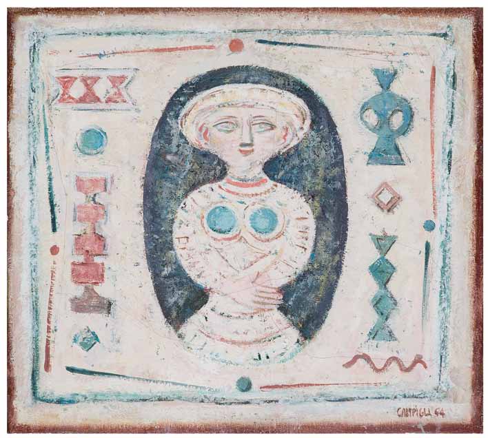 Massimo Campigli Berlino 1895 – St. Tropez 1971 Figure, 1964 olio su tela, cm 44x50. Firmato e datato in basso a destra: Campigli 64 Provenienza: Craans-Montana, Tornabuoni Arte; Milano, collezione privata. Autentica su fotografia numero 7608921 rilasciata dall’Archivio Massimo Campigli in data Saint Tropez, 14 giugno 2000.