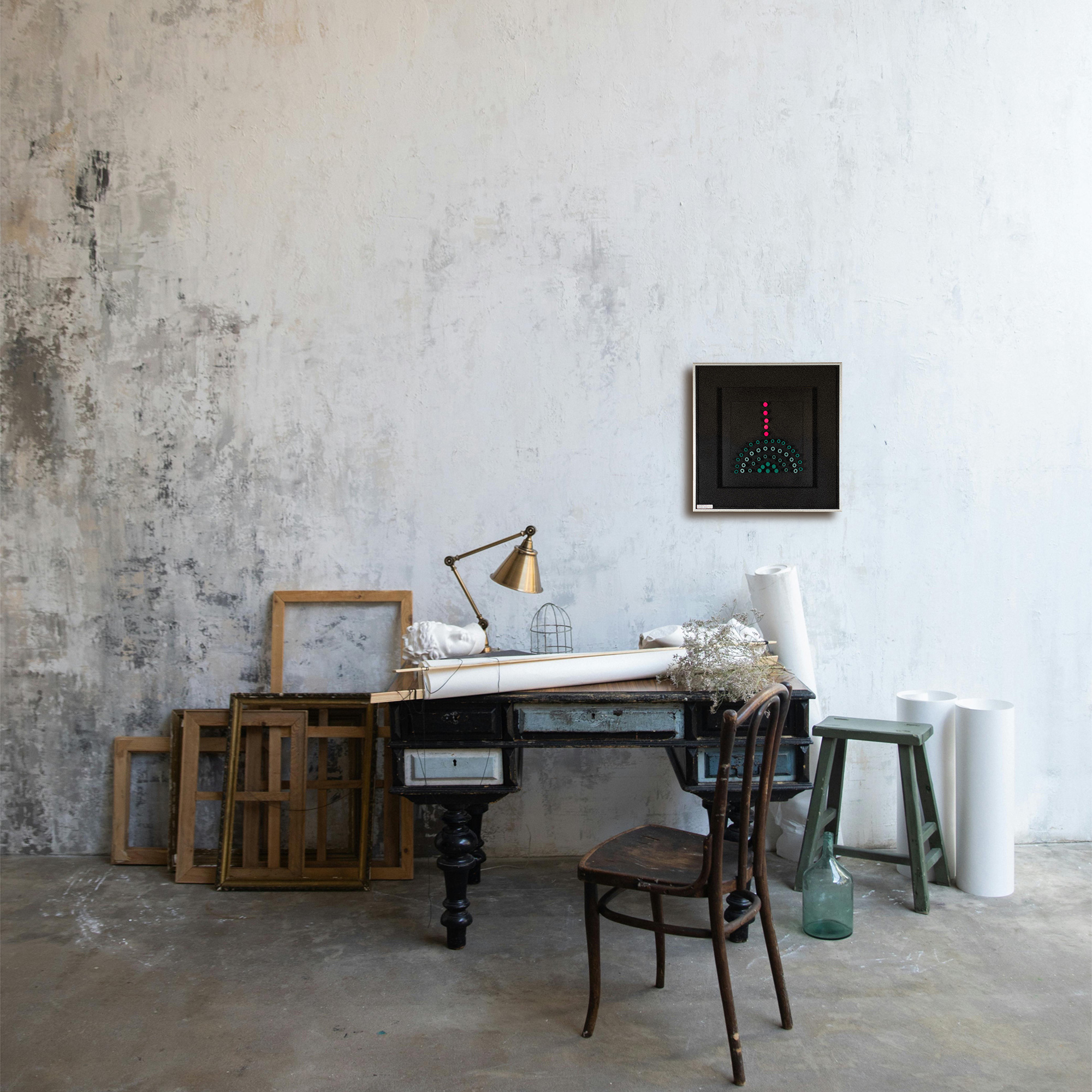 tecnica mista e cilindretti su tavola, cm 32,5x32,5.