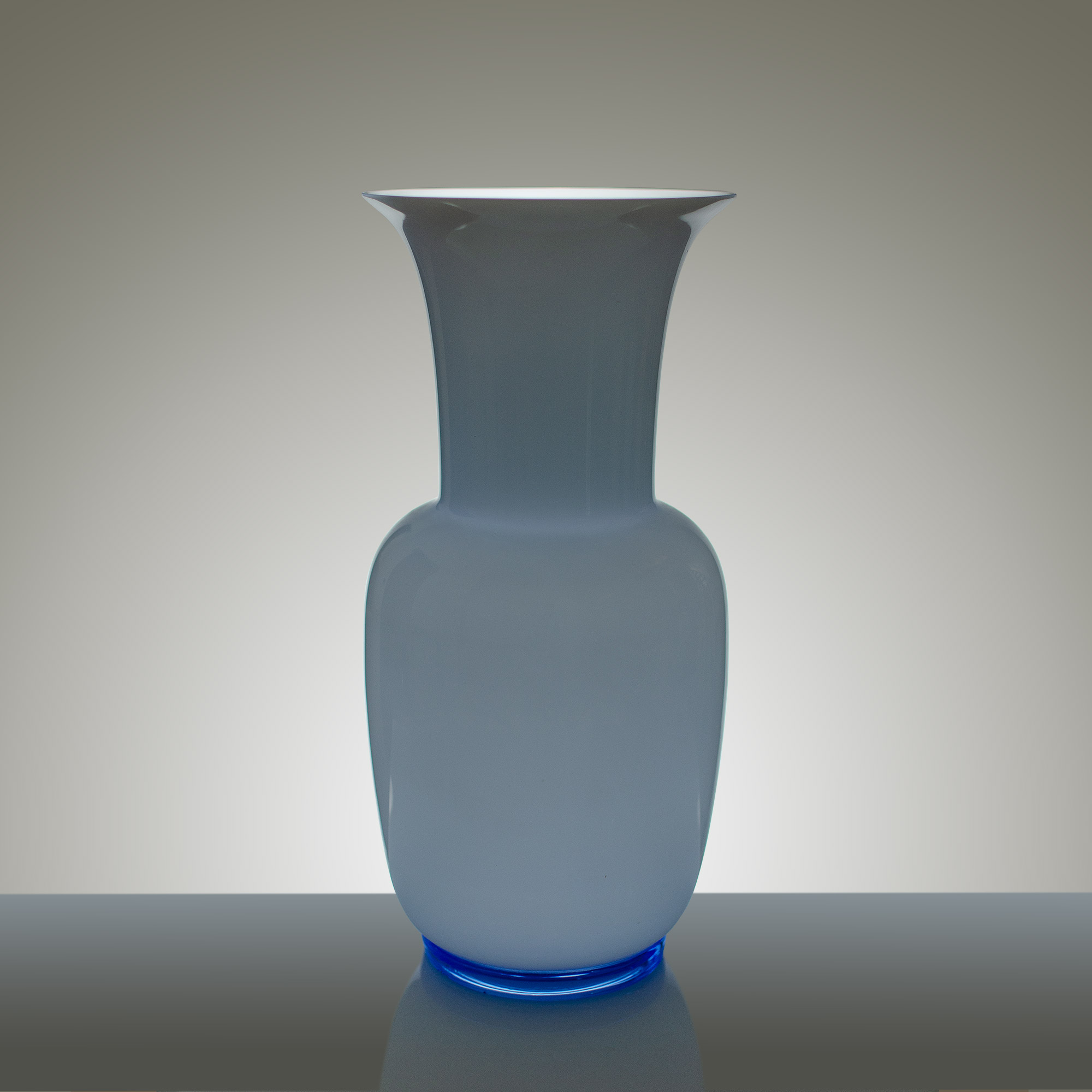 Vaso modello “Opalino” in vetro soffiato opalino nei toni del celeste, 1983; altezza cm 36. Firma incisa: Venini Italia 83