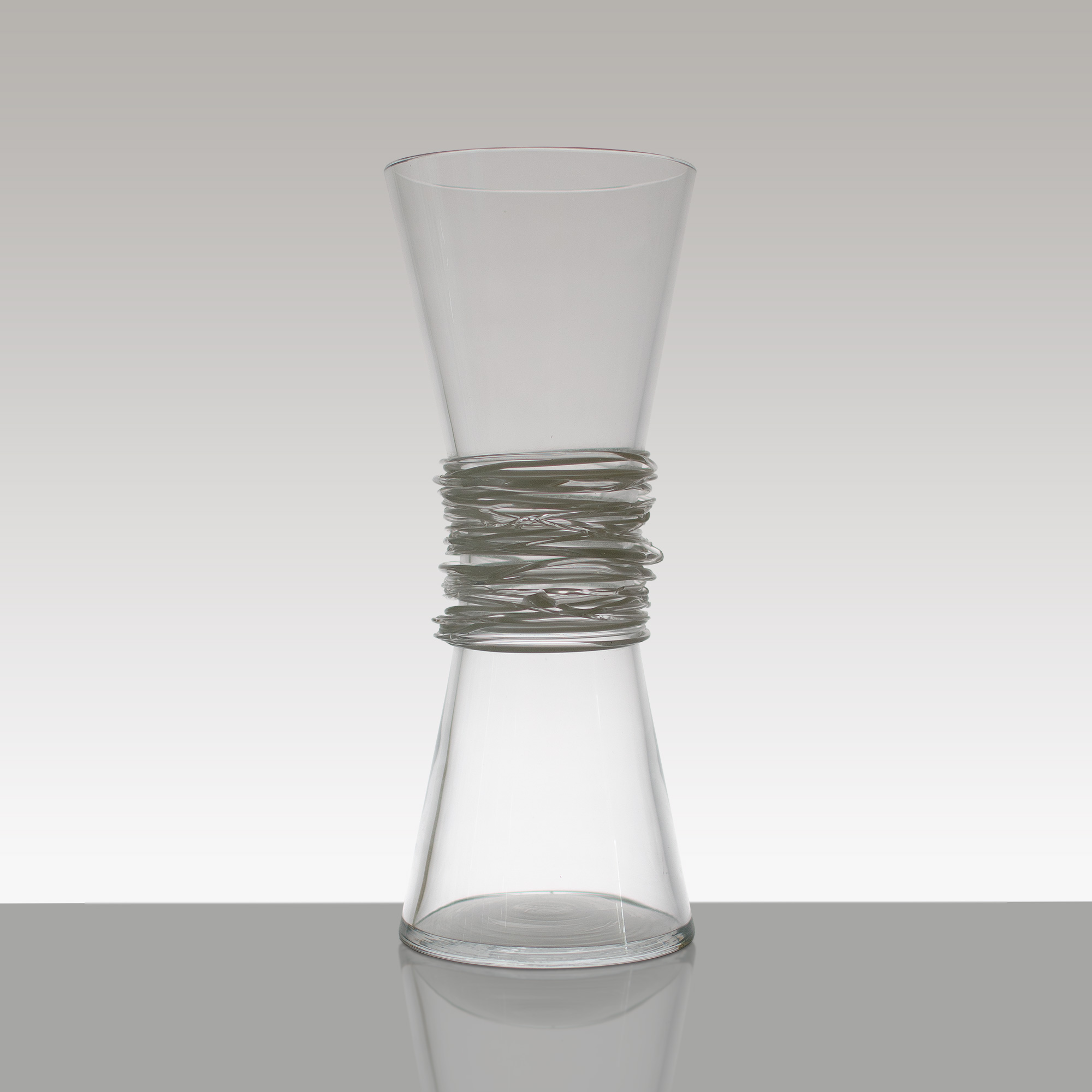 Vaso in vetro con applicazioni in vetro lattimo sulla parte centrale; altezza cm 40, diametro cm 16. Firma incisa: A.V. Mazzega Murano
