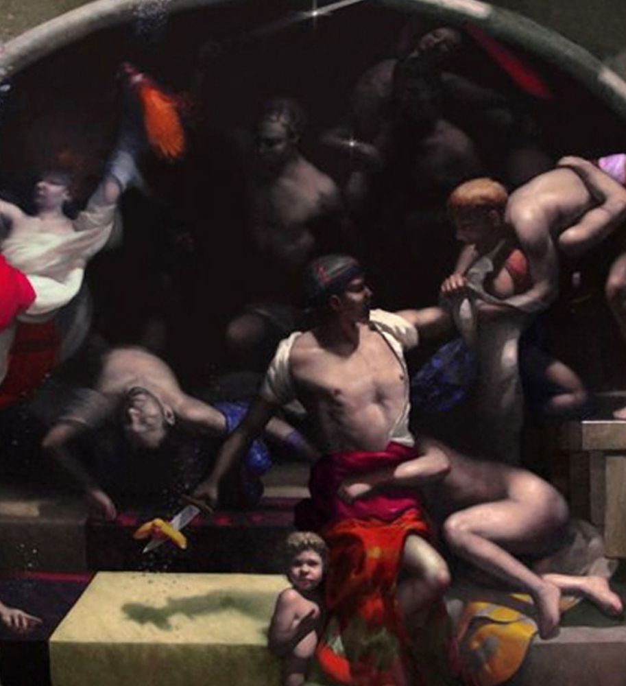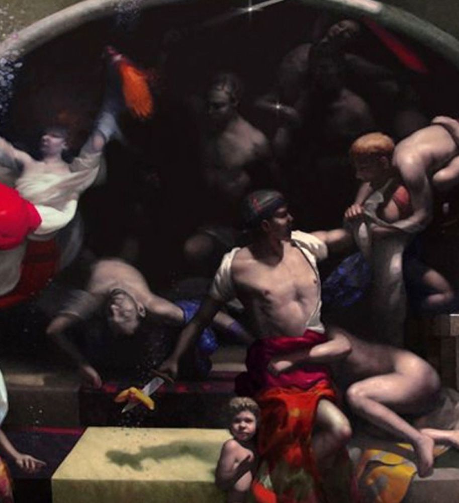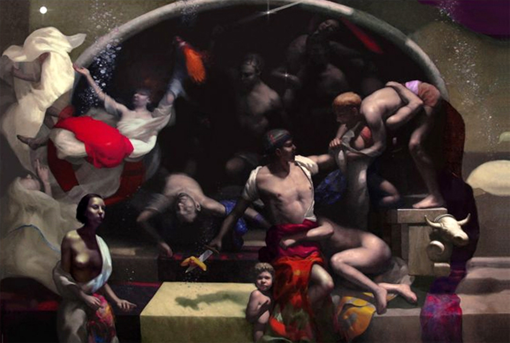 Dipinto olio su tela, scuola italiana raffigurante "Trasformazione" Dimensioni: 220x320 cm. Reca firma Salvatore Testa. Opera in buone condizioni. Molte figure dell'opera sembrano partecipare ad una battaglia. Ma è solo un pretesto dinamico che serve all'artista come contrasto a ciò che l'uccello sulla spada rappresenta, ossia il contrario di una grossolana battaglia. Indica la leggerezza, la libertà. Il titolo "Trasformazione" si riferisce ad un distacco delle reazione automatiche in favore di concetti inesplorati. Il dipinto è sprovvisto di telaio e verrà consegnato arrotolato su base di cartone.