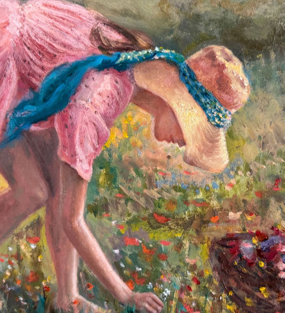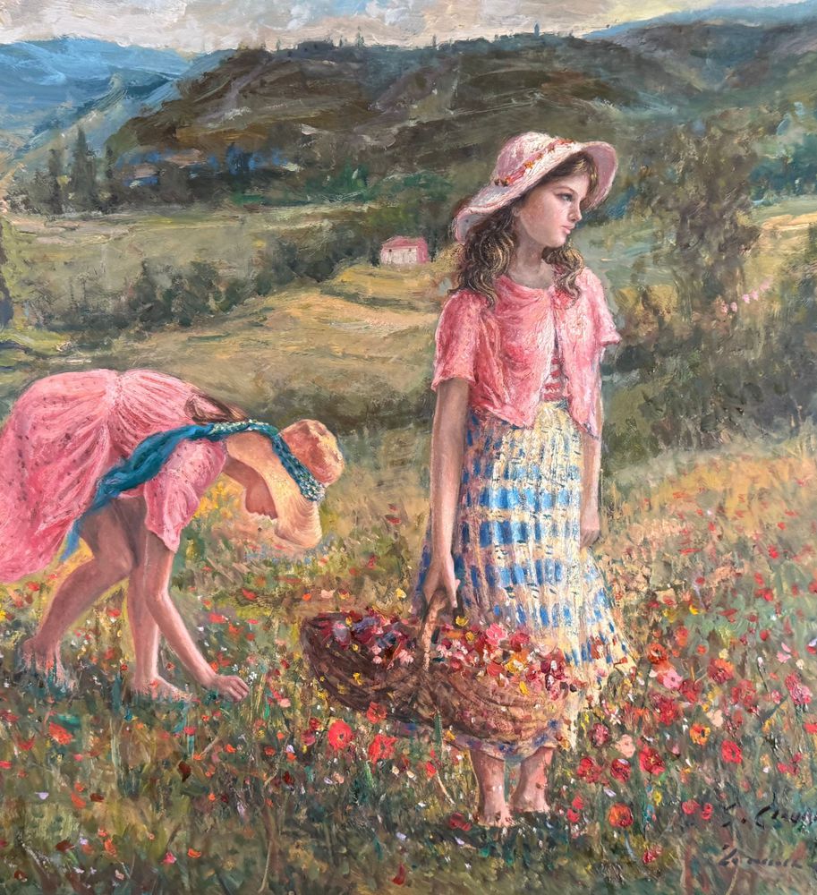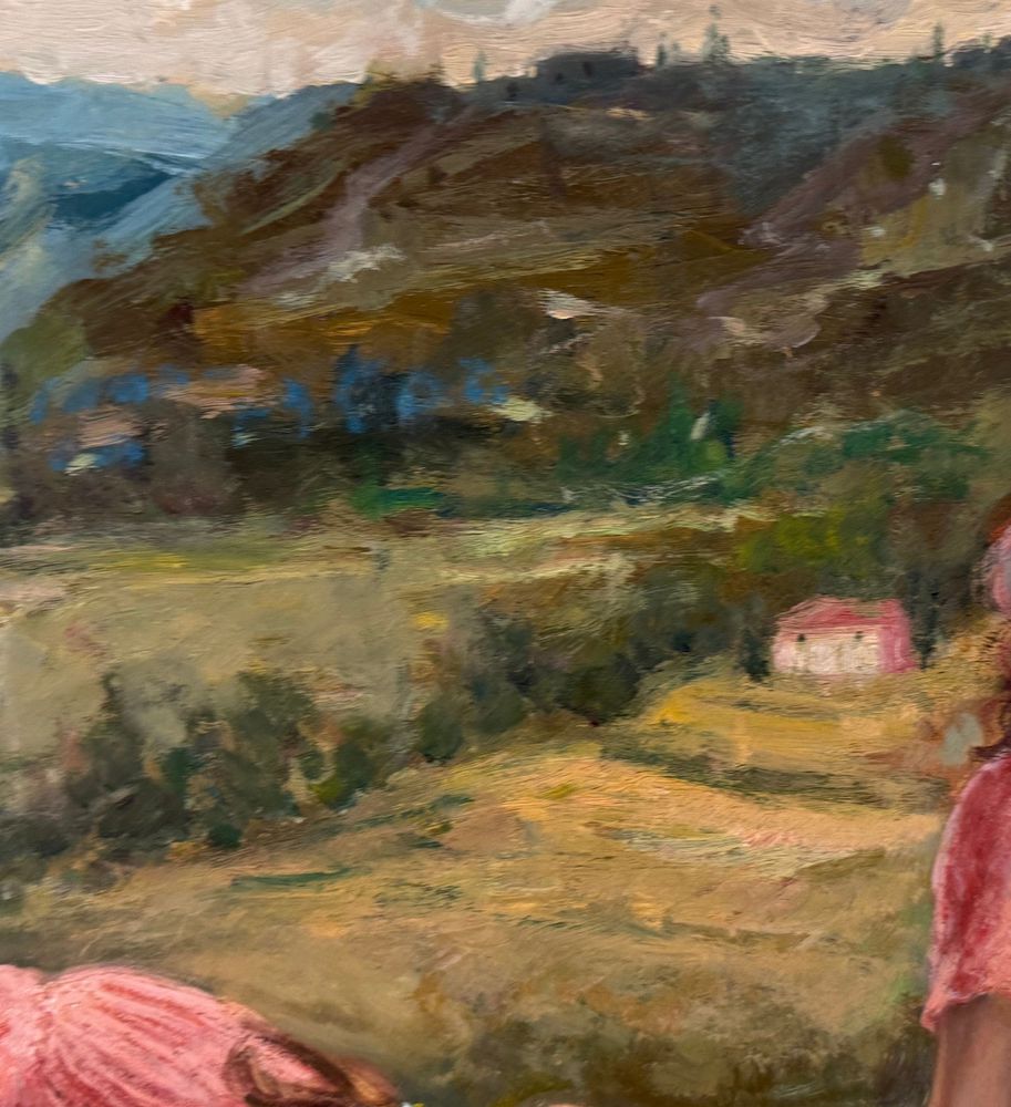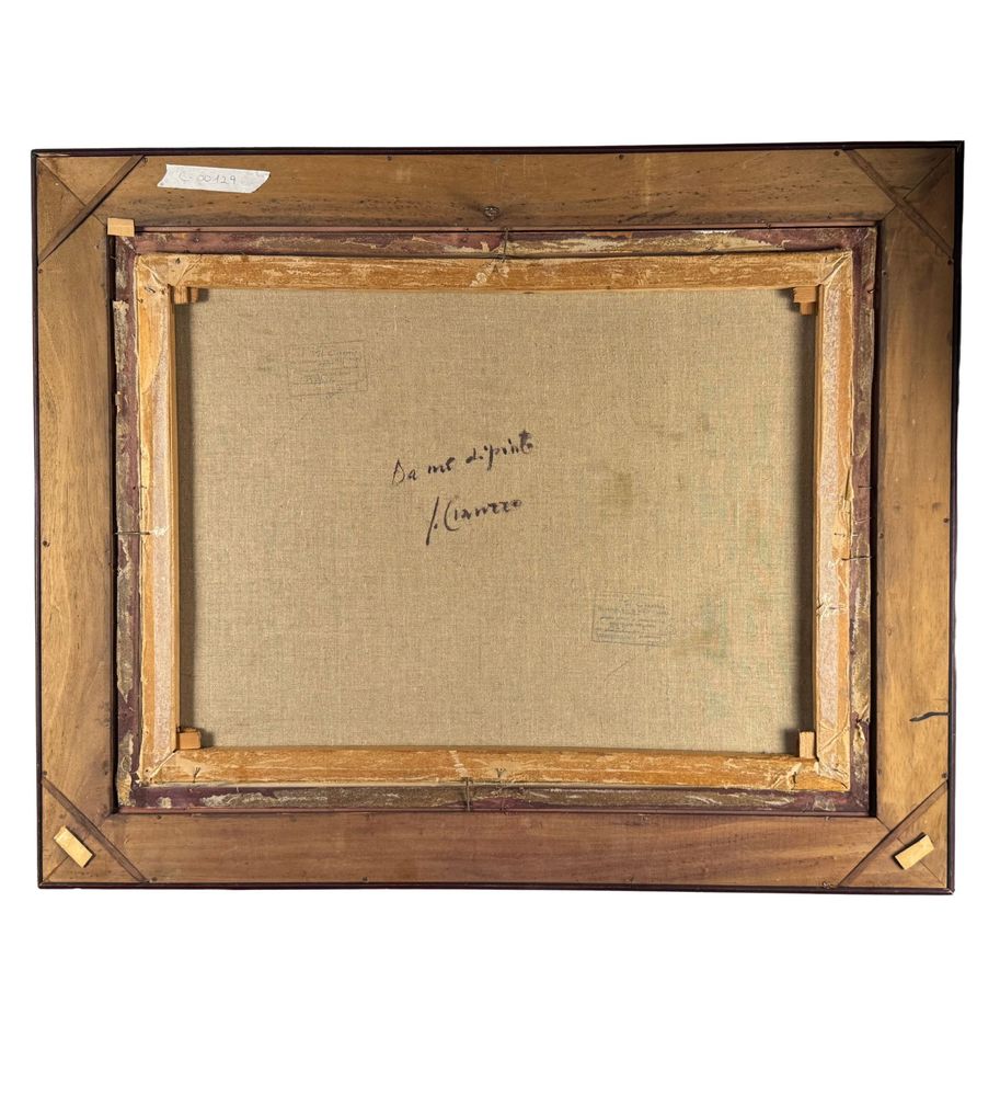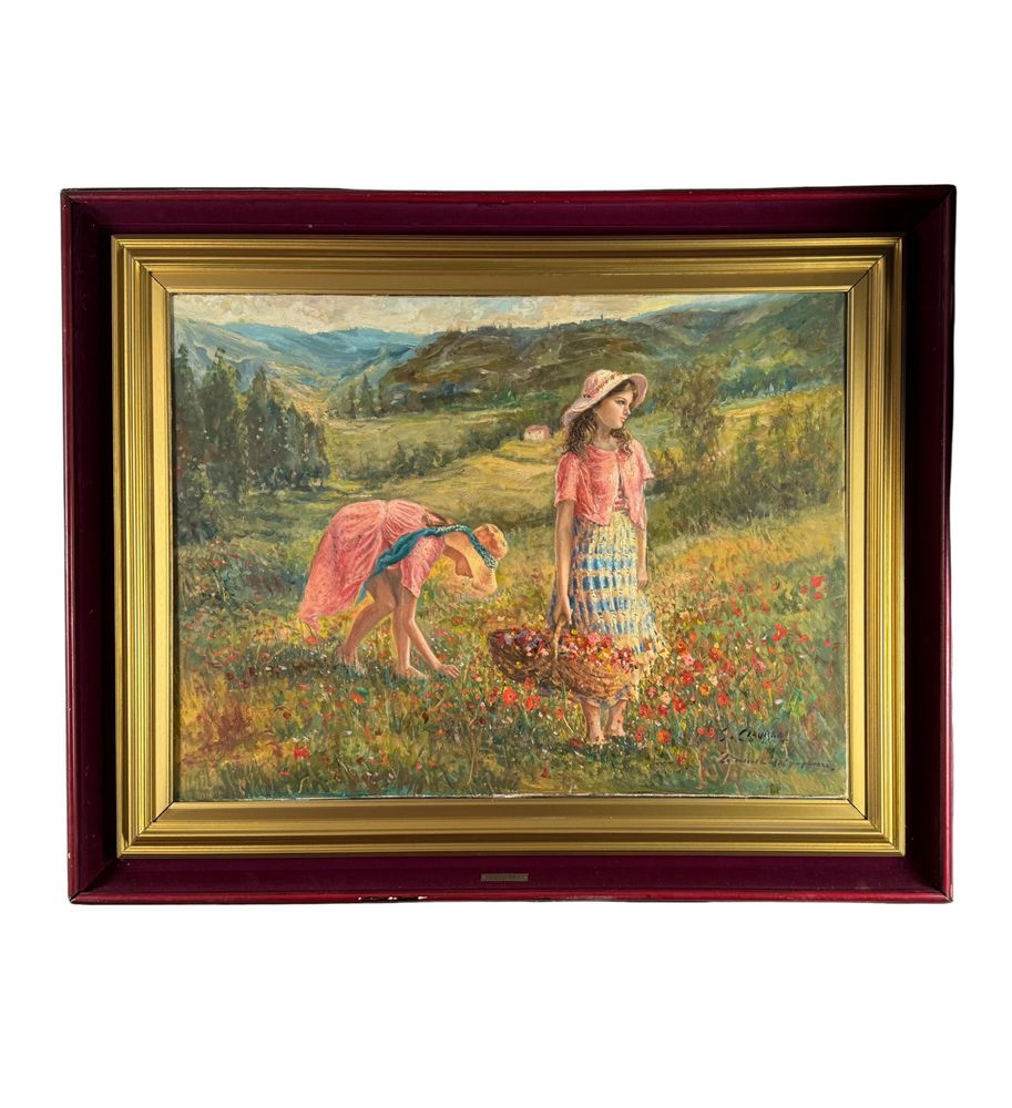 Dipinto olio su tela, periodo XX secolo scuola Italiana raffigurante Due donne nei campi. Dimensioni interno cornice: 80x60 cm. Reca firma in basso a detra e sul retro da S. Ciaurro. Opera in buone condizioni.