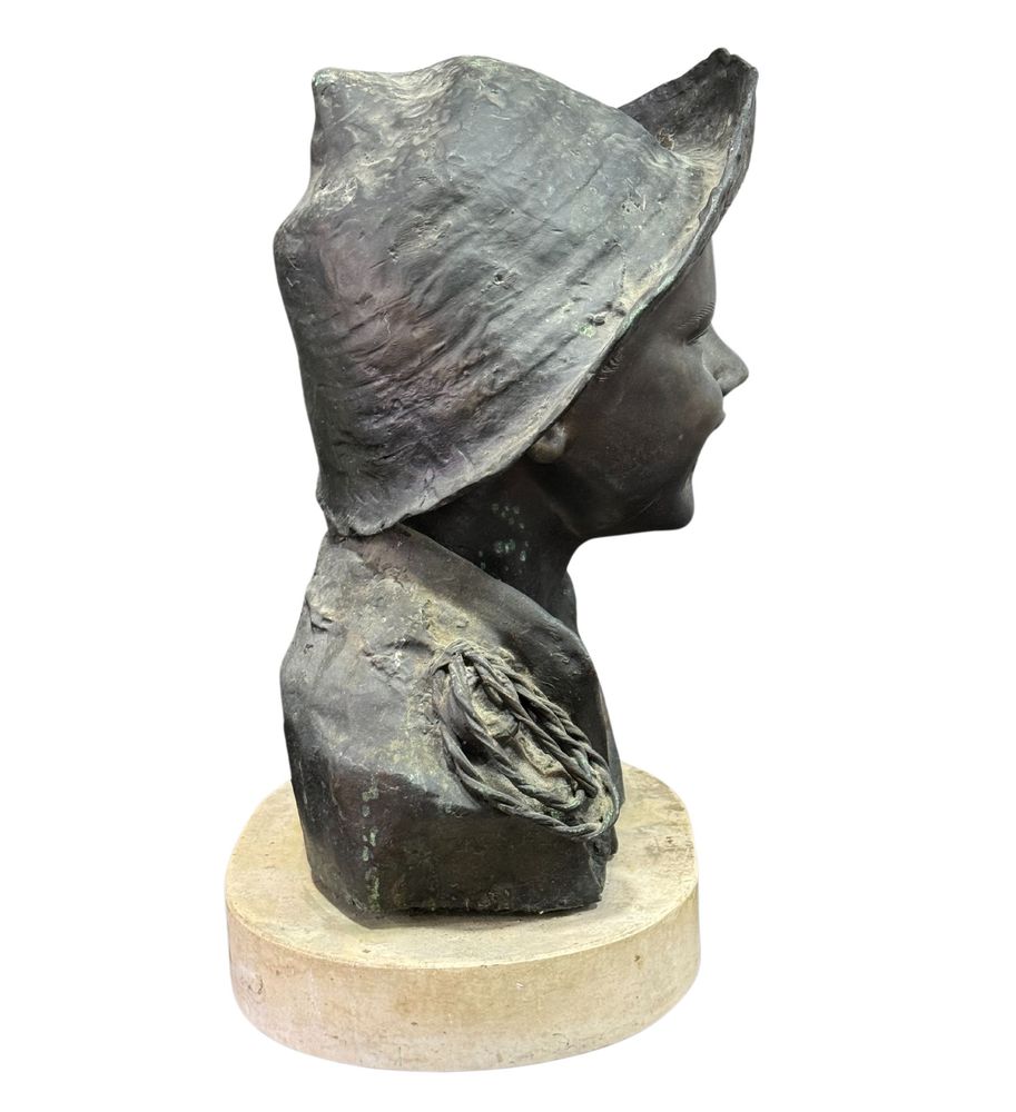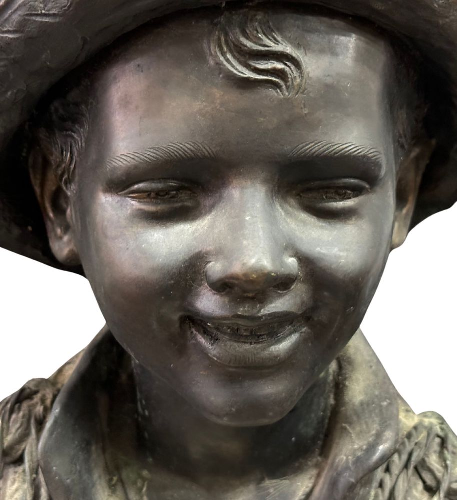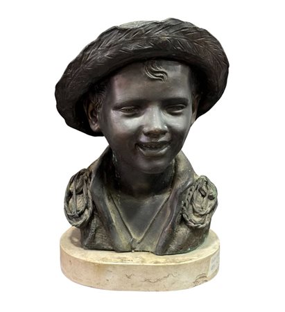 Scultura in bronzo a cera persa su base in marmo, periodo XX secolo, raffigurante Scugnizzo napoletano. Dimensioni: h35x25x19 cm. Scultura in buone condizioni. Reca firma De Martino.