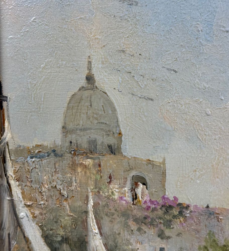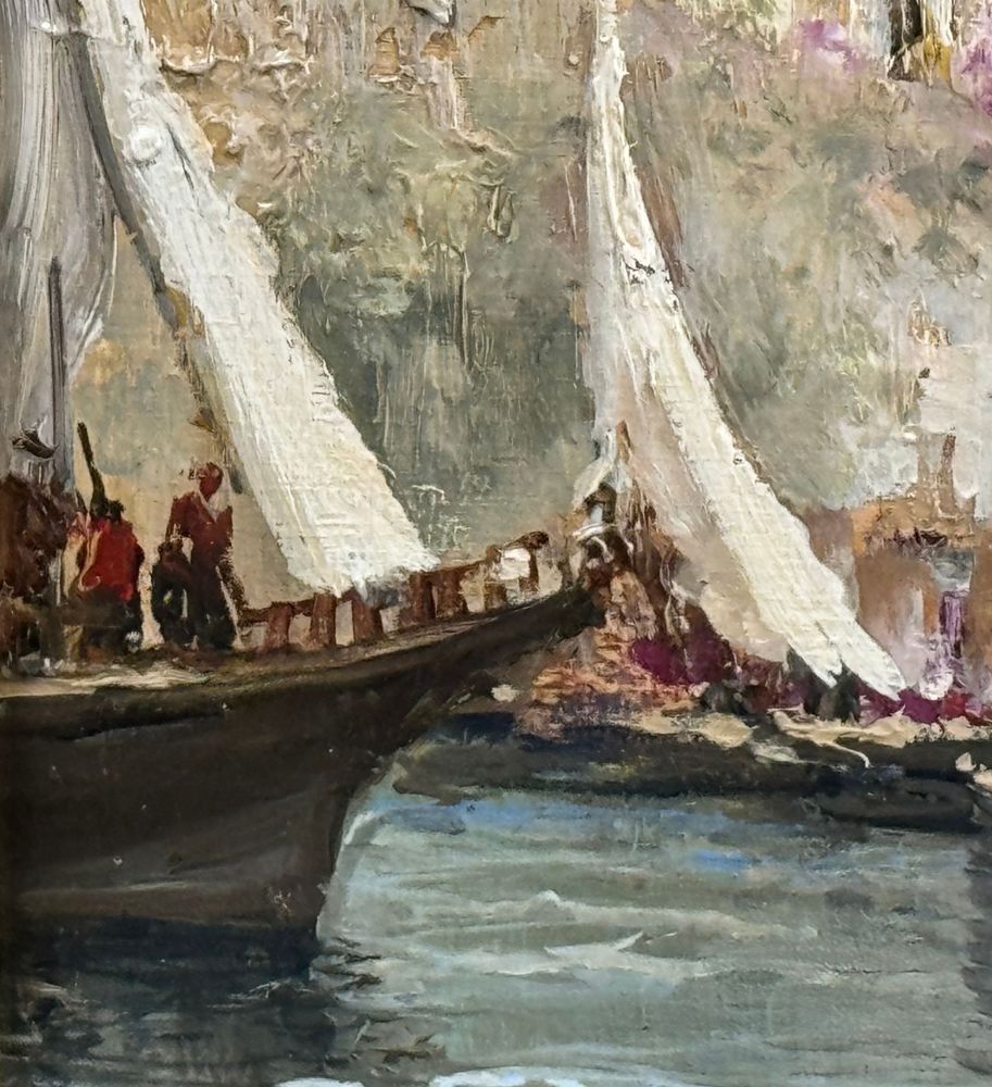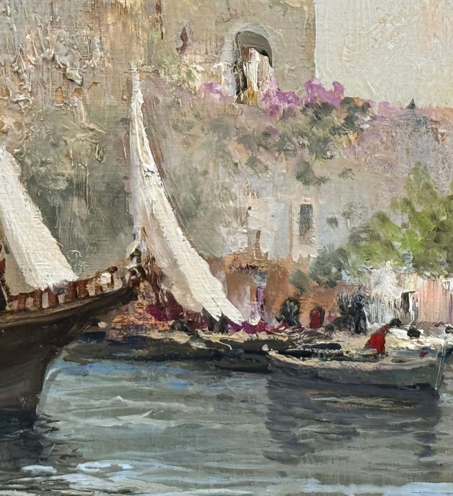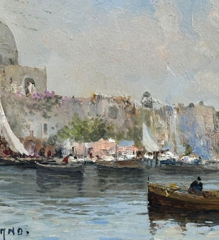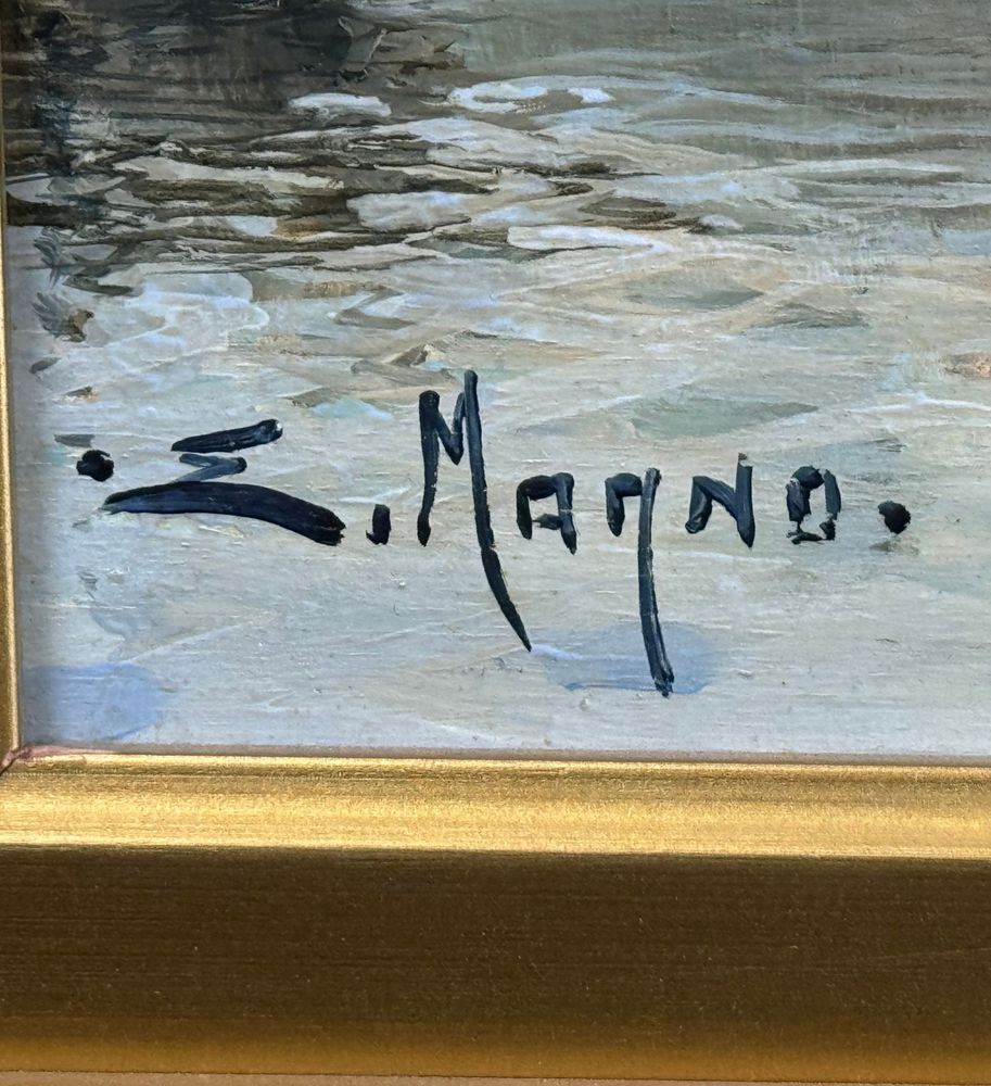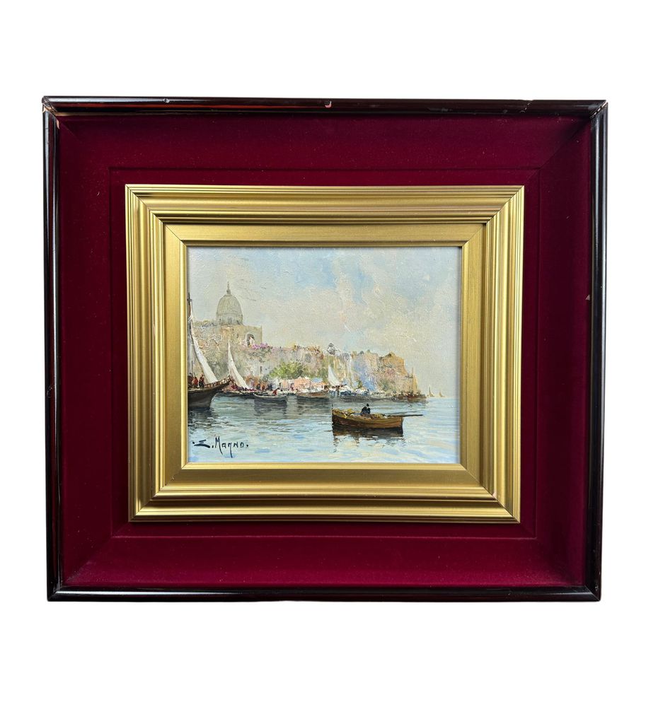 Dipinto olio su tavola, periodo XX secolo scuola italiana, raffigurante Marina partenopea. Dimensioni compreso cornice: 59x53 cm. Dimensioni interno cornice: 30x25 cm. Reca firma in basso a sinistra e timbro autentica sul retro da Eugenio Magno (Napoli 1944). Opera in buone condizioni.