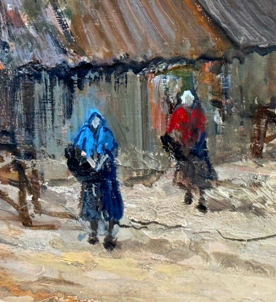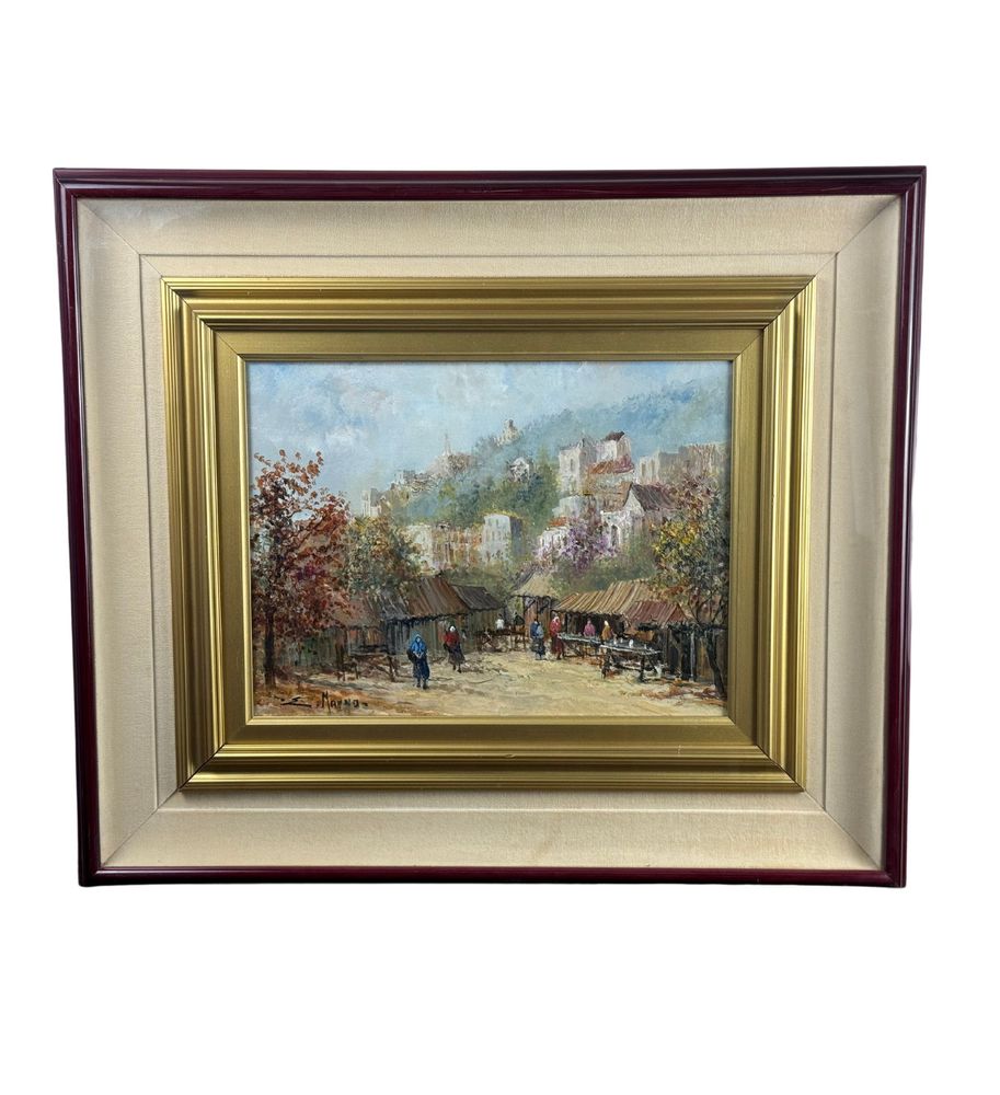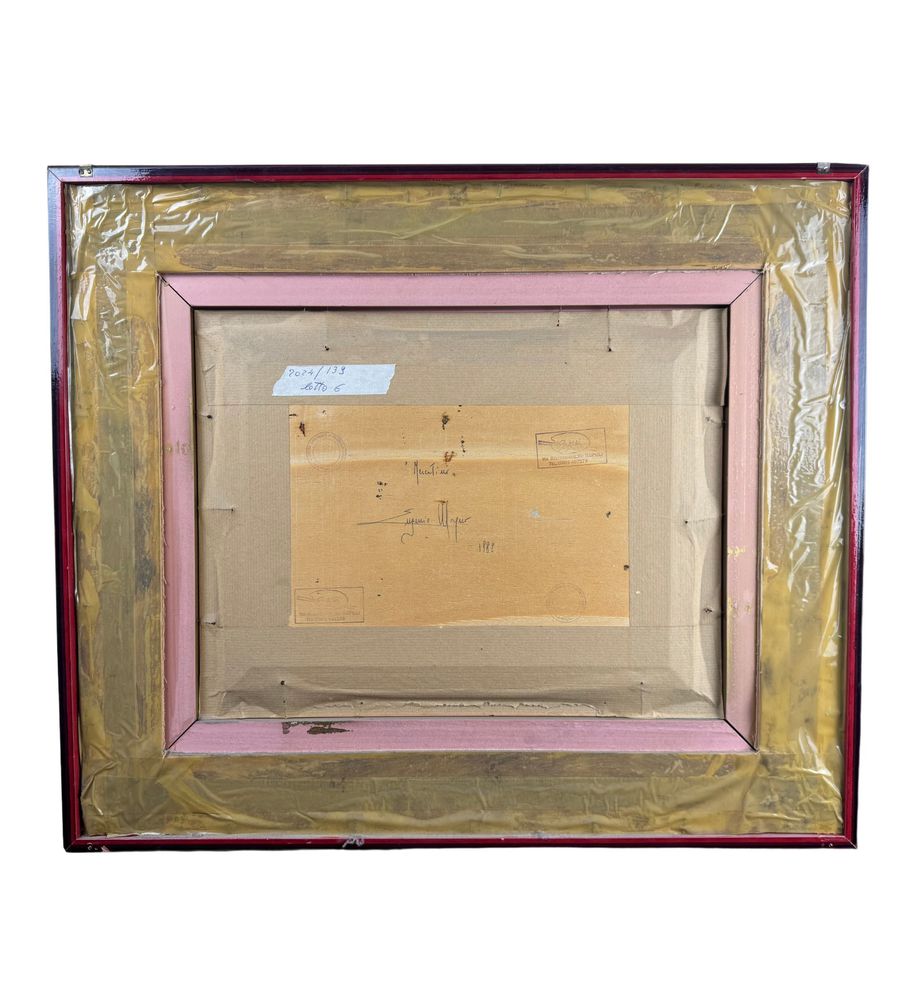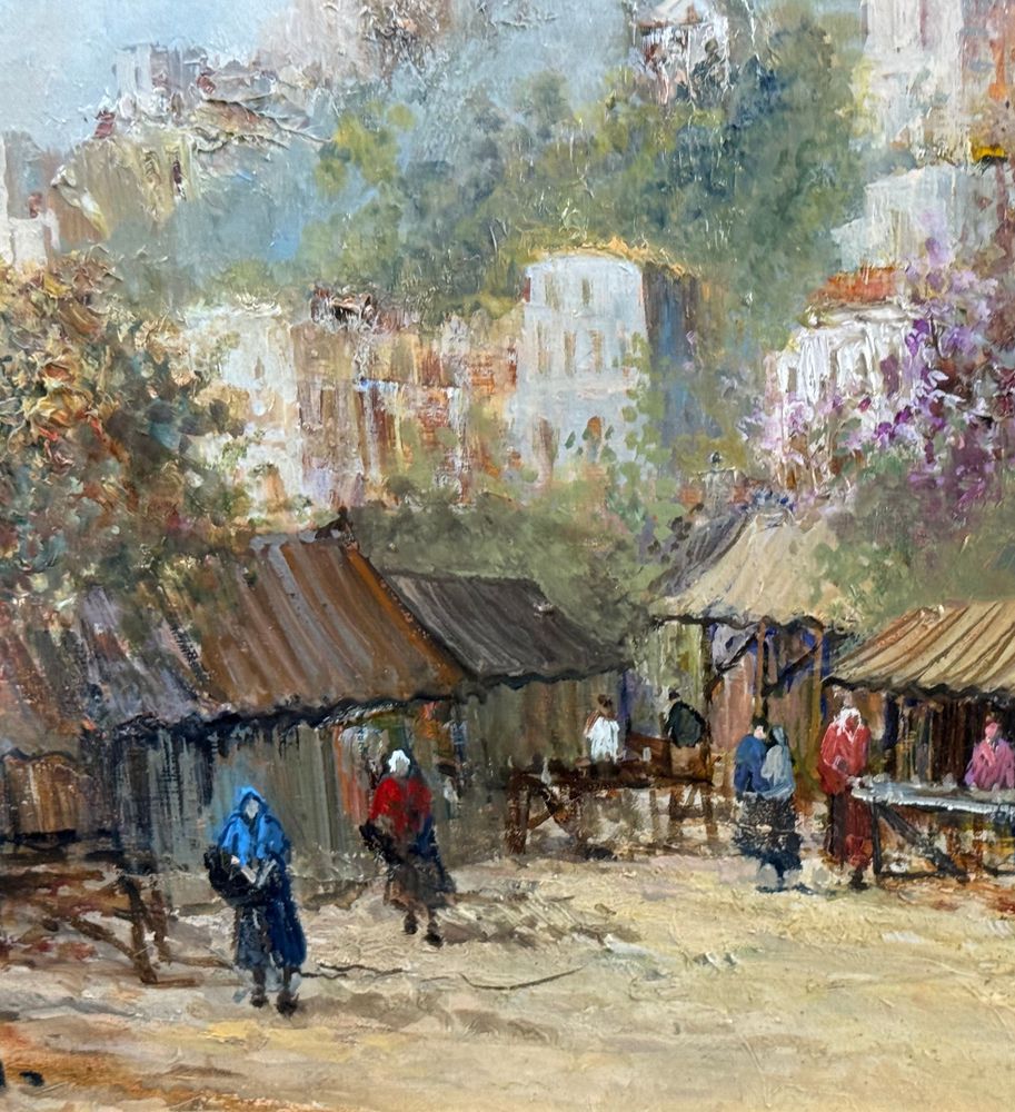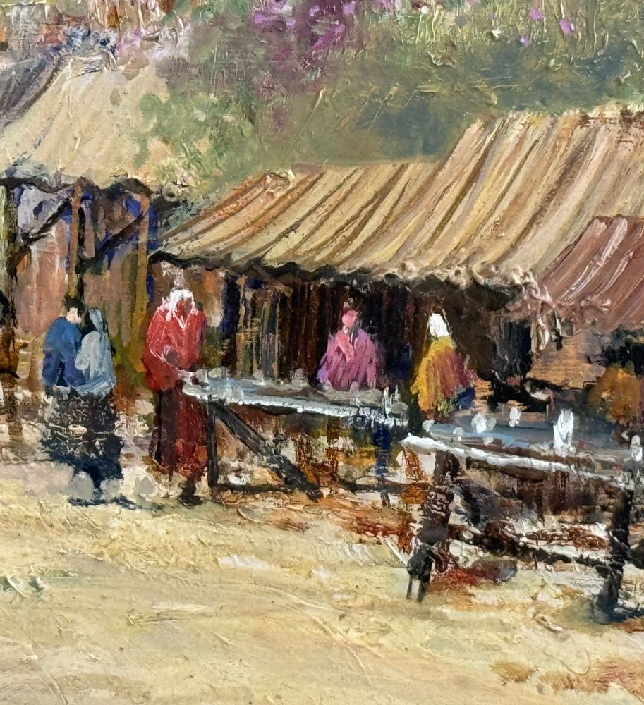 Dipinto olio su tavola, periodo XX secolo scuola italiana, raffigurante Mercatino. Dimensioni compreso cornice: 69x59 cm. Dimensioni interno cornice: 30x40 cm. Reca firma in basso a sinistra timbro e autentica sul retro da Eugenio Magno (1944). Opera in buone condizioni.
