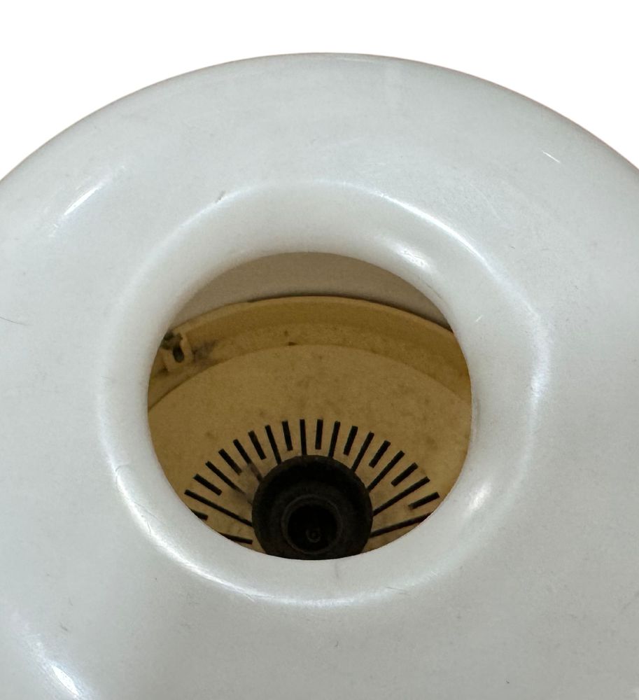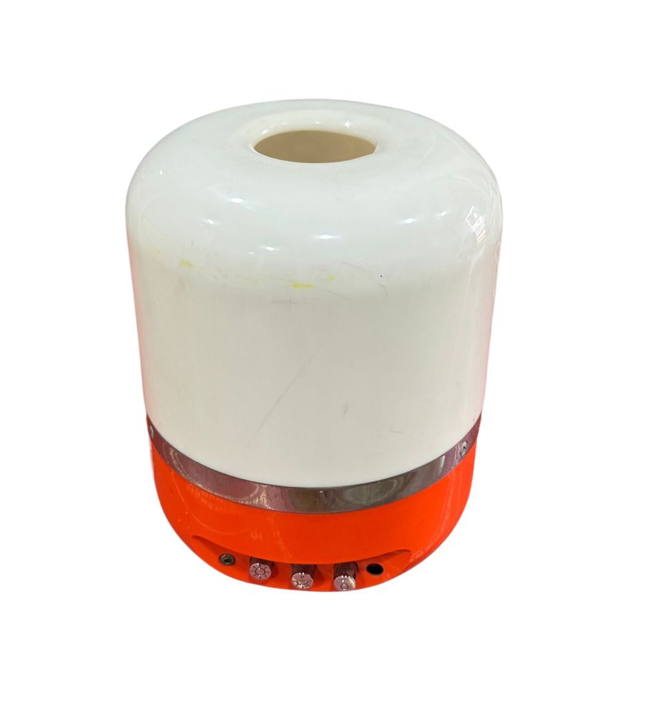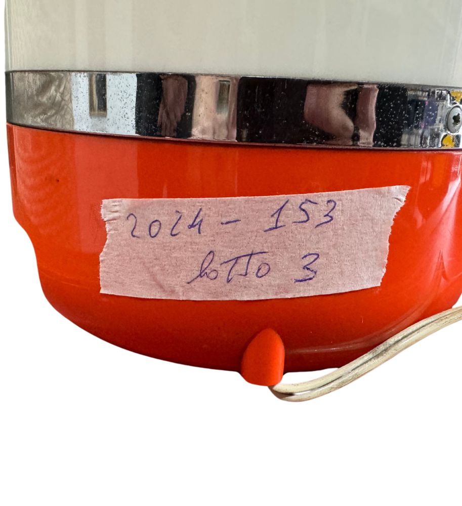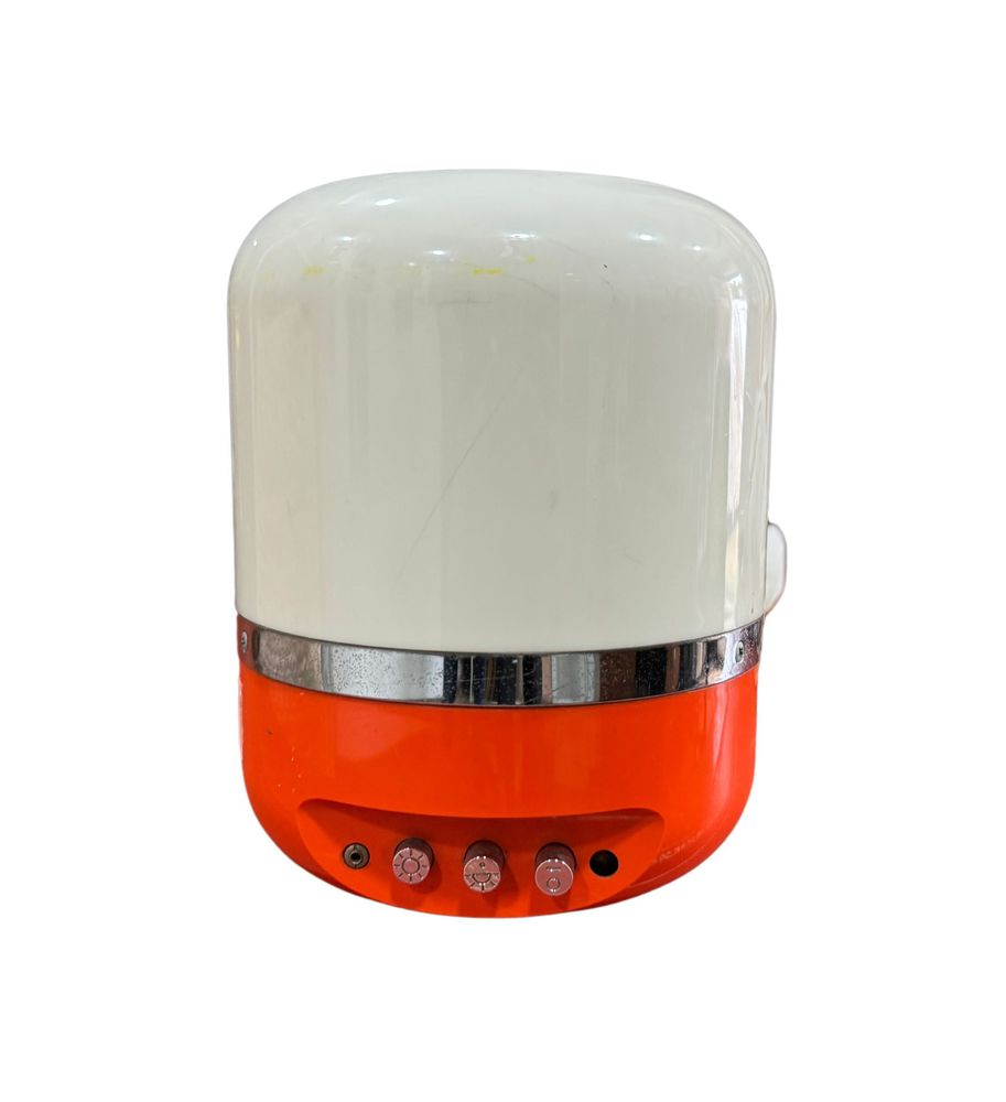 Lampada da tavolo anni 70, colore arancione, in buone condizioni, due pulsanti per due intensità di luce. Il terzo pulsante attiva la radio (l'altoparlante è all'interno del paralume). Sul retro è dotato di due ruote, una per il canale radio e una per il volume radio. Realizzato in ABS arancione e plexiglass opalino. Dimensioni: 22x17 cm.