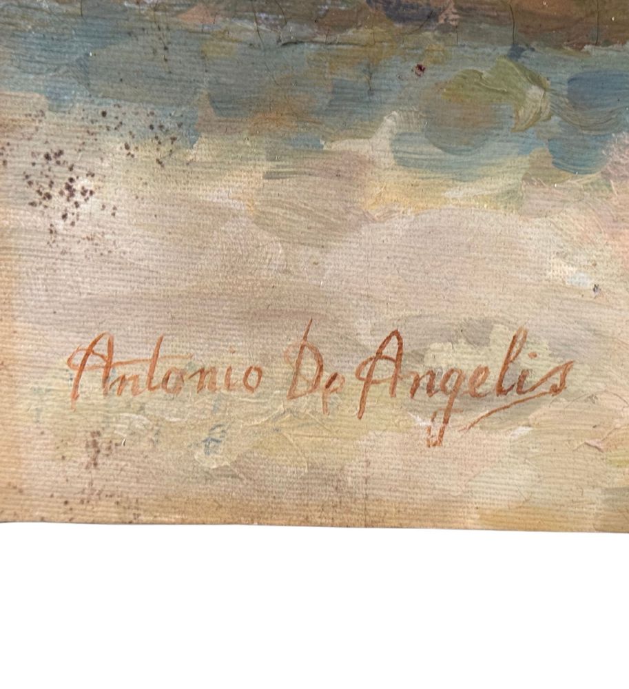 Dipinto olio su tela, periodo XX secolo scuola Italiana, raffigurante Paesaggio con donna in lettura. Dimensioni: 70x50 cm. Reca firma in basso a sinistra da Antonio De Angelis. Opera in buone condizioni.