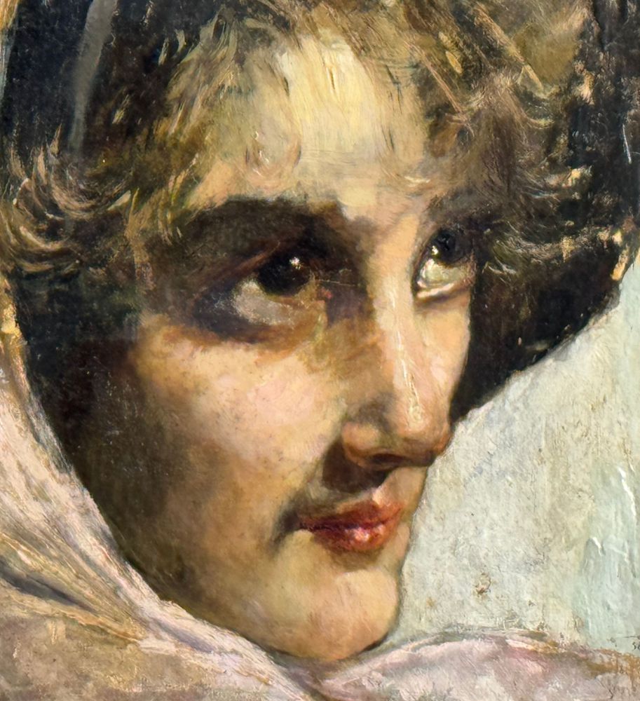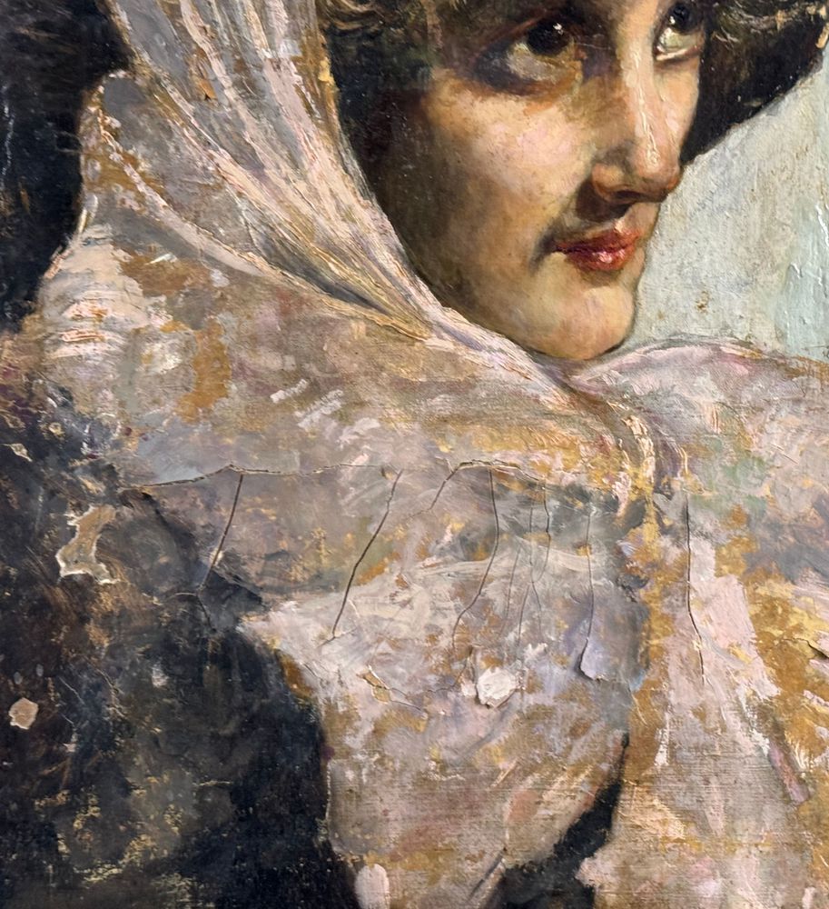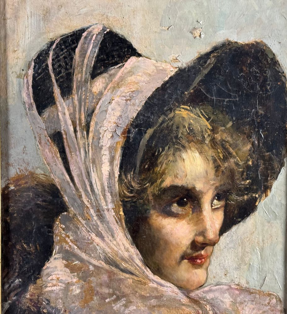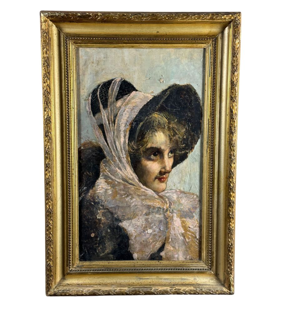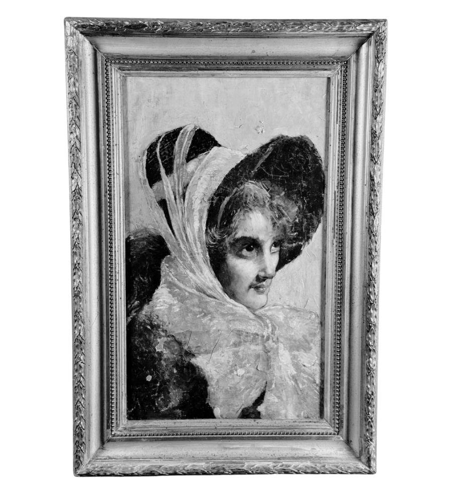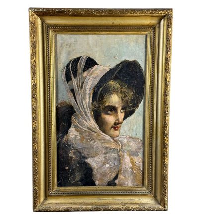 Dipinto olio su tela, periodo XIX/XX secolo scuola Napoletana, raffigurante Elegante donna con cappello. Dimensioni compreso cornice: 51x74 cm. Dimensioni interno cornice: 35x59 cm. Da artista anonimo. Opera in discrete condizioni con sparse cadute di colore.