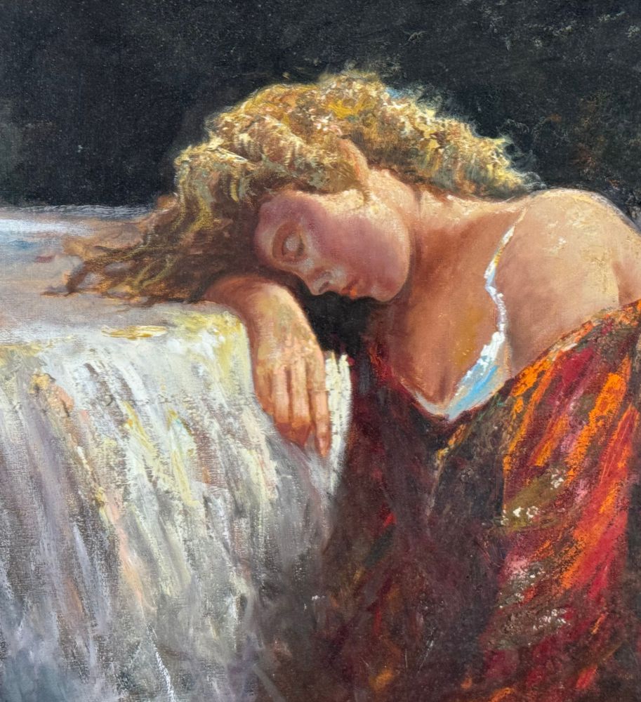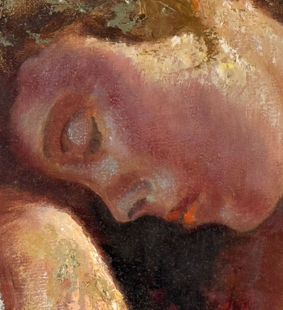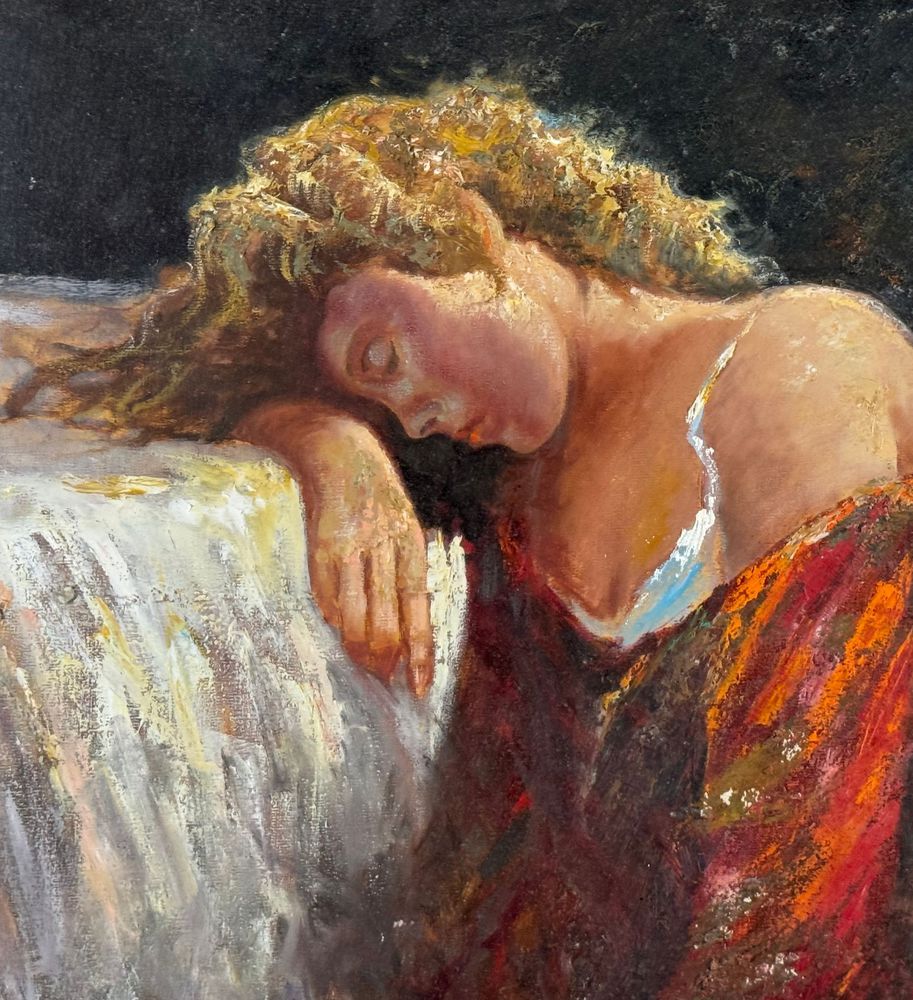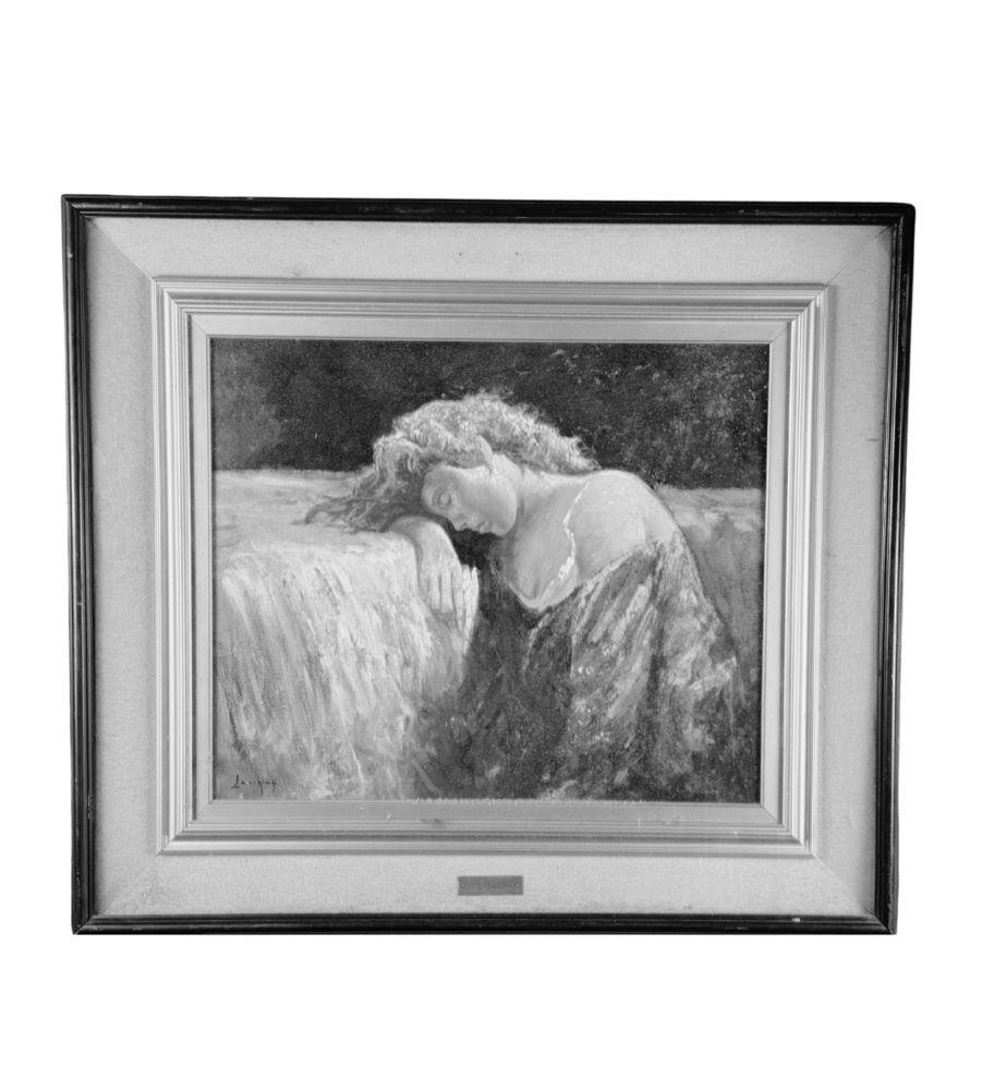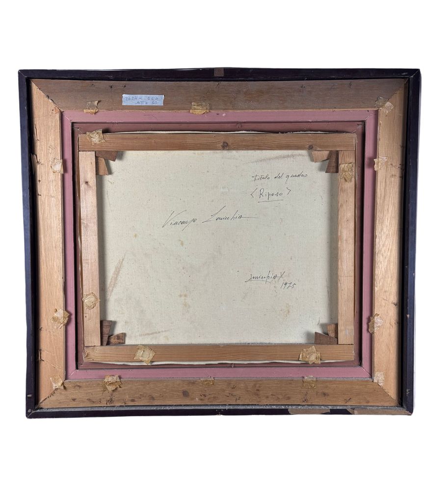 Dipinto olio su tela, periodo XX secolo scuola Italiana, raffigurante "Il Riposo". Dimensioni compreso cornice: 86x76 cm. Dimensioni interno cornice: 60x50 cm. Reca firma in basso a sinistra e autentica sul retro da Vincenzo Laricchia. Opera in buone condizioni.