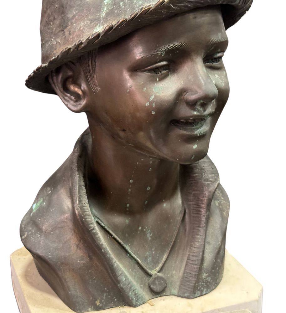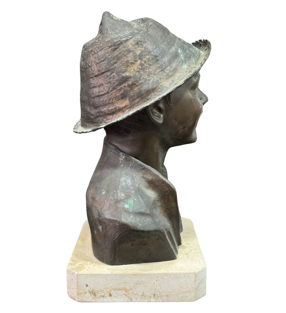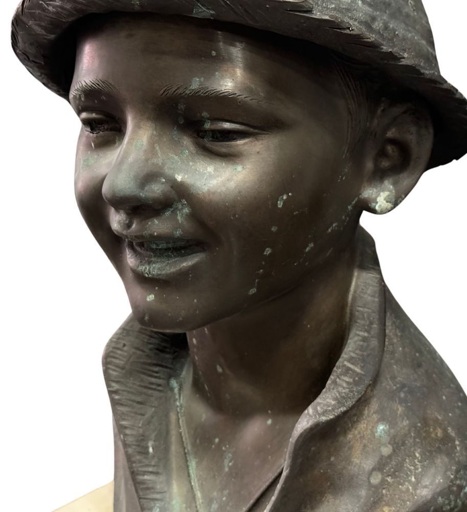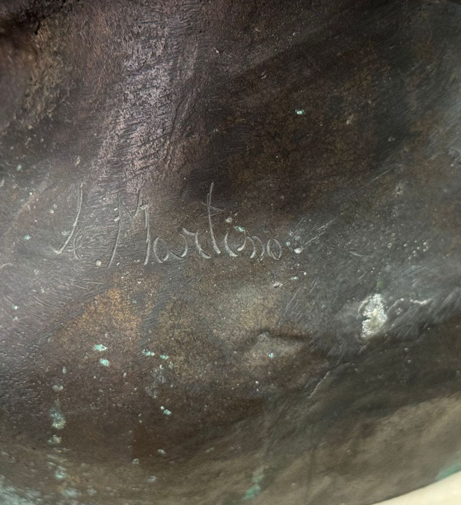 Scultura in bronzo a cera persa su base in marmo, periodo XX secolo, raffigurante Scugnizzo napoletano. Dimensioni: h38x22x18 cm. Scultura in buone condizioni. Reca firma De Martino.