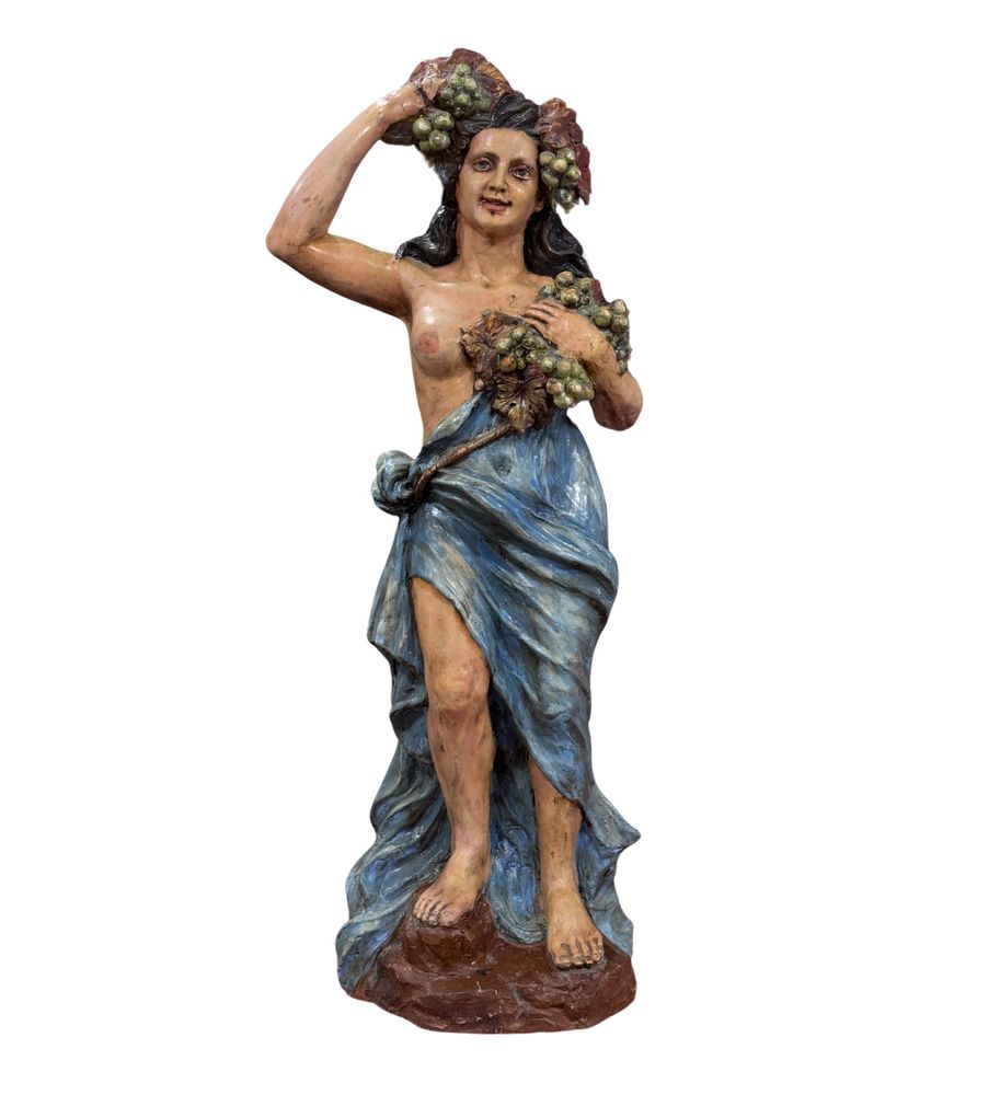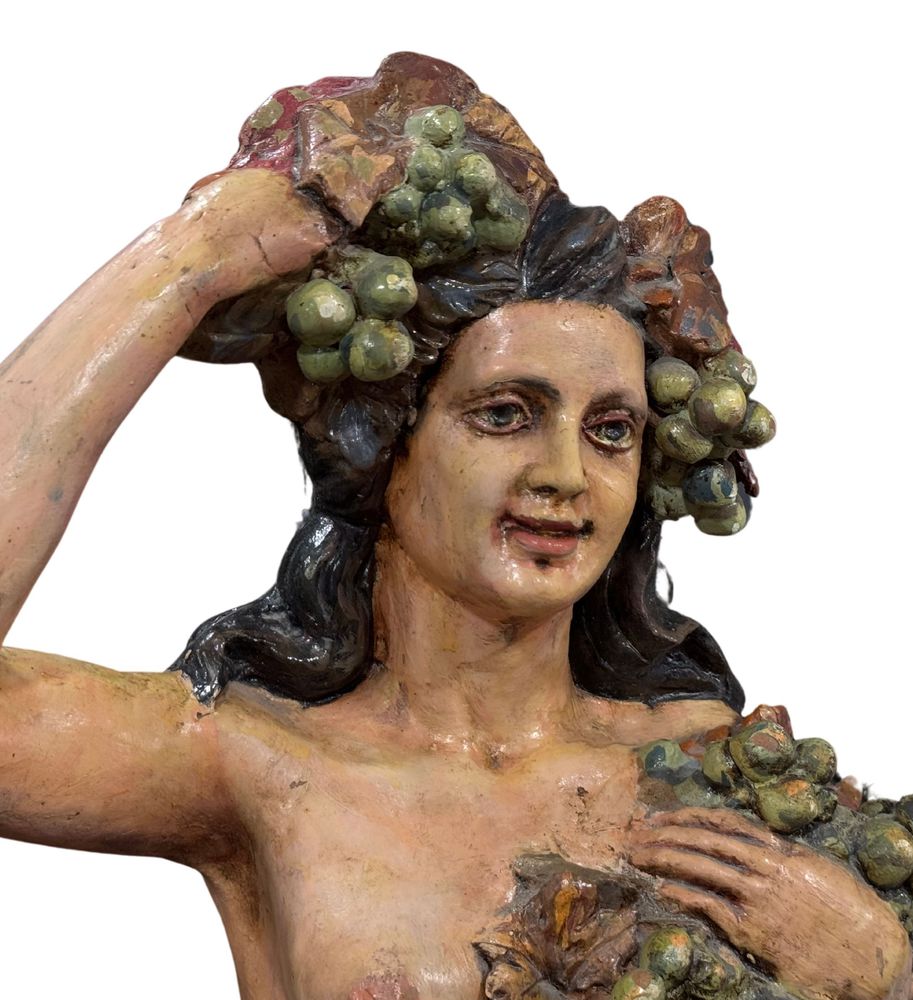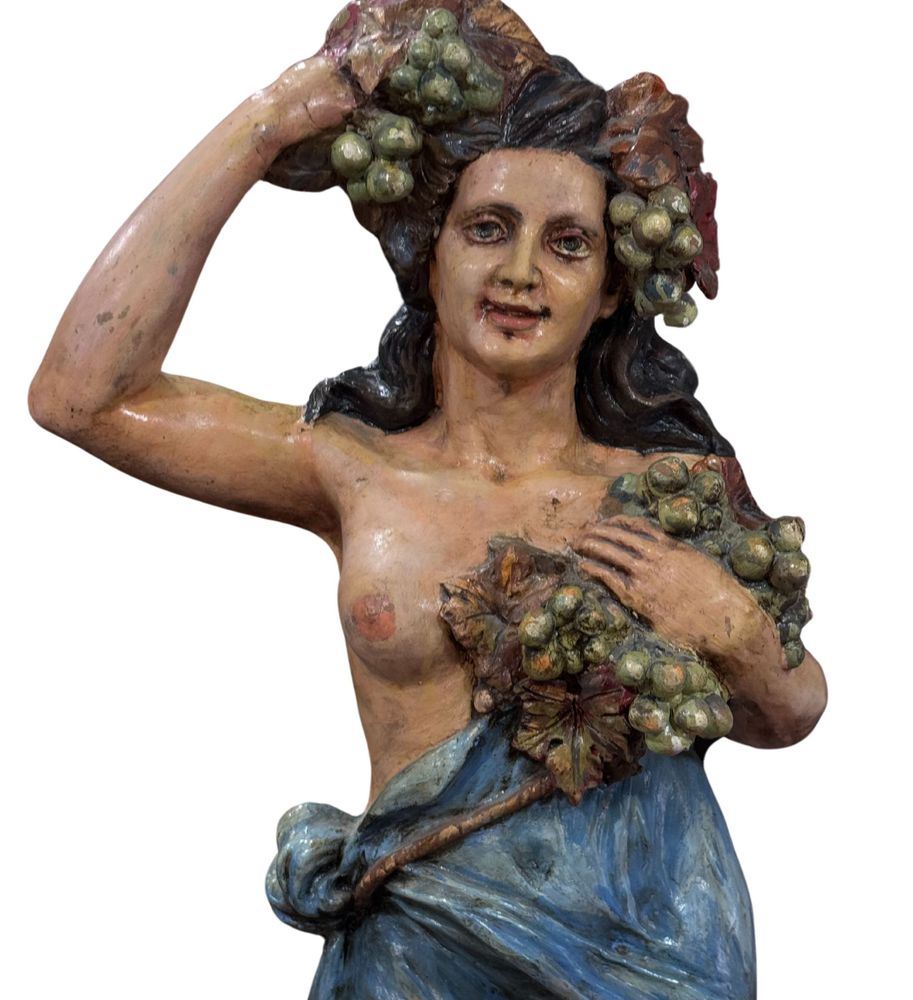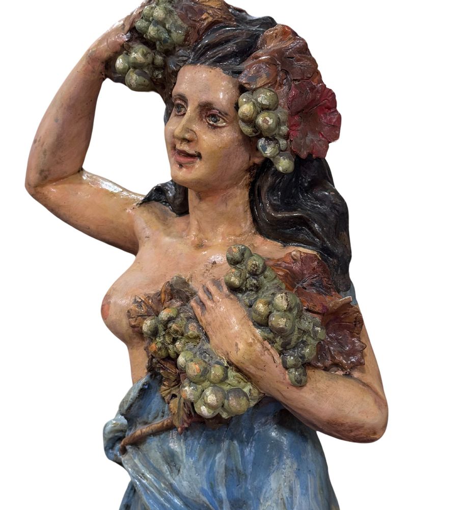 Scultura in terracotta, periodo XIX/XX secolo raffigurante Allegoria dell'uva. Dimensioni: h90x35x25 cm. Scultura in buone condizioni con lievi segni di vissuto come da foto allegate.