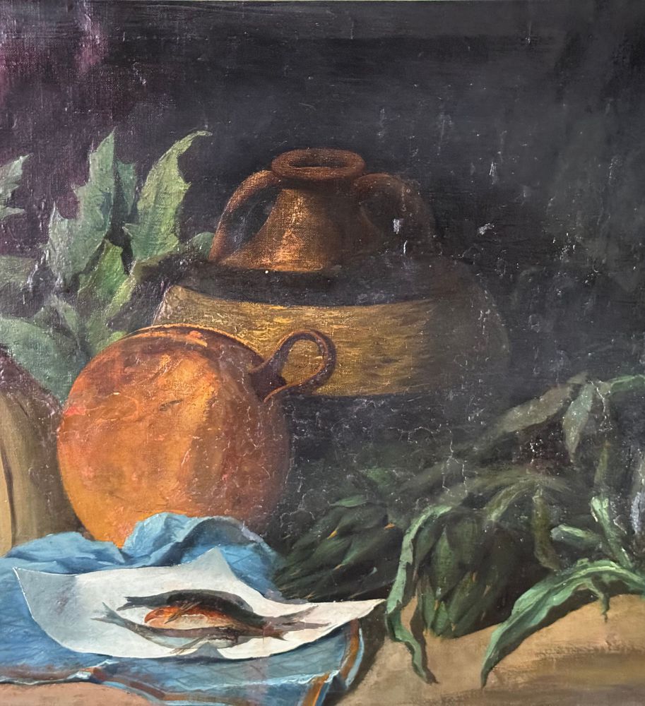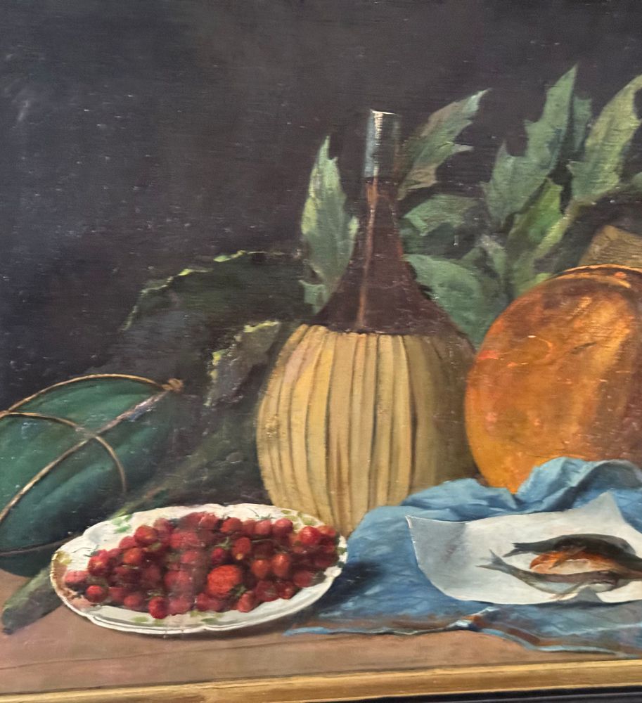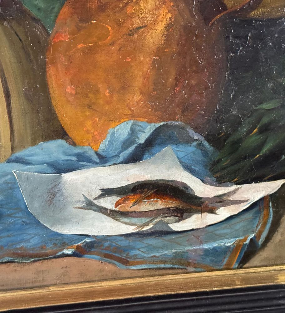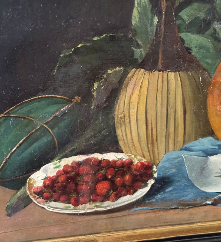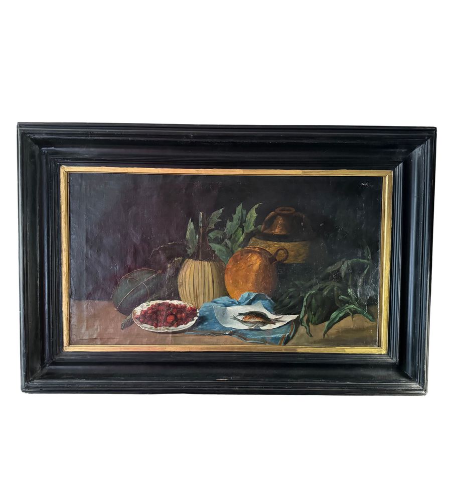 Dipinto olio su tela, periodo XIX secolo scuola italiana, raffigurante Natura morta. Dimensioni compreso cornice: 74x112 cm. Dimensioni interno cornice: 50x83 cm. Da artista anonimo. Opera in buone condizioni con lievi segni di vissuto come da foto allegate.