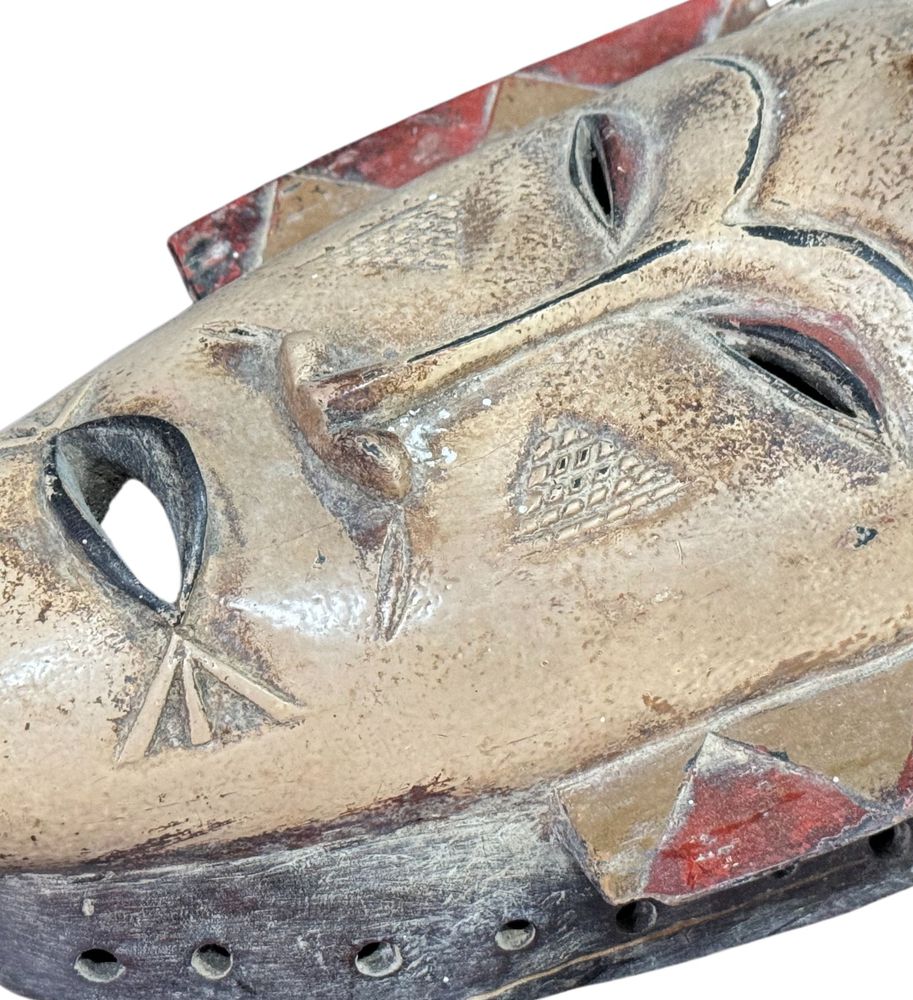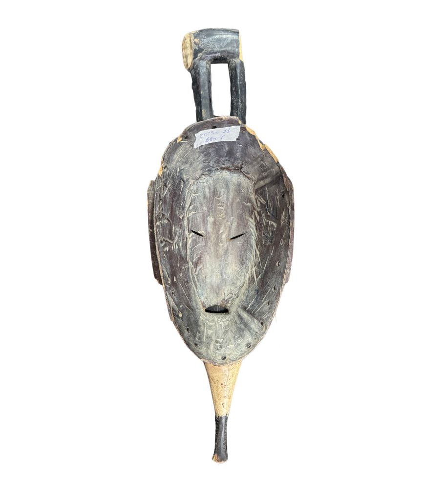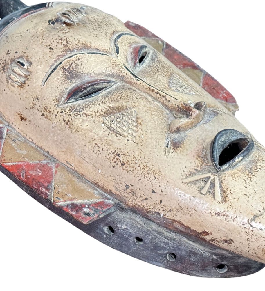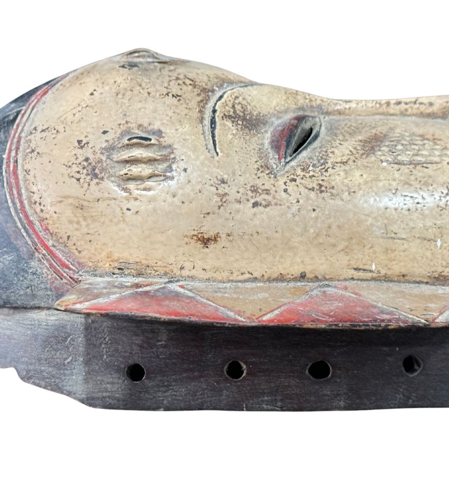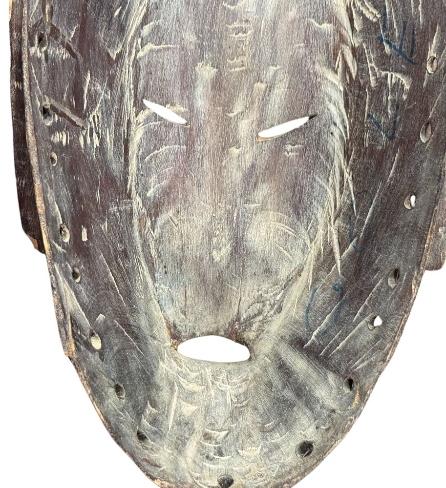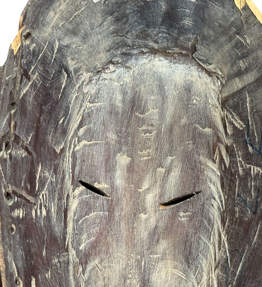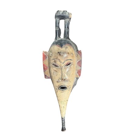 Maschera in legno, periodo XX secolo, raffigurante Maschera orientale. Dimensioni:: h59x21x7. Maschera in buone condizioni con lievi segni di vissuto e mancanze come da foto allegate.
