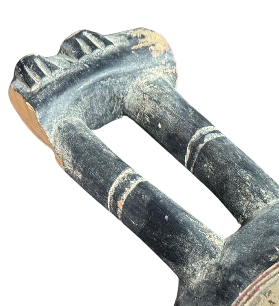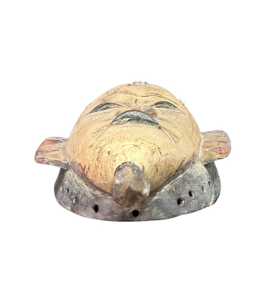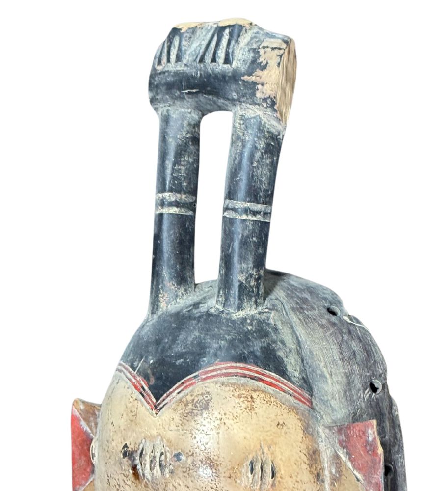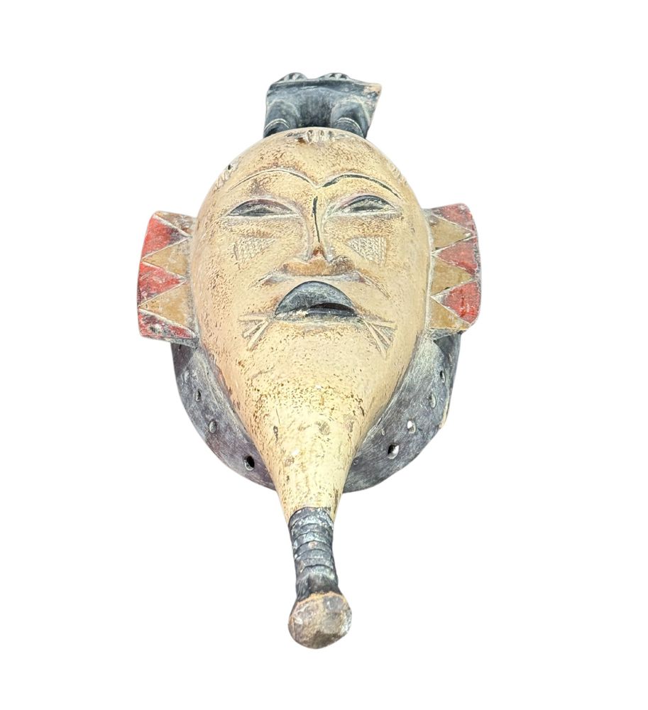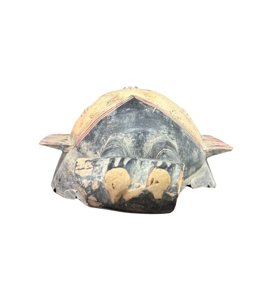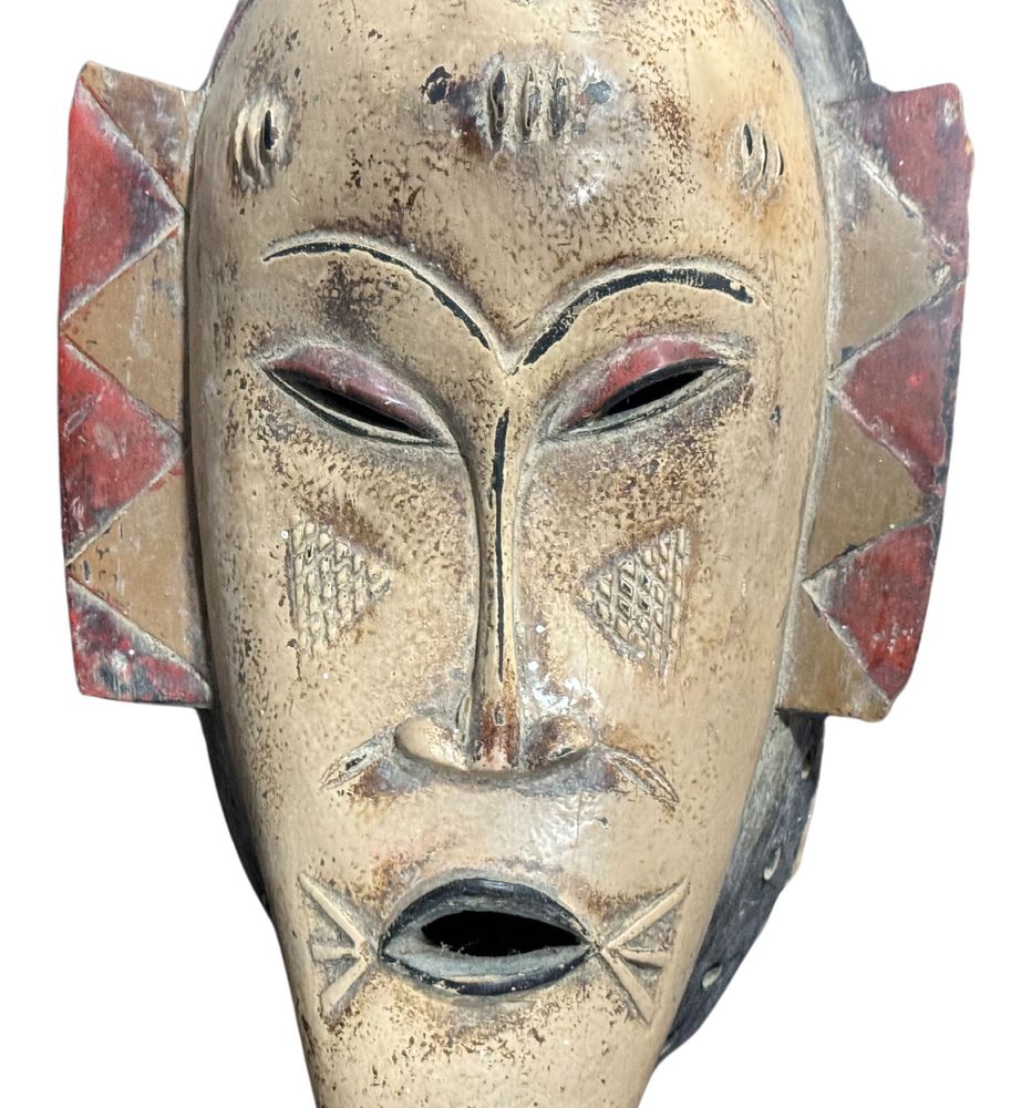 Maschera in legno, periodo XX secolo, raffigurante Maschera orientale. Dimensioni:: h59x21x7. Maschera in buone condizioni con lievi segni di vissuto e mancanze come da foto allegate.