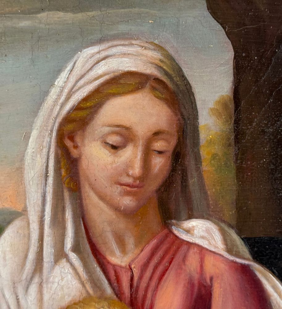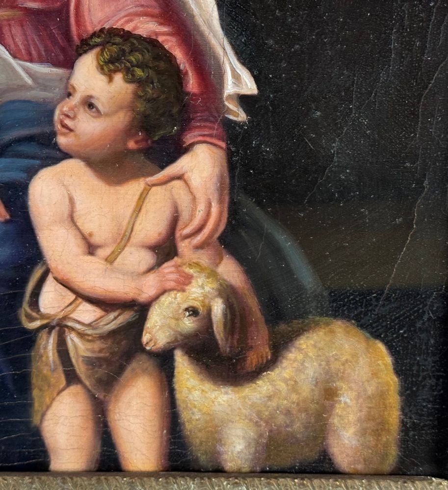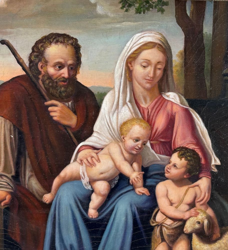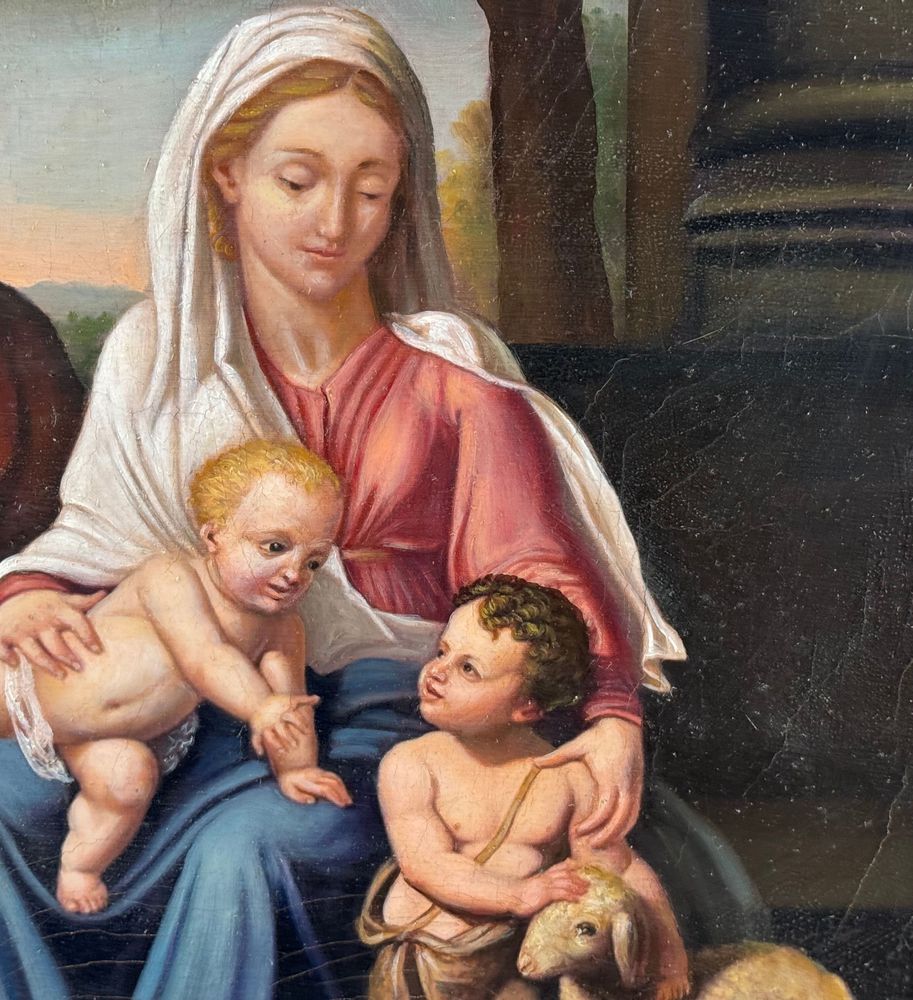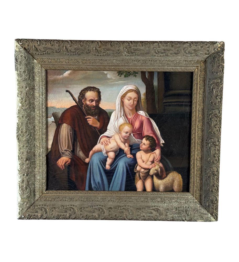 Dipinto olio su tela, periodo prima metà del XX secolo, scuola Italiana, raffigurante Sacra Famiglia con San Giovannino. Dimensioni compreso cornice: 73x64 cm. Dimensioni interno cornice: 55x46 cm. Artista anonimo. Opera in buone condizioni con lievi segni di vissuto come da foto allegate.