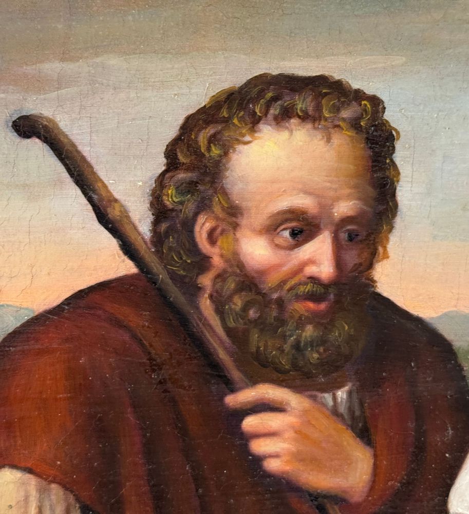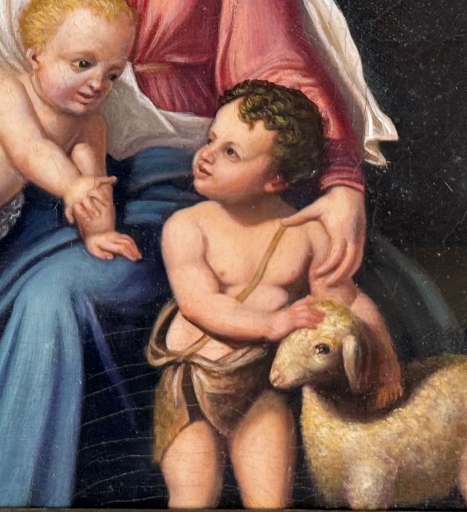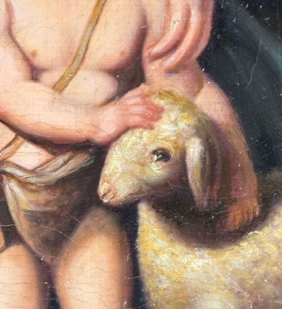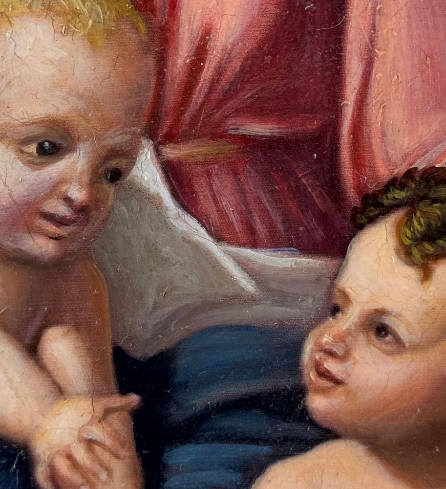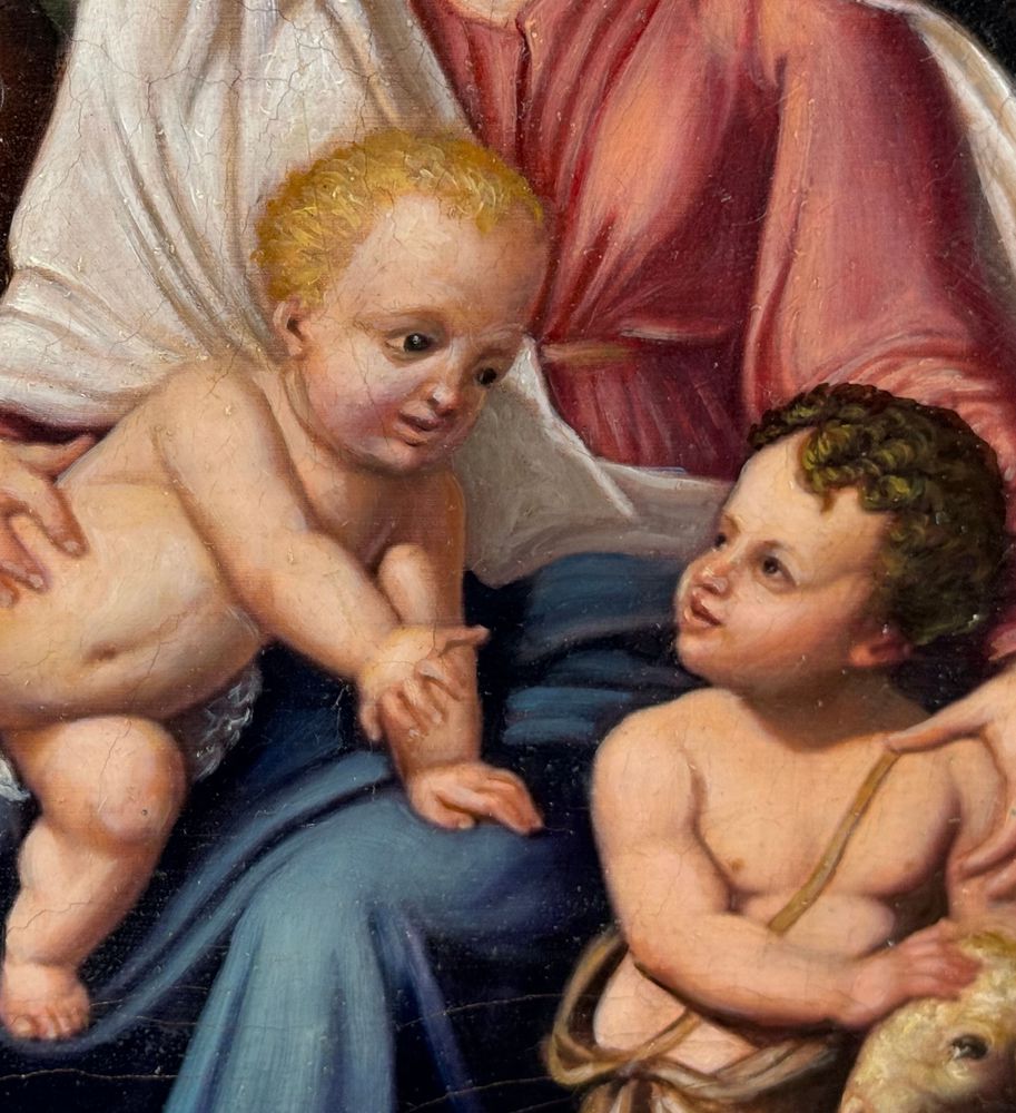 Dipinto olio su tela, periodo prima metà del XX secolo, scuola Italiana, raffigurante Sacra Famiglia con San Giovannino. Dimensioni compreso cornice: 73x64 cm. Dimensioni interno cornice: 55x46 cm. Artista anonimo. Opera in buone condizioni con lievi segni di vissuto come da foto allegate.