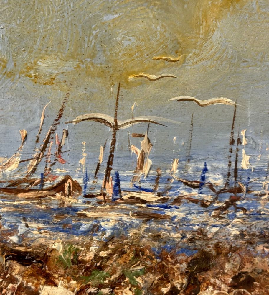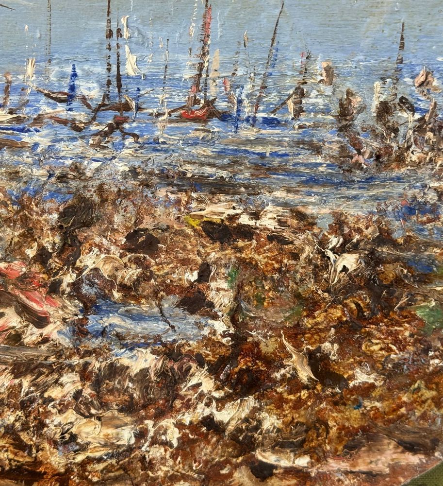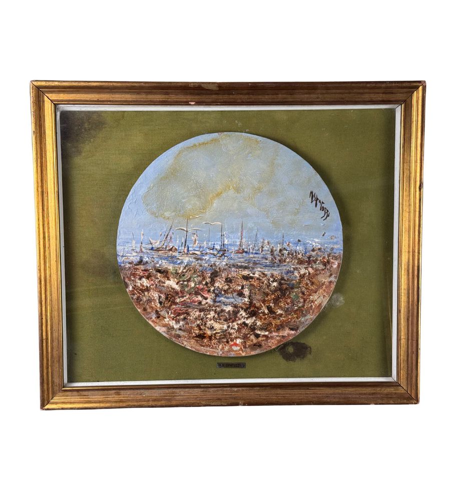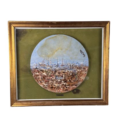 Dipinto olio su tavola, periodo XX secolo, scuola Italiana, raffigurante Marina. Dimensioni compreso cornice: 66x56 cm. Dimensioni interno cornice: 40x40 cm. Reca firma in alto a destra Spatuzzi. Opera in buone condizioni con lievi segni di vissuto come da foto allegate. Opera di forma tonda e ricca di materia pittorica.