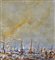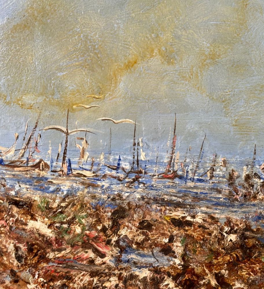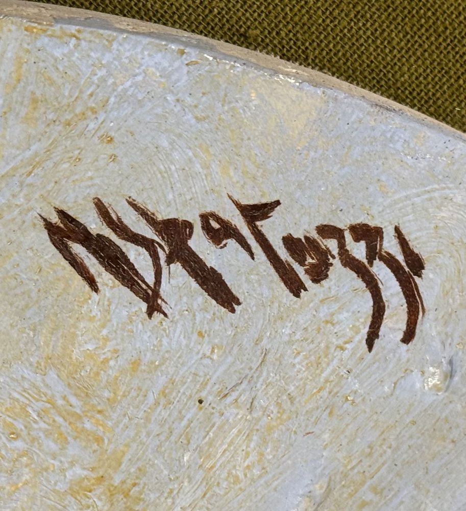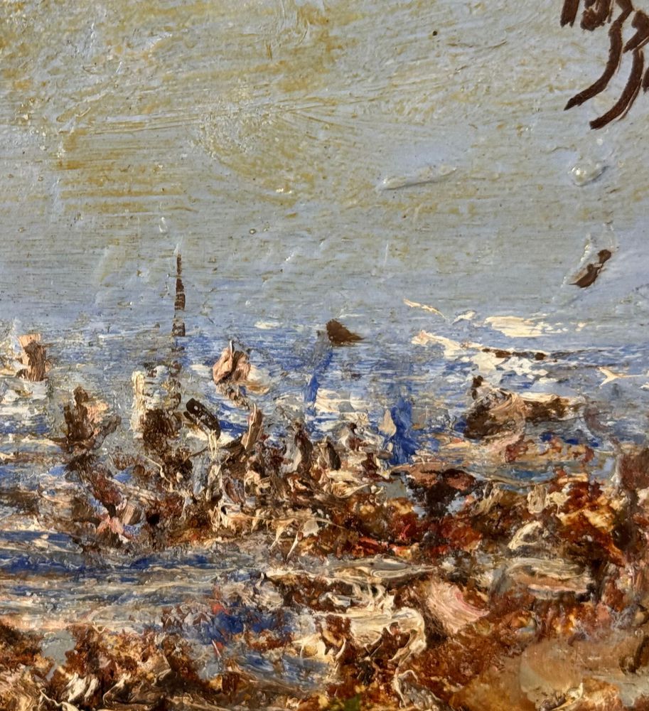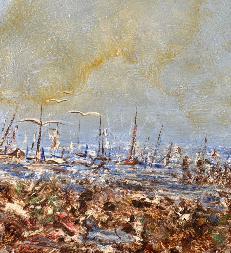 Dipinto olio su tavola, periodo XX secolo, scuola Italiana, raffigurante Marina. Dimensioni compreso cornice: 66x56 cm. Dimensioni interno cornice: 40x40 cm. Reca firma in alto a destra Spatuzzi. Opera in buone condizioni con lievi segni di vissuto come da foto allegate. Opera di forma tonda e ricca di materia pittorica.