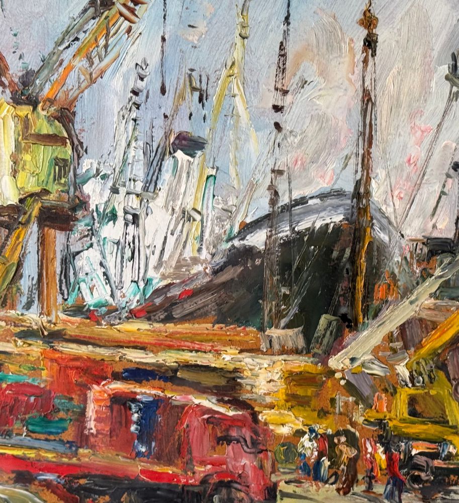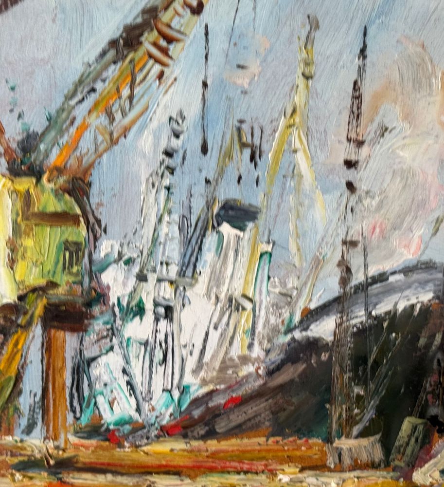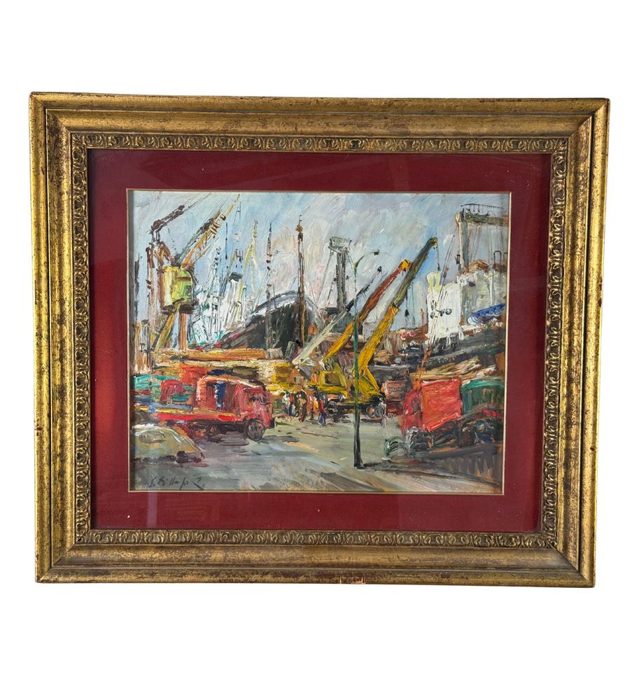 Dipinto olio su pannello, periodo XX secolo, scuola Italiana, raffigurante Cantiere navale. Dimensioni compreso cornice: 72x62 cm. Dimensioni interno cornice: 41x50 cm. Reca firma in basso a sinistra Edmondo Di Napoli. Opera in buone condizioni.
