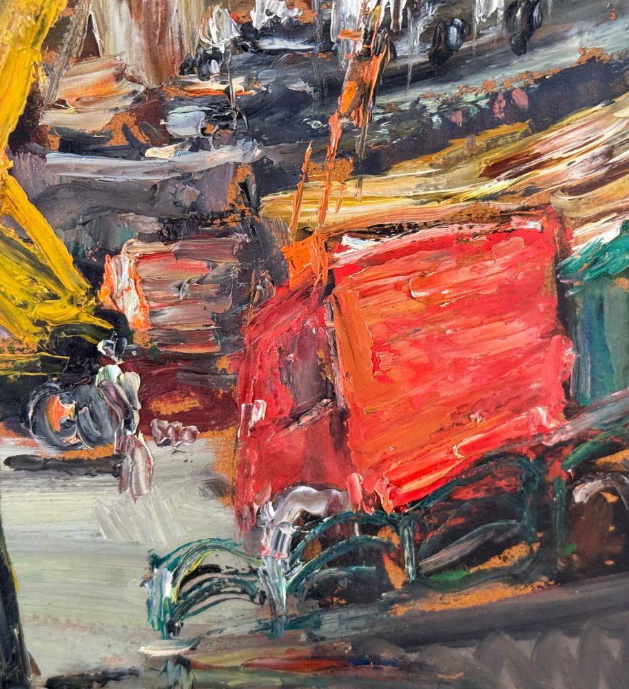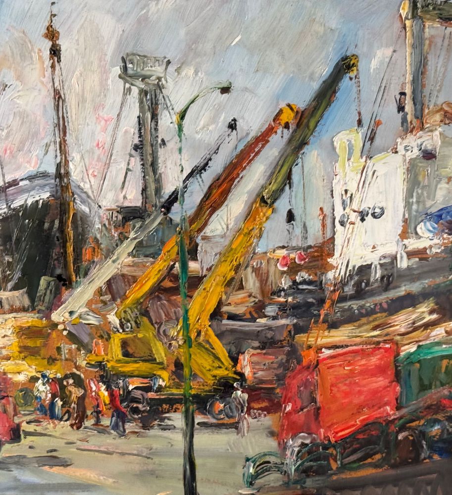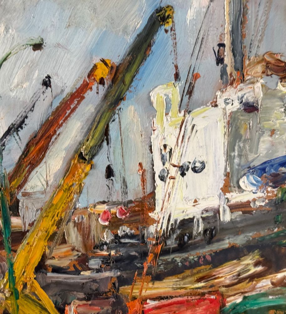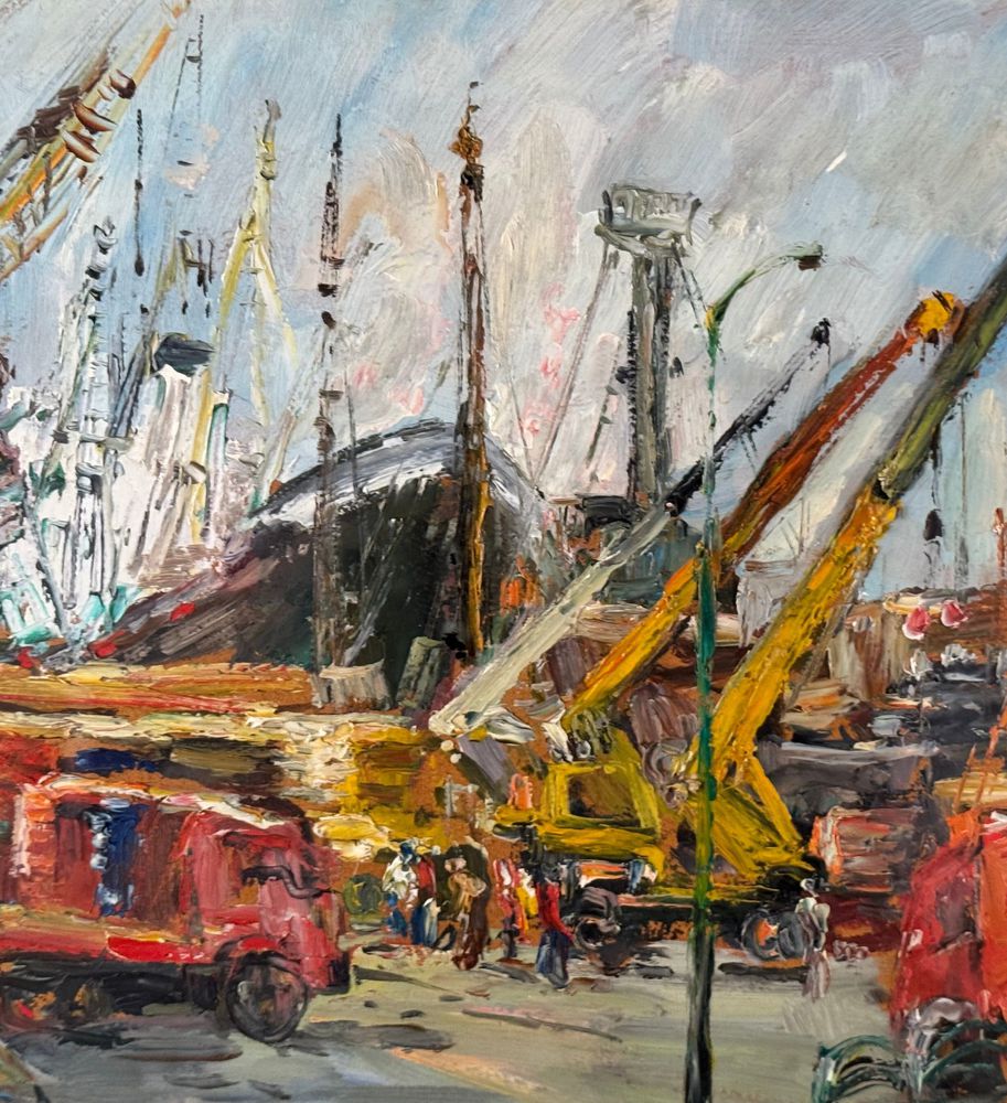 Dipinto olio su pannello, periodo XX secolo, scuola Italiana, raffigurante Cantiere navale. Dimensioni compreso cornice: 72x62 cm. Dimensioni interno cornice: 41x50 cm. Reca firma in basso a sinistra Edmondo Di Napoli. Opera in buone condizioni.