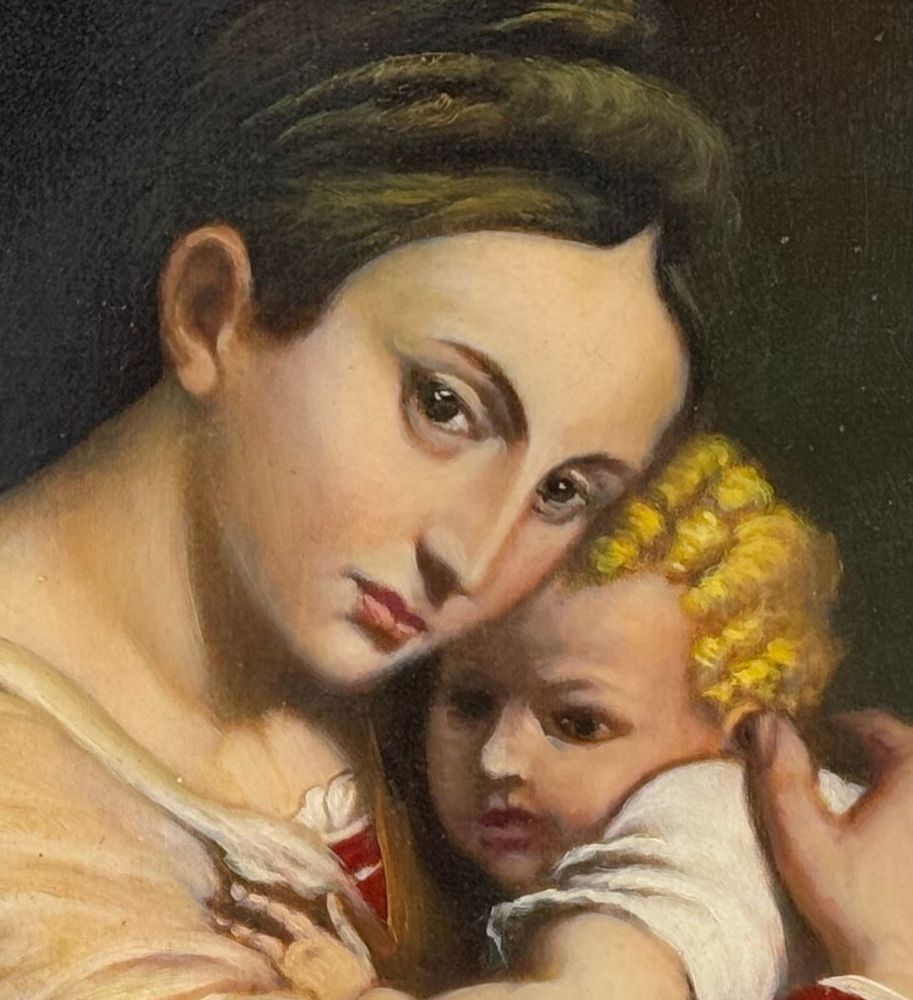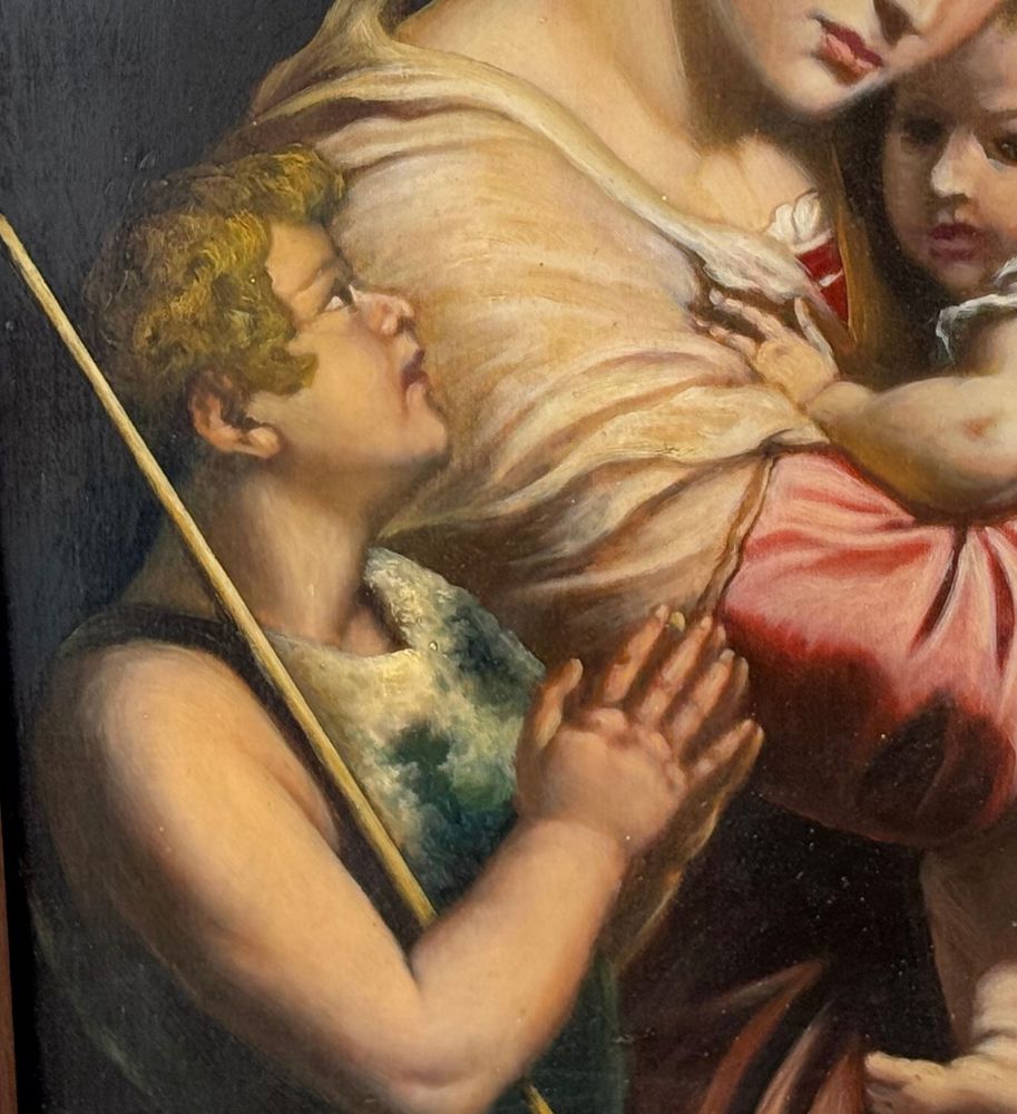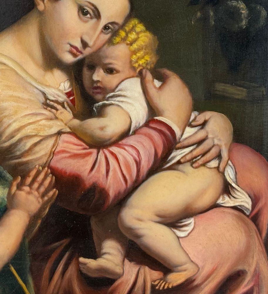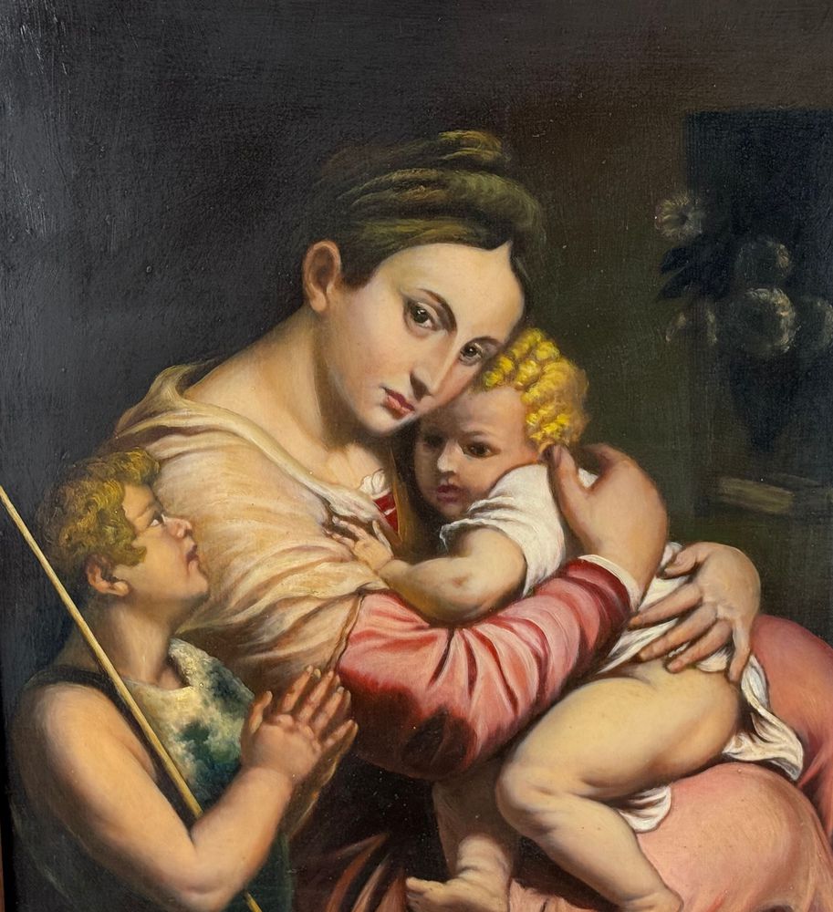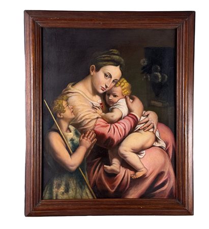 Dipinto olio su tela, periodo XIX/XX secolo, scuola Italiana, raffigurante Sacra Famiglia con San Giovannino. Dimensioni compreso cornice: 61x73 cm. Dimensioni interno cornice: 51x62 cm. Artista anonimo. Opera in buone condizioni.