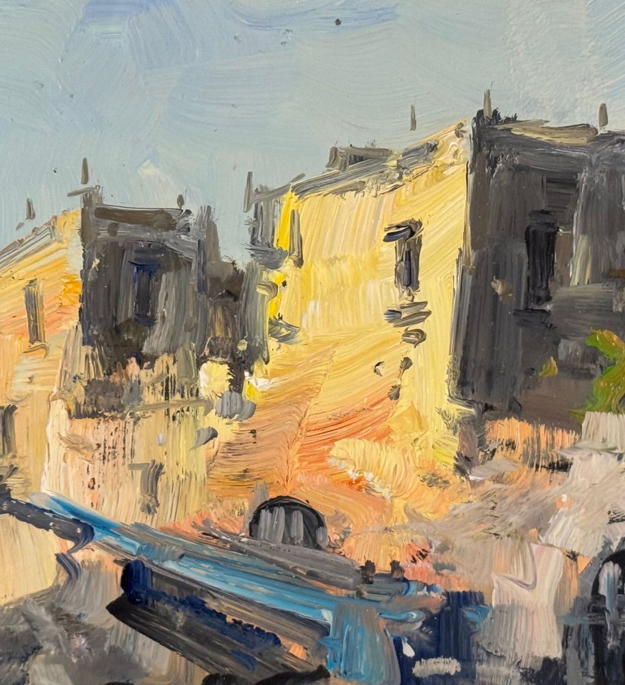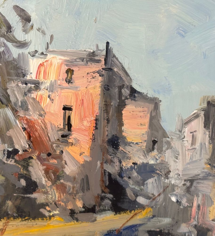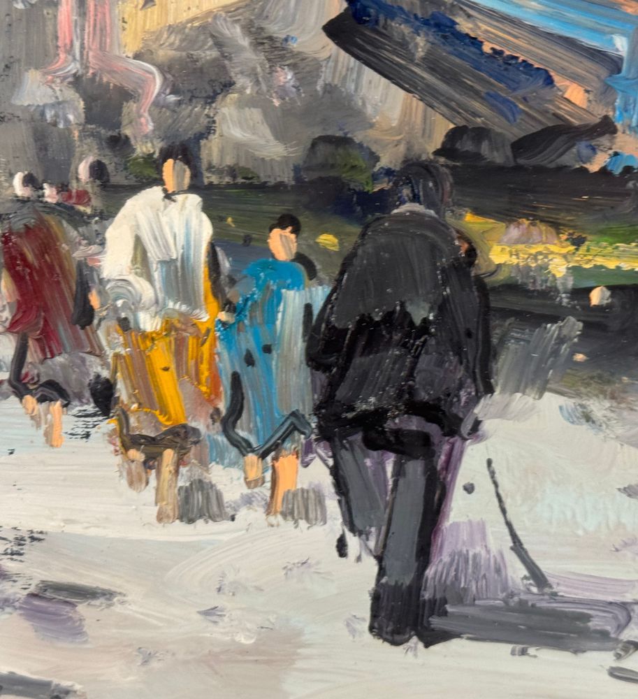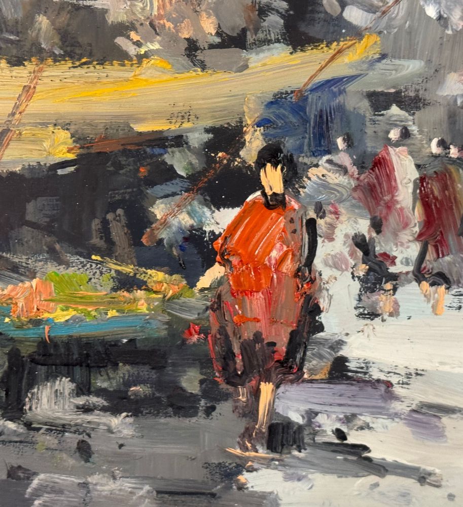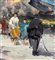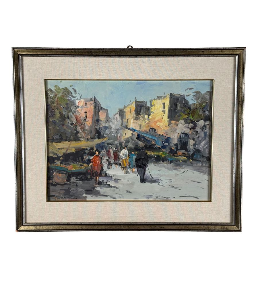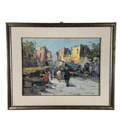 Dipinto olio su tavola, periodo XX secolo, scuola Italiana, raffigurante Strada con personaggi. Dimensioni compreso cornice: 65x52 cm. Dimensioni interno cornice: 50x37 cm. Reca firma in basso a sinistra Di Marino. Opera in buone condizioni.