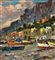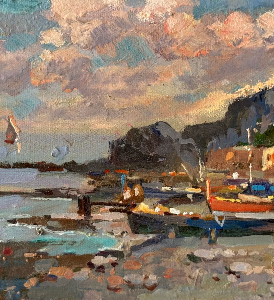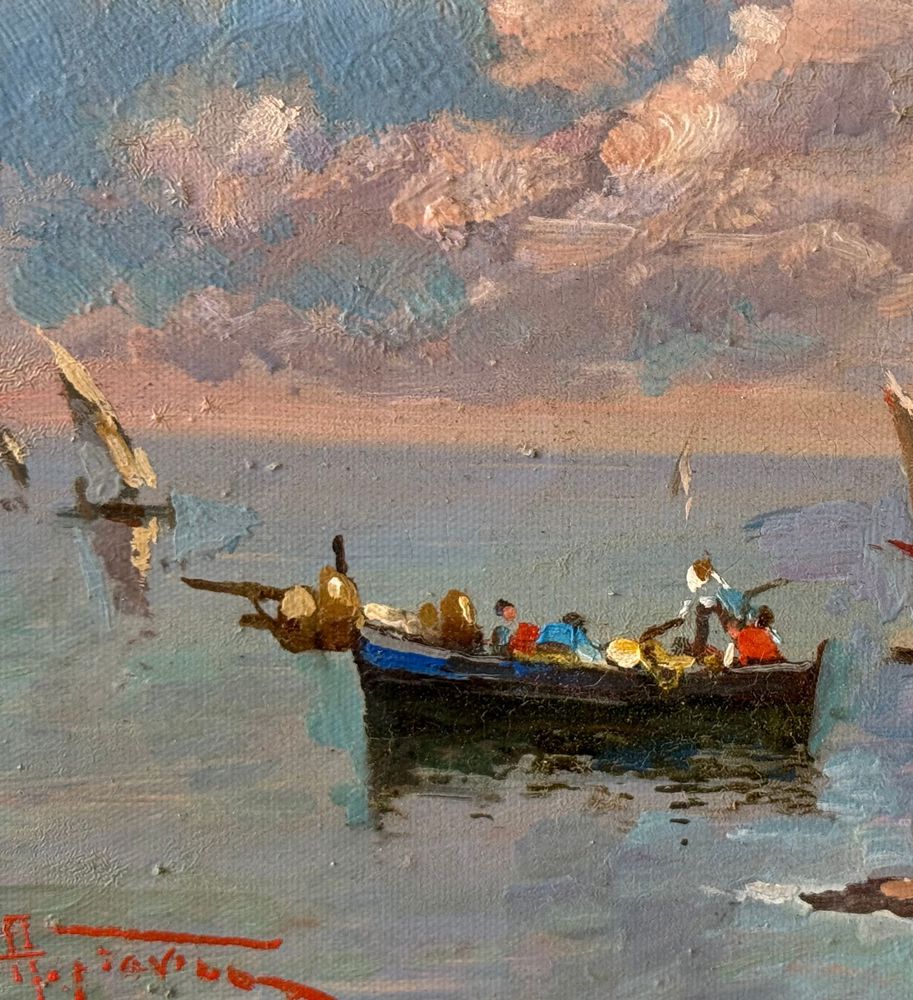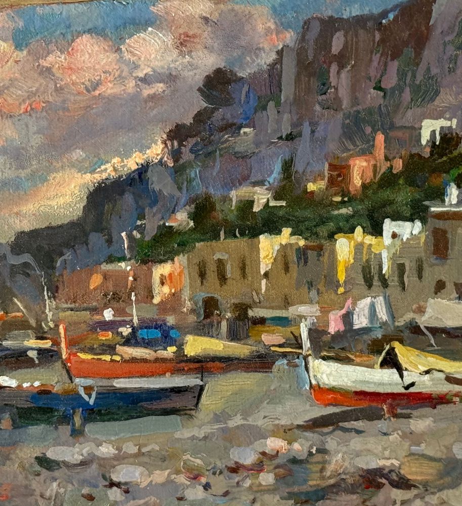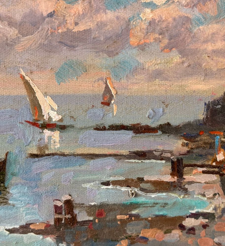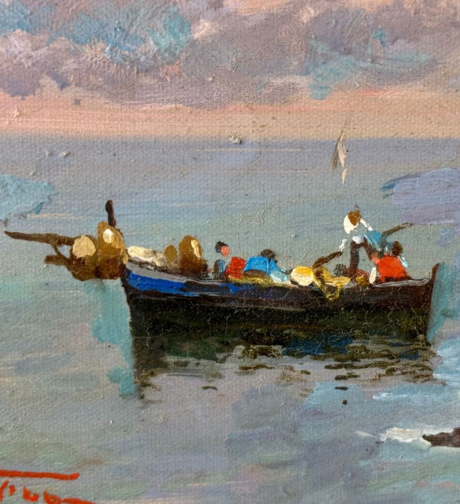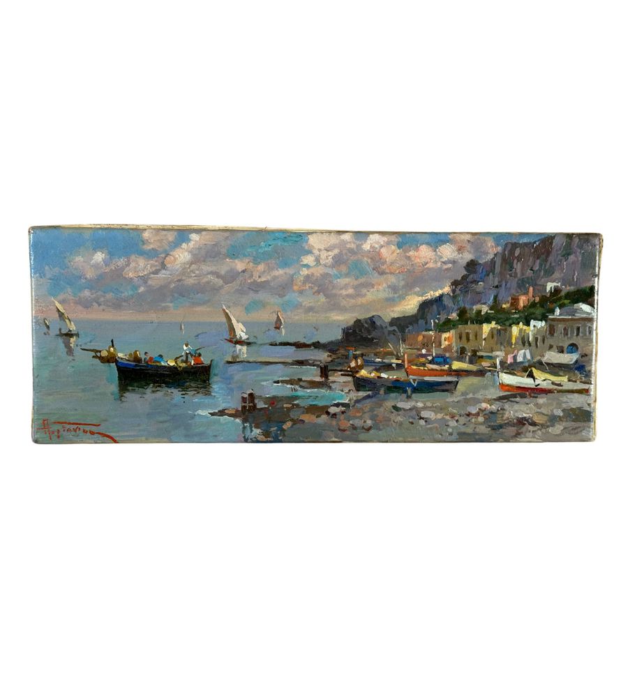 Dipinto olio su tela, periodo XX secolo, scuola Italiana, raffigurante Scorcio di marina. Dimensioni: 40x15 cm. Reca firma in basso a sinistra e autentica sul retro A. Gravina. Opera in buone condizioni.