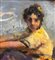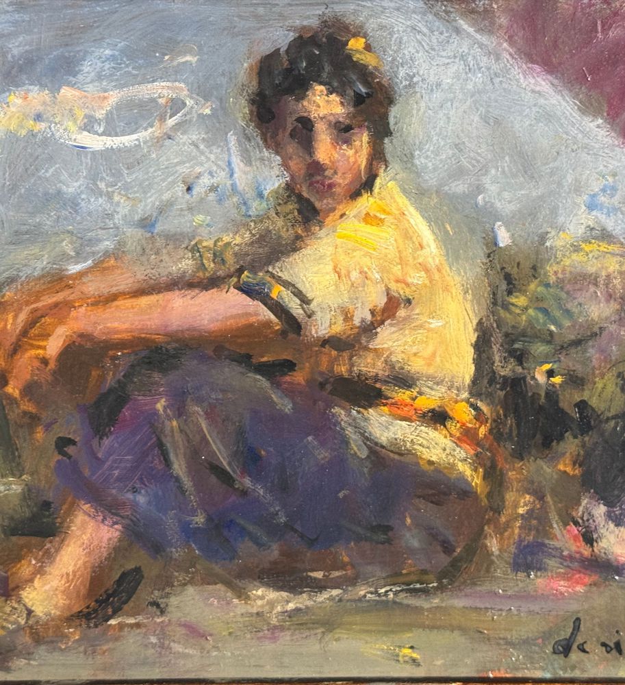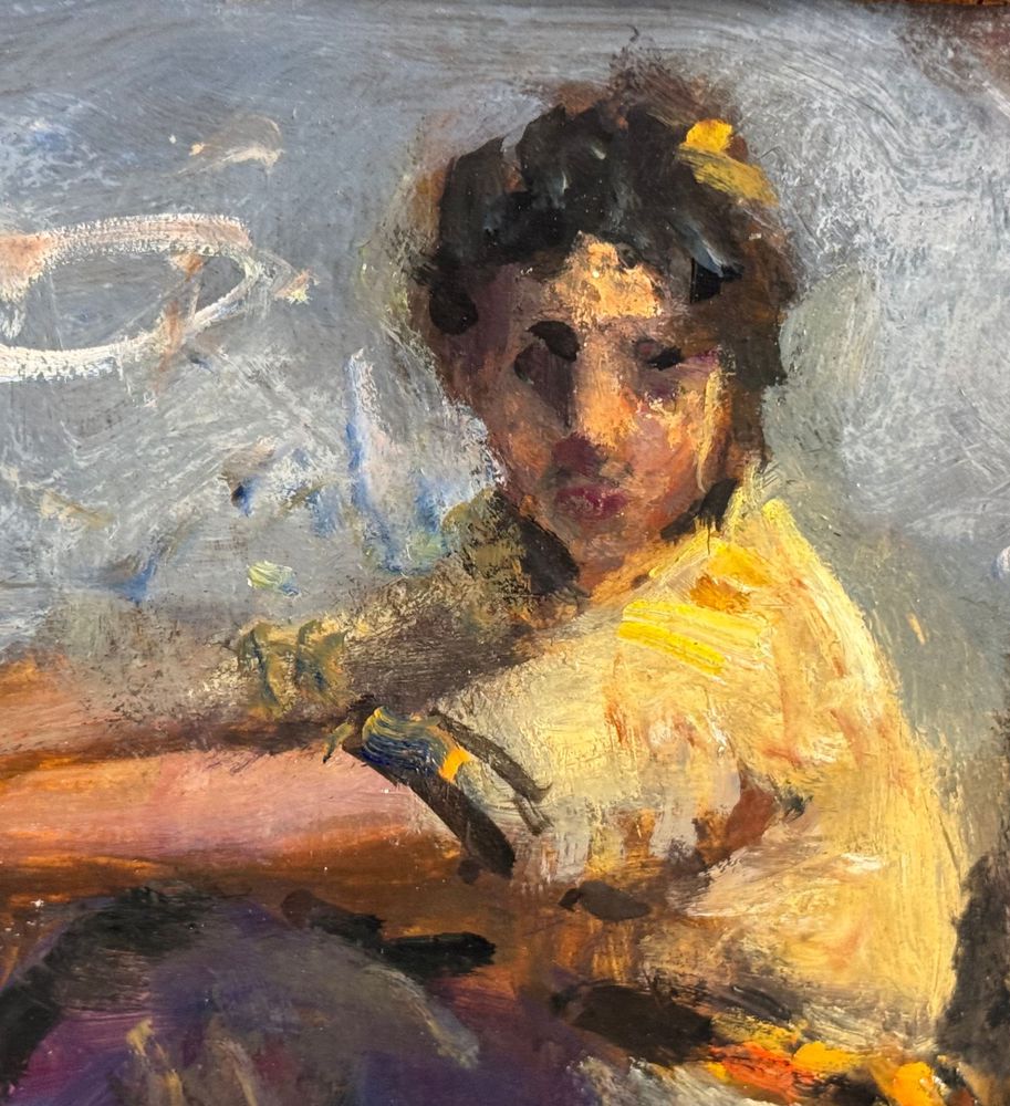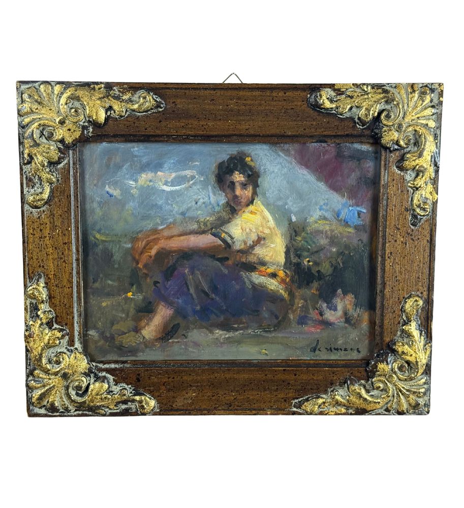 Dipinto olio su cartoncino, periodo XX secolo, scuola Italiana, raffigurante Giovane donna. Dimensioni compreso cornice: 32x26 cm. Dimensioni interno cornice: 24x18 cm. Reca firma in basso a destra artista non identificato. Opera in buone condizioni.