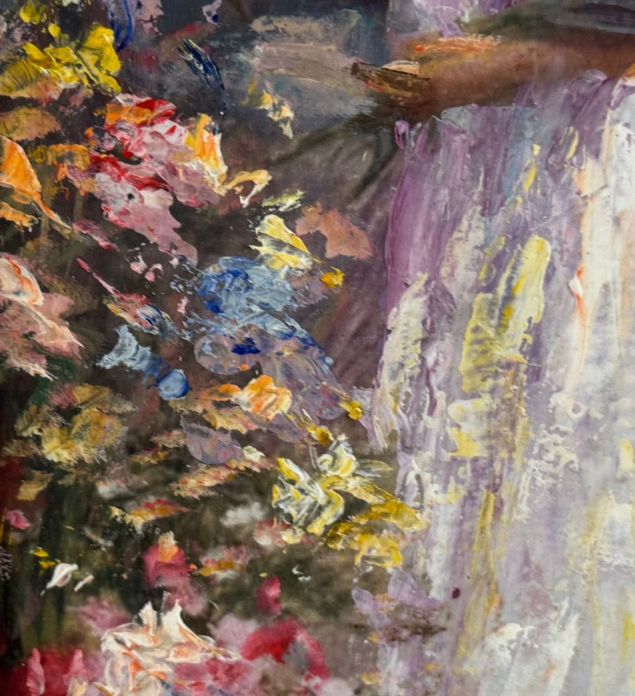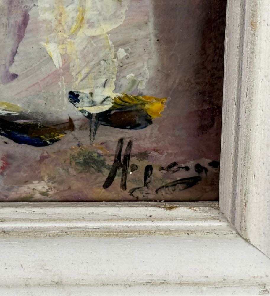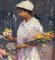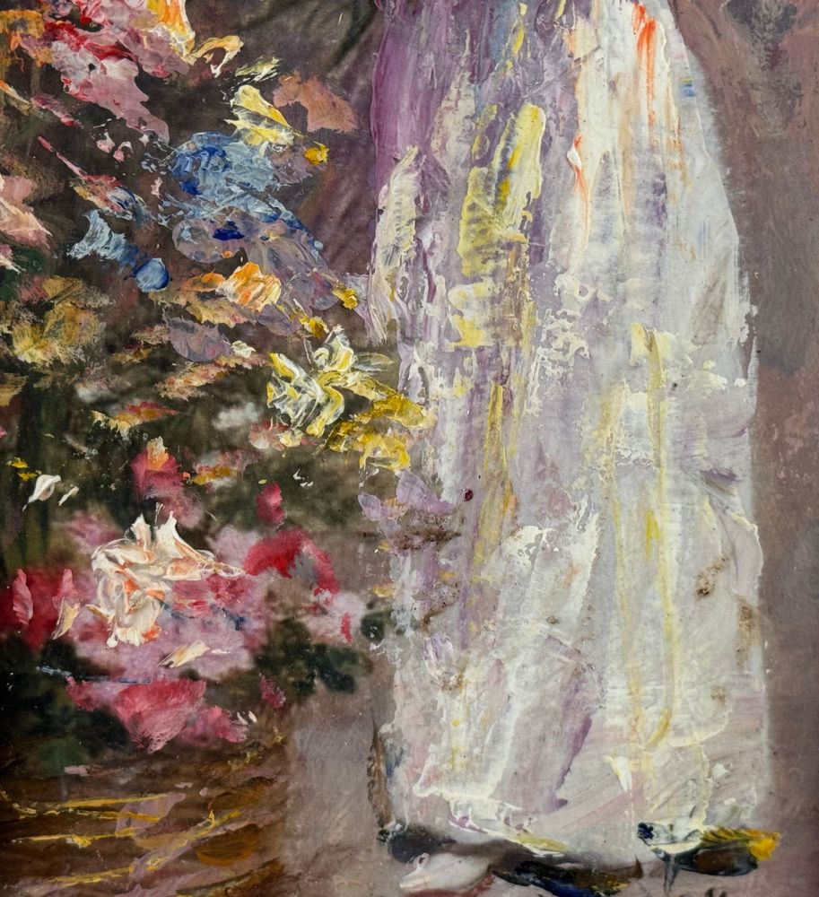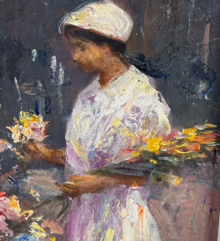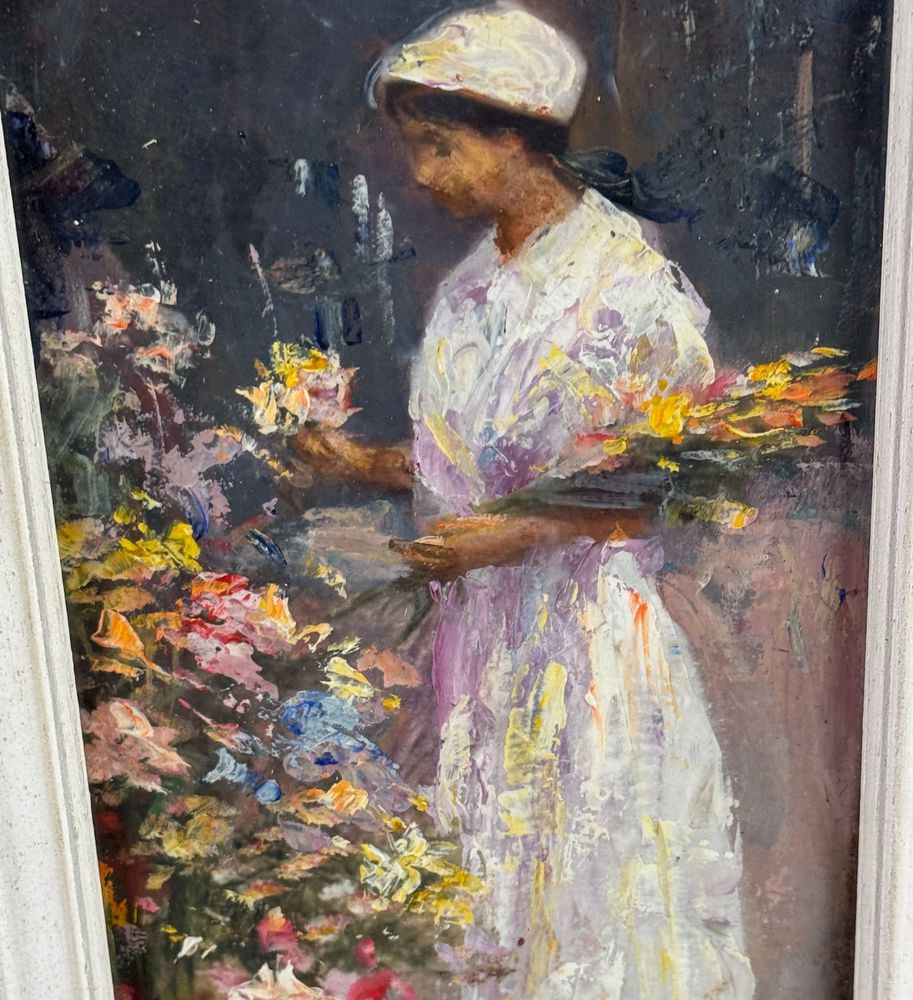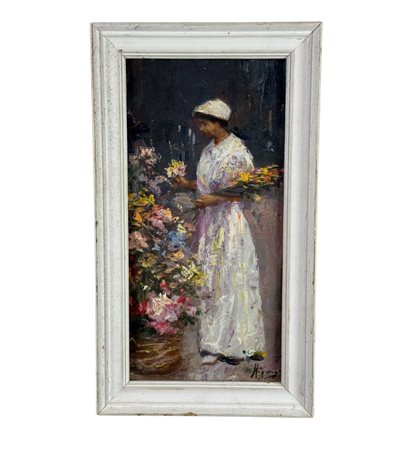 Dipinto olio su cartoncino applicata su tavola, periodo XX secolo, scuola Italiana, raffigurante Donna e fiori. Dimensioni compreso cornice: 21x38 cm. Dimensioni interno cornice: 16x33 cm. Reca firma in basso a destra artista non identificato. Opera in buone condizioni.