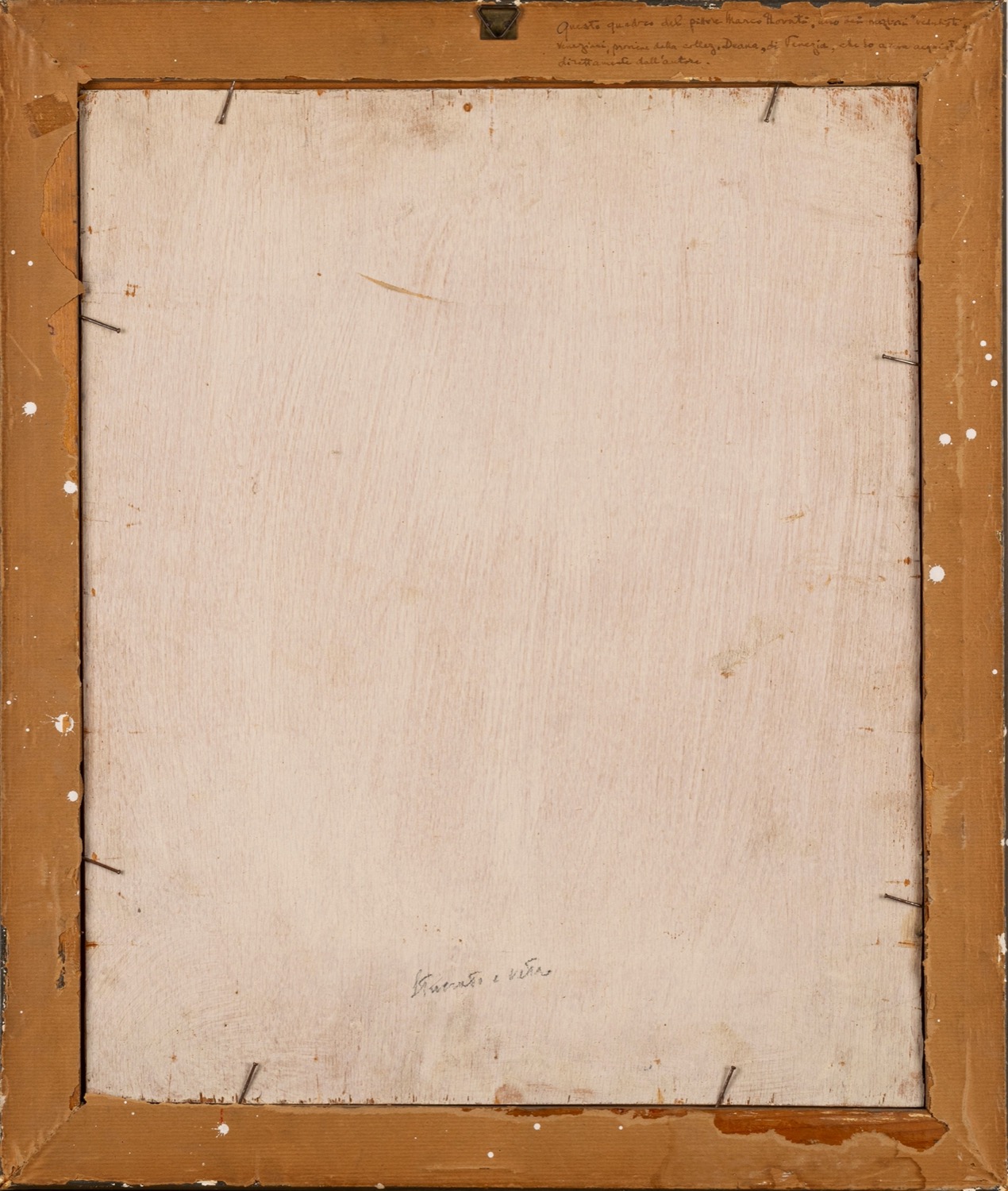 al retro, sulla cornice, vecchia scritta con riferimento al dipinto, al pittore e alla provenienza
