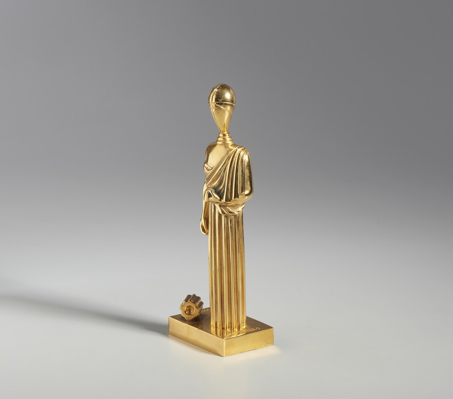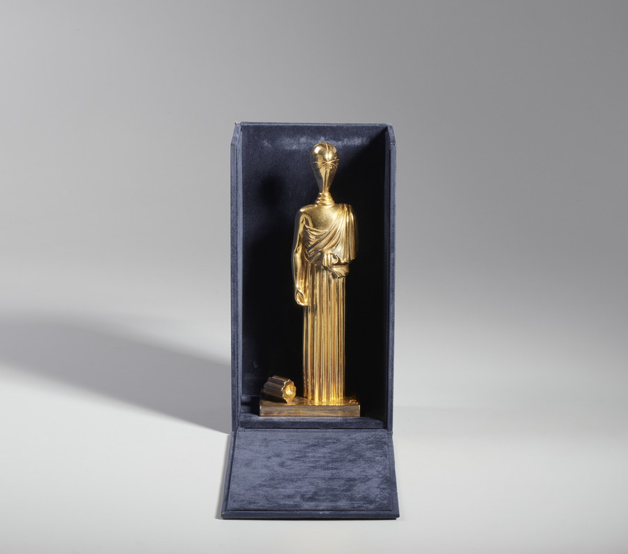 DE CHIRICO GIORGIO (1888 - 1978) LA MUSA CON COLONNA SPEZZATA. 1970. Bronzo dorato. Cm 11,50 x 30,50 x 7,50. firma, titolo, tiratura incisi alla base, es. LXXX/C,