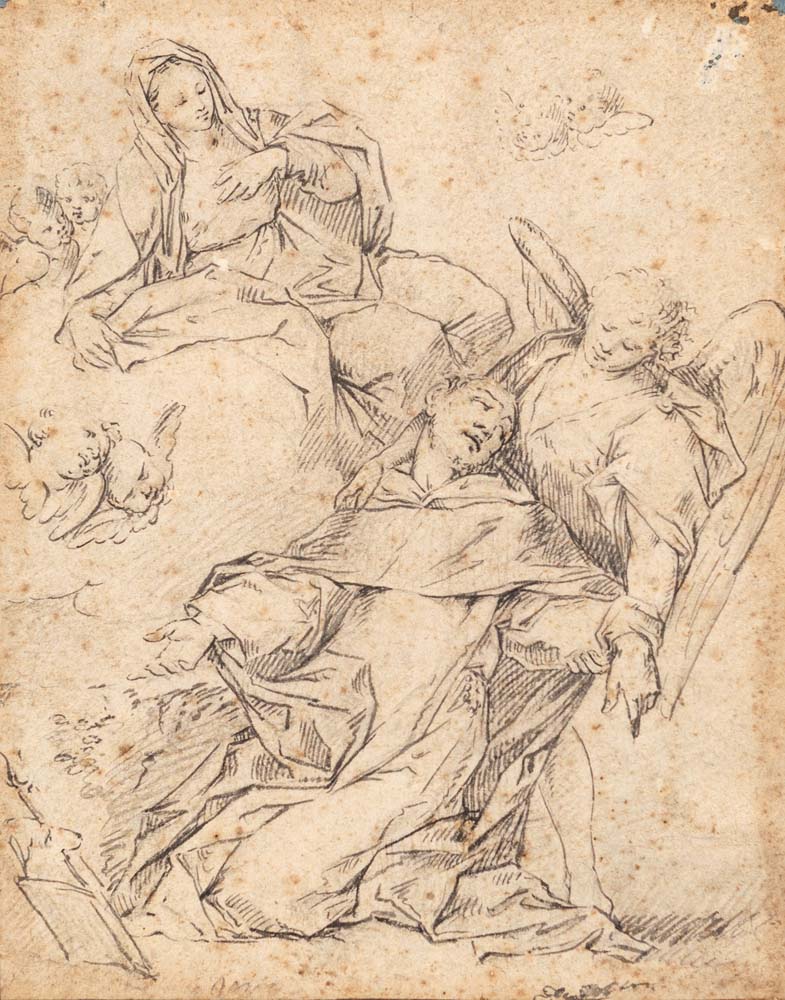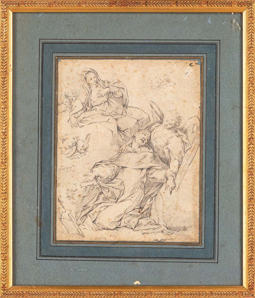 Scuola italiana del XVII secolo San Francesco in estasi Il bel foglio raffigurante un San Francesco in estasi di fronte la Madonna, supportato da un angelo dalle ali spiegate presenta delle affinità stilistiche alle opere grafiche di Raffaele Vanni, sia per la costruzione della composizione sia per una durezza del tratto, che delinea le fisionomie dei personaggi. inchiostro su carta mm 250x195 - in cornice cm 41x35