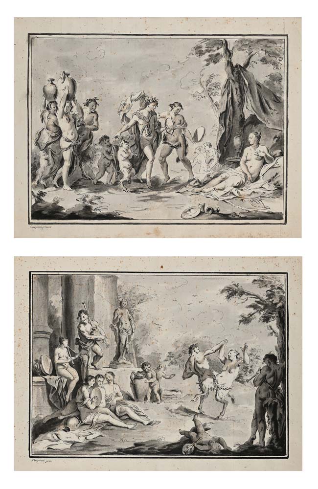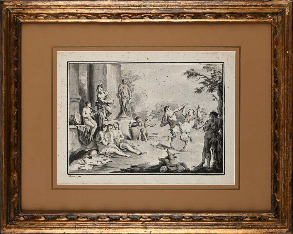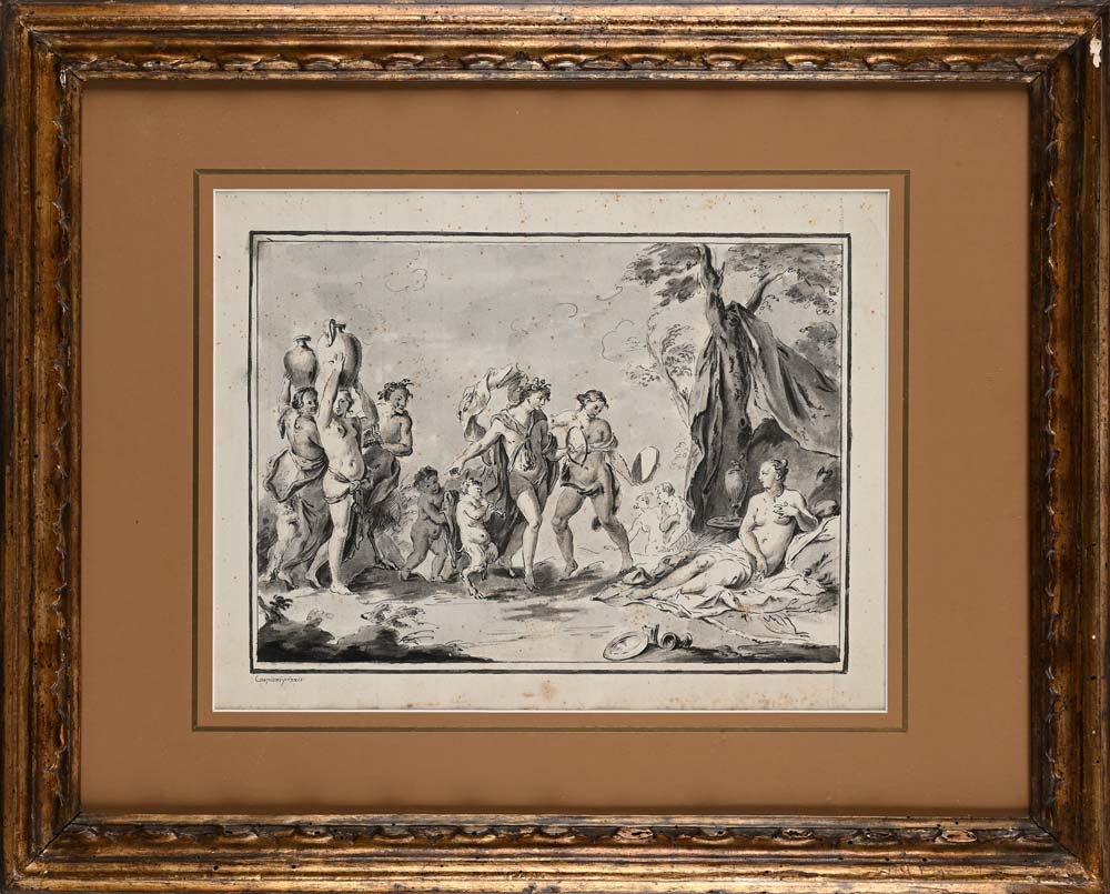 Pietro Antonio Novelli Bacco e Arianna sull'isola di Nasso - Festa bacchica in basso a sinistra recano l'iscrizione "Carpioni pinx" China e inchiostro acquerellato su carta mm 290x370 - con cornice cm 47x58