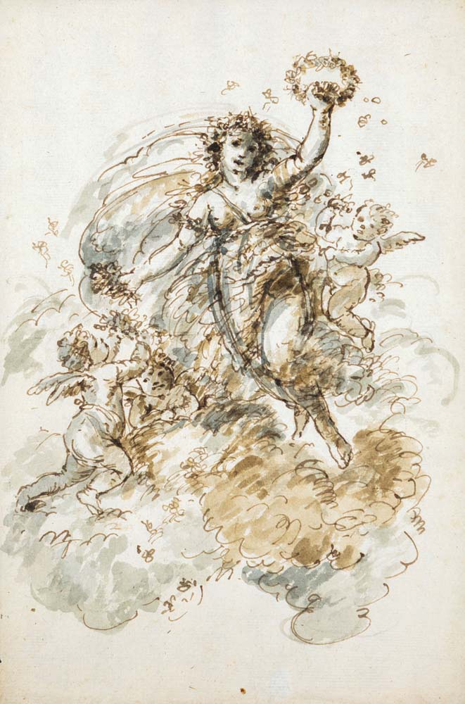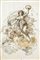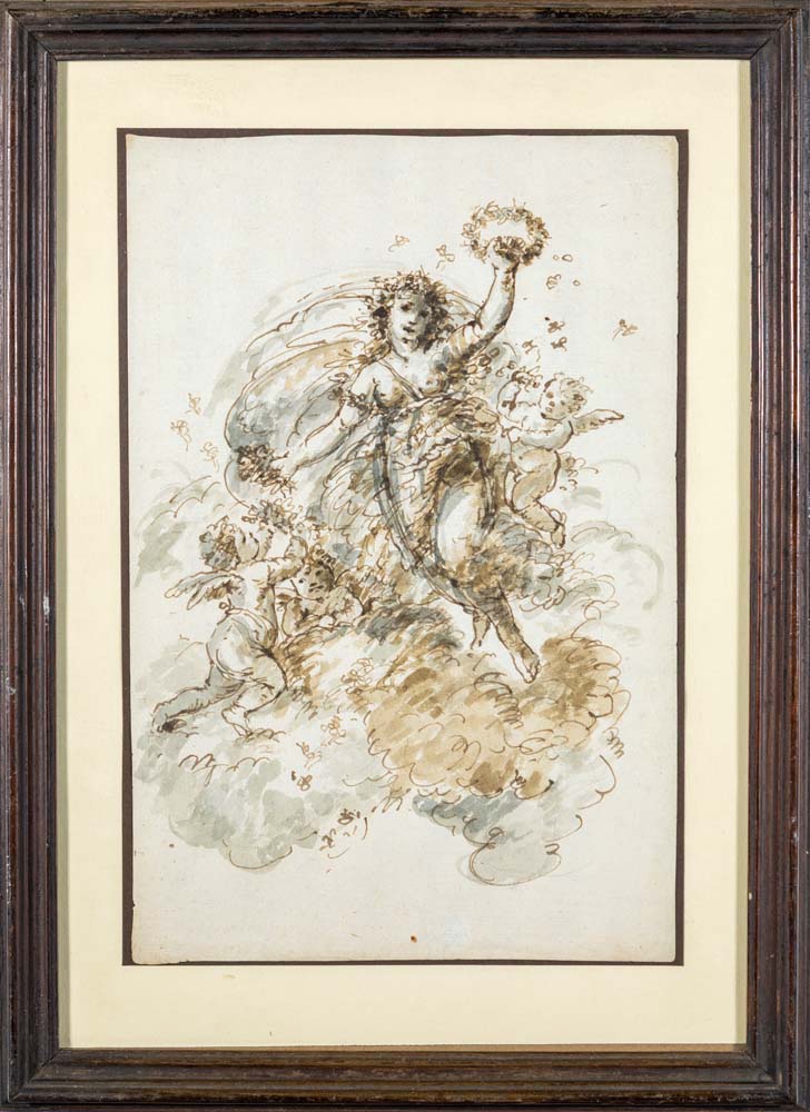 Scuola Romana del XVIII secolo Allegoria per il Trionfo delle Arti Al verso reca un'etichetta collezionistica che attribuisce il foglio a Giuseppe Passeri China e inchiostro acquerellato su carta mm 310x210 - con cornice cm 43x31