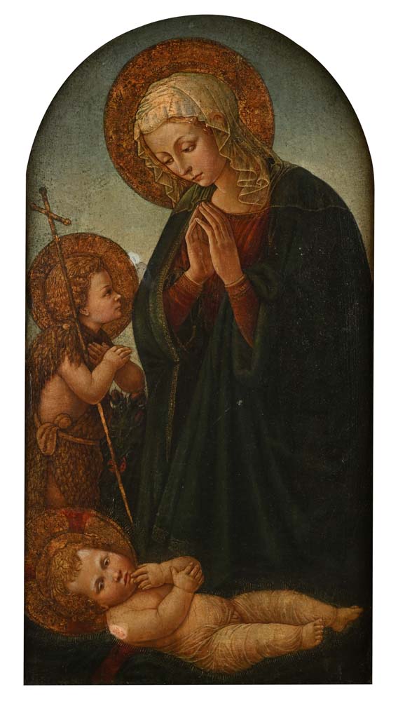 Scuola fiorentina del XVI secolo Madonna col Bambino e San Giovannino tempera su tavola centinata cm 64x33 - cm 107x60 Collezione Imperiali, Roma, discendenti duca Paolo Camillo Thaon di Revel e di Sant'Andrea, Duca del Mare, Torino