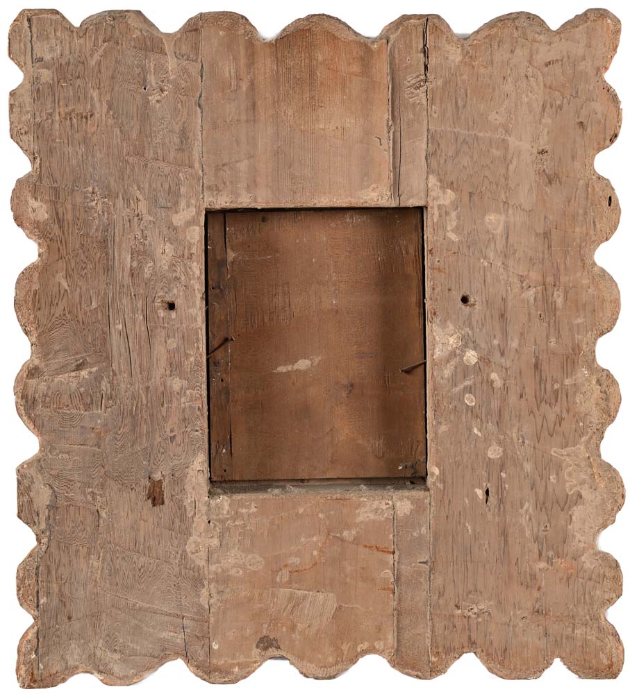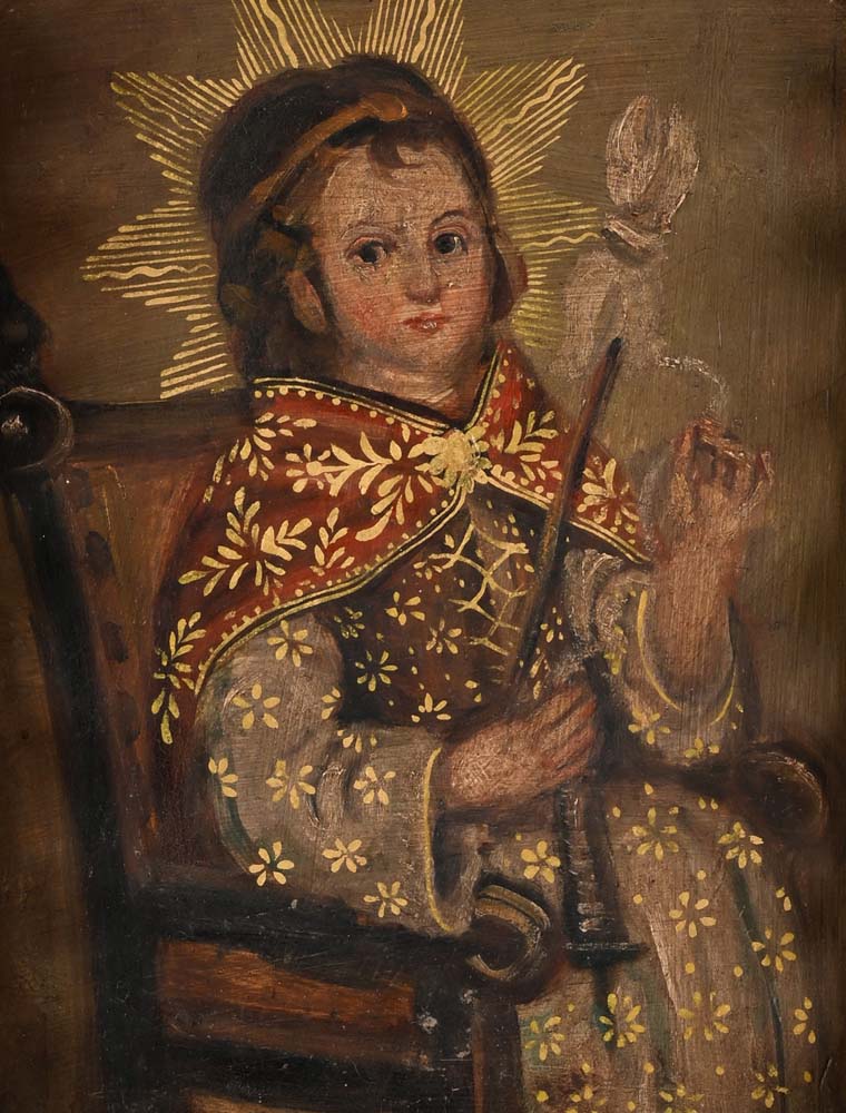 La ricca cornice riflette il simbolismo degli specchi, che nella tradizione andina sono strumenti di introspezione e comunicazione con il mondo spirituale, essenziali nei rituali, oltre a svolgere una funzione decorativa. tempera su tavola cm 21,5x17,5 - con cornice cm 53x49 Valdivieso, Enrique, Una Virgen niña hilando y un Niño de la Espina de Juan Simón Gutiérrez, Laboratorio de arte, 15, 2002