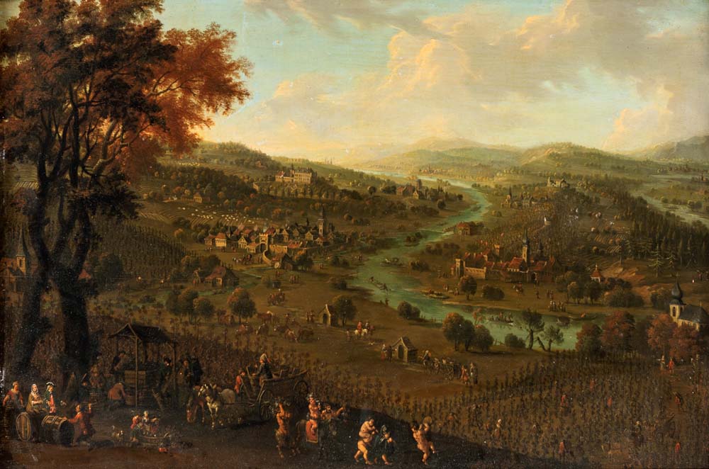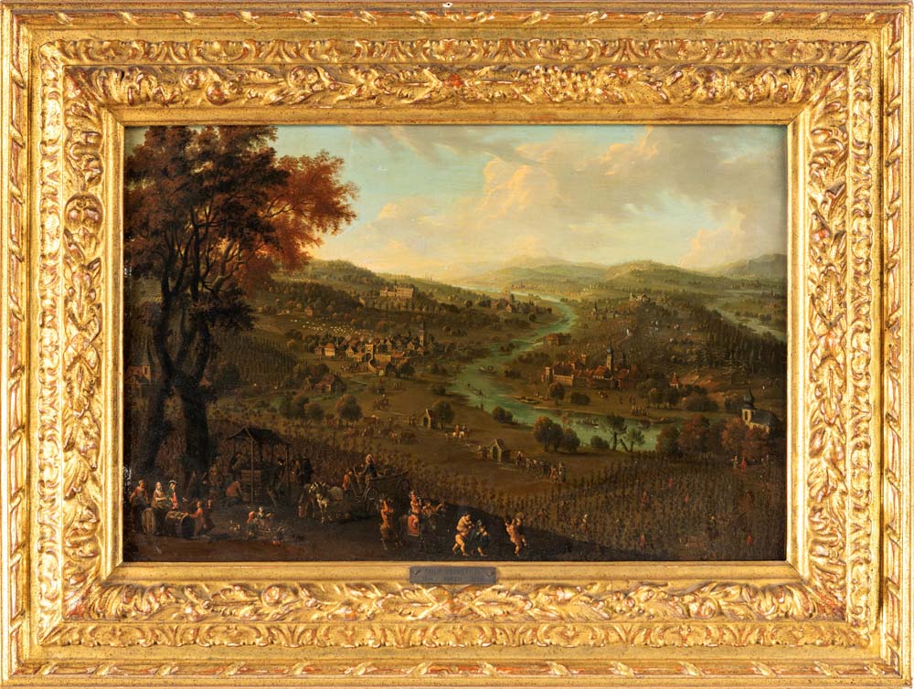 Pittore fiammingo del XVI secolo L'Estate di Bacco o Il Trionfo della Vendemmia olio su tavola cm 38x56,5 - con cornice cm 58,5x77,5