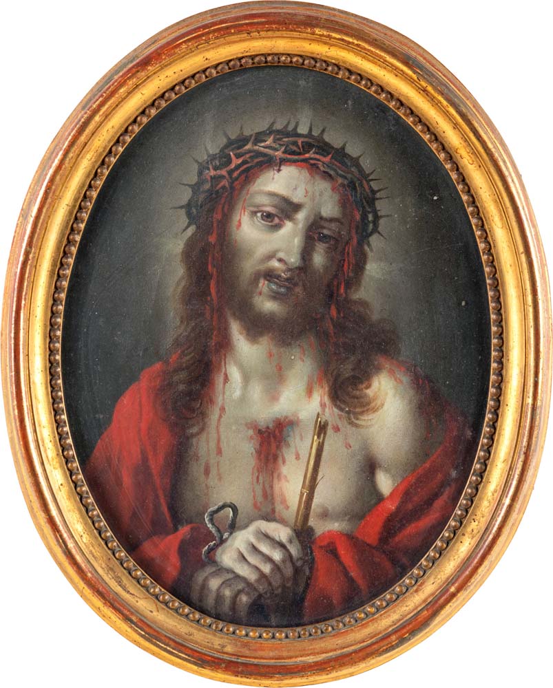 Scuola Romana del XVIII secolo Ecce Homo La tela, di formato ovale e racchiusa in una cornice dorata dello stesso formato, raffigura Cristo a mezzo busto, a torso nudo e con corona di spine, indossando un mantello rossiccio. Le mani sono legate e nella destra sostiene uno scettro. Lo sfondo è scuro, mentre il volto sofferente è leggermente inclinato verso destra. "Ecco l'uomo" sono le parole che, secondo il Vangelo di San Giovanni, Pilato pronunciò mentre presentava alla folla Gesù flagellato e coronato di spine. olio su tela cm 29,5x22,5 - con cornice cm 35x28