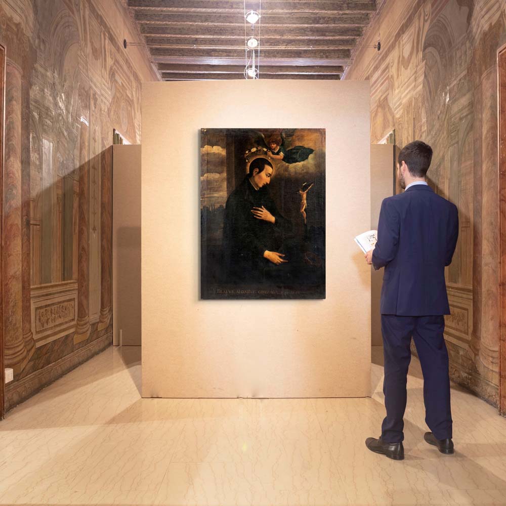 Aloysius Gonzaga (Luigi Gonzaga, 1568-1591) fu il primogenito del Marchese di Castiglione ed erede del titolo familiare. Rinunciò a una vita privilegiata e a un’eredità principesca per abbracciare la vita religiosa, arrivando a contrarre la peste a causa delle sue cure disinteressate verso i malati. Scelse di entrare nella Compagnia di Gesù e rifiutò il trono in favore del fratello minore. Fu beatificato nel 1605 e proclamato Santo da papa Benedetto XIII nel 1726. Il nostro dipinto rappresenta in termini allegorici l'abdicazione della vocazione temporale in favore di quella spirituale. Il giovane Beato Luigi Gonzaga è ritratto di profilo, con un'espressione devota e assorta in meditazione. Indossa una tonaca nera, ha una mano posata sul petto e l’altra tesa verso la corona della sua famiglia, appoggiata su un tavolino con tovaglia, accanto a un Crocifisso. Inginocchiato, adora il Crocifisso mentre un angelo gli porge una ghirlanda fiorita, simbolo della sua ricompensa celeste.