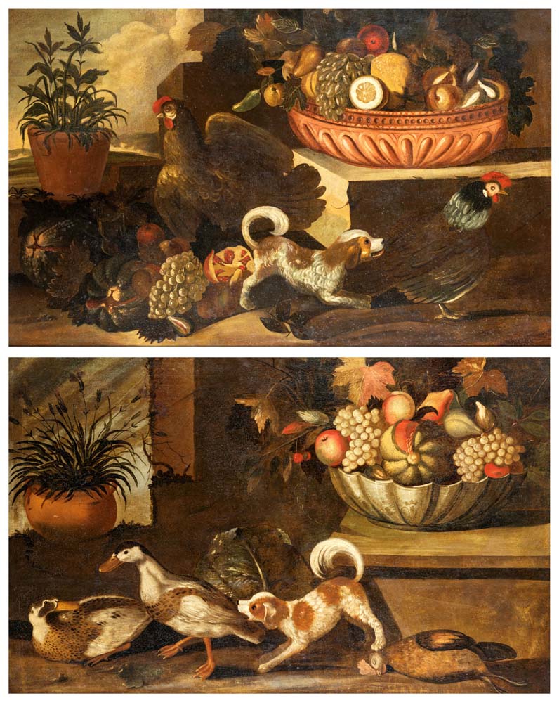 Pittore del XVIII secolo Coppia di dipinti: Natura morta con animali e frutta...