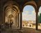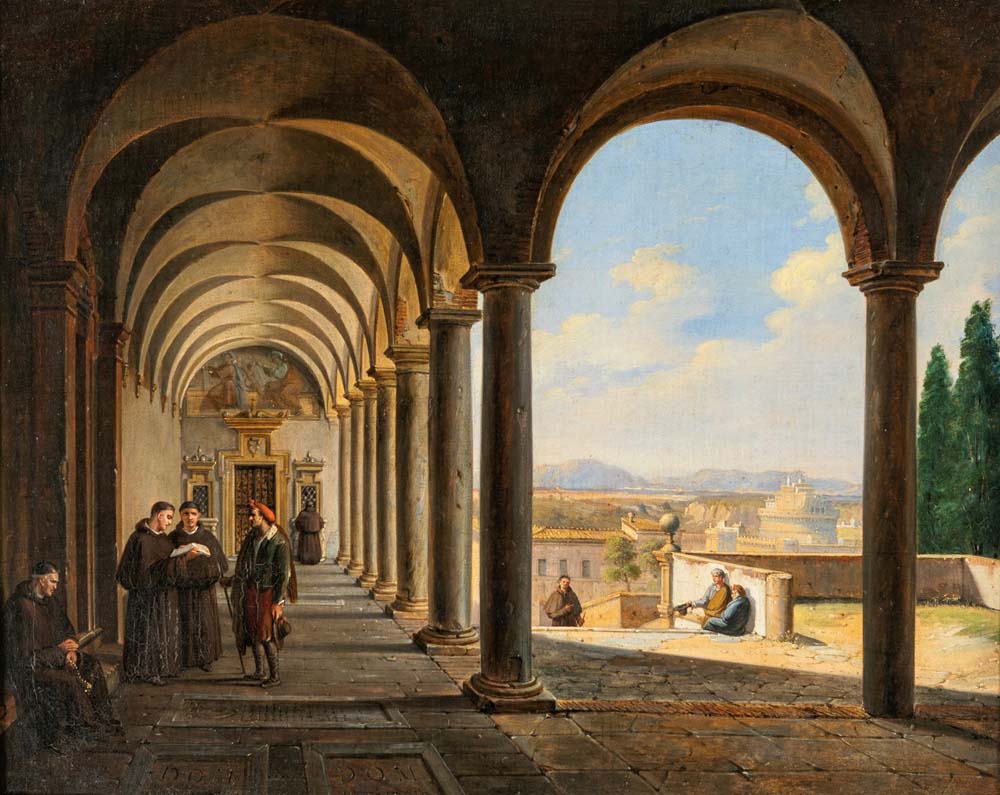 Pittore del XIX secolo Monaci Benedettini in un Chiostro Dom, dal lattino...