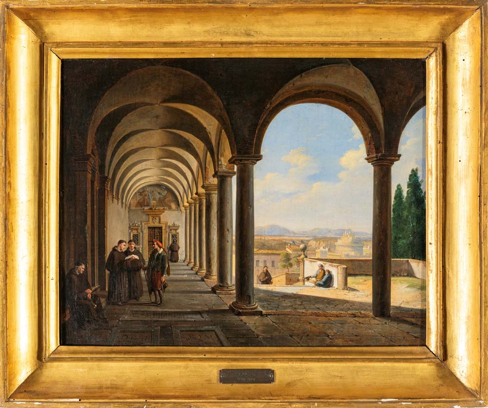 Pittore del XIX secolo Monaci Benedettini in un Chiostro Dom, dal lattino Dominus, è il trattamento riservato ai monaci benedettini olio su tela cm 37,5x47 - con cornice cm 49,5x59