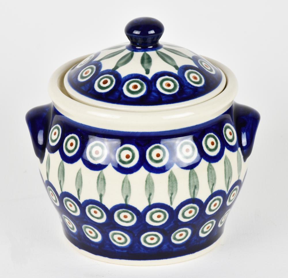 VASETTO CON COPERCHIO in ceramica decorato a motivi geometrici blu, verdi e...
