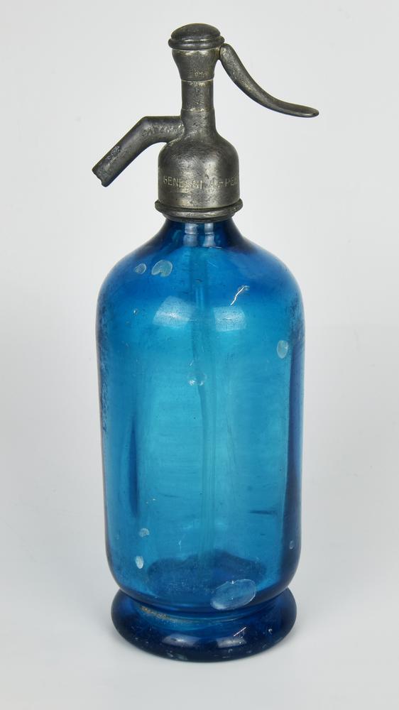 BOTTIGLIA PER SELTZ in vetro blu, anni '30 GENESSI A. - PERTICARA inciso sul...