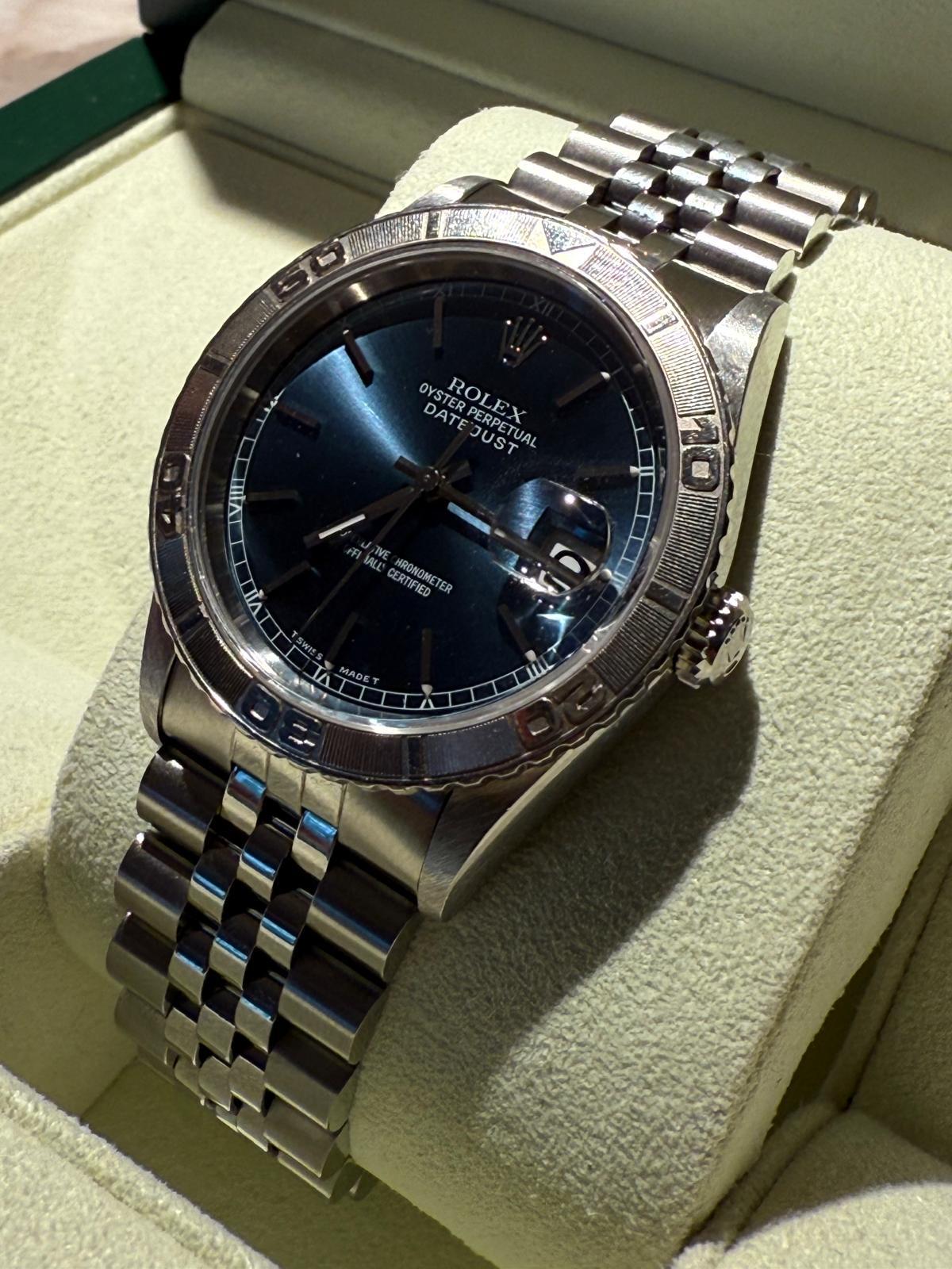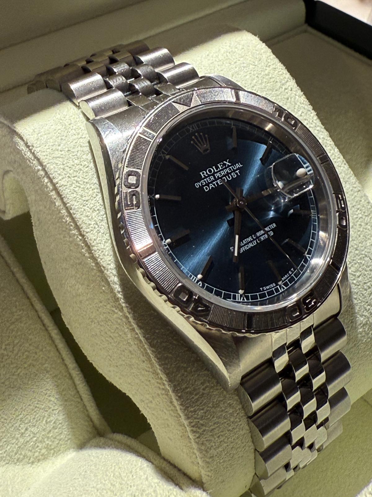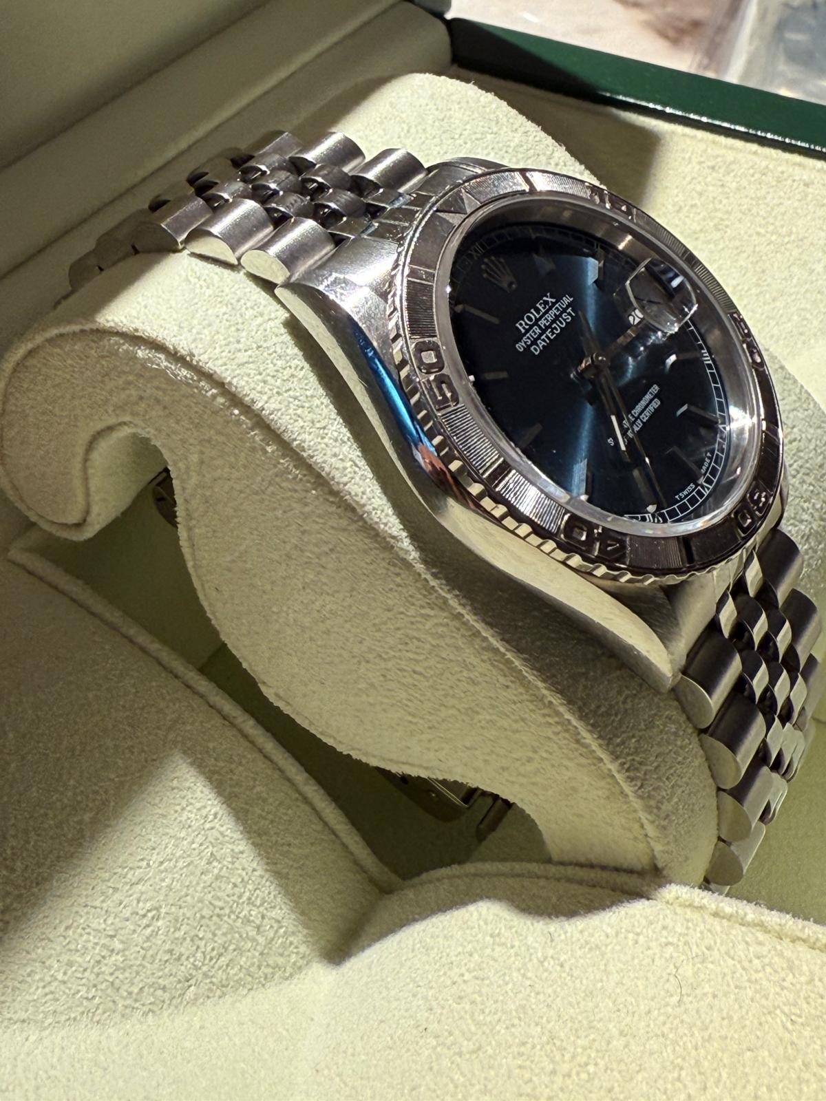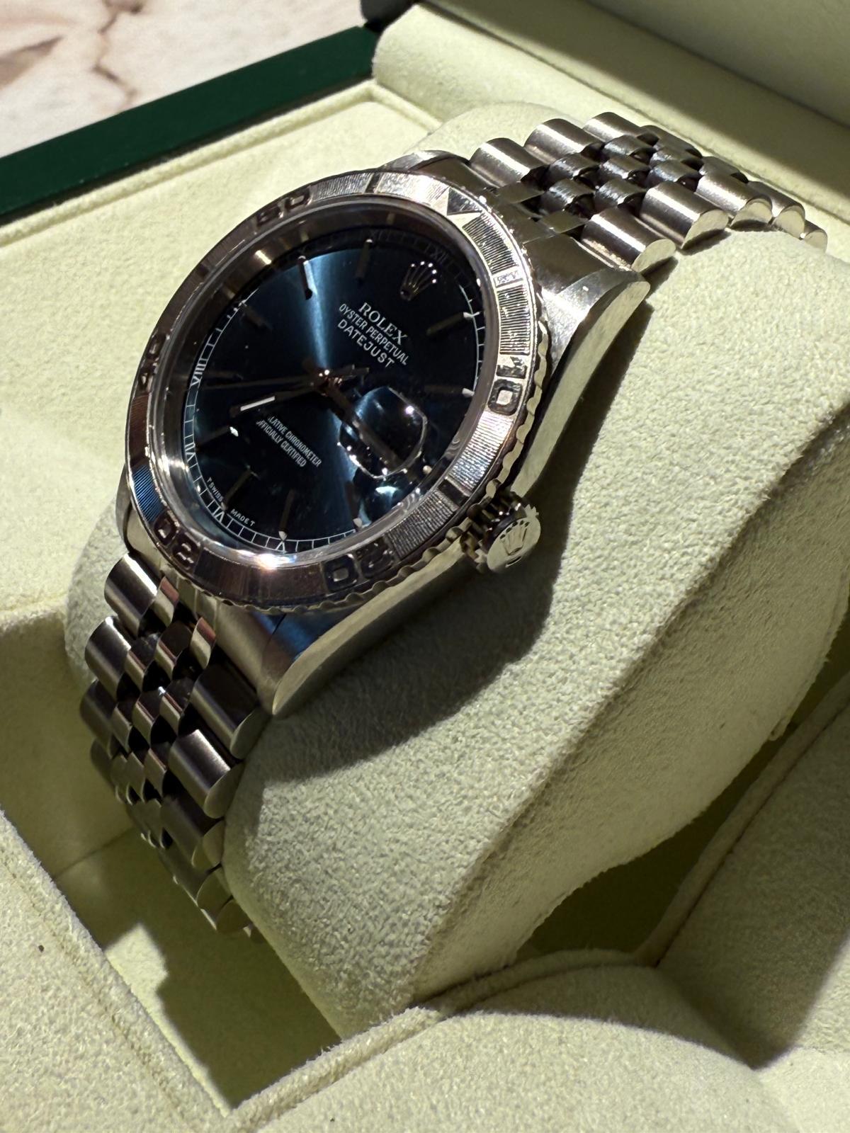 Marca Rolex Modello (Orologio) Datejust Turn-O-Graph Numero di referenza 16264 Carica Automatico Materiale della cassa Acciaio Materiale cinturino Acciaio Anno di produzione 1999 (Anno approssimativo) Condizione Usato (Ottimo) L'articolo presenta segni di usura lievi, come ad esempio graffi leggeri, ma non percepibili al tatto. Corredo Senza scatola originale, con documenti originali Carica Automatico Materiale della cassa Acciaio Diametro 36 mm Impermeabile 10 ATM Materiale lunetta Oro bianco Vetro Vetro zaffiro Cinturino Materiale cinturino Acciaio Colore cinturino Acciaio Chiusura Déployante Materiale chiusura Acciaio Funzioni Data
