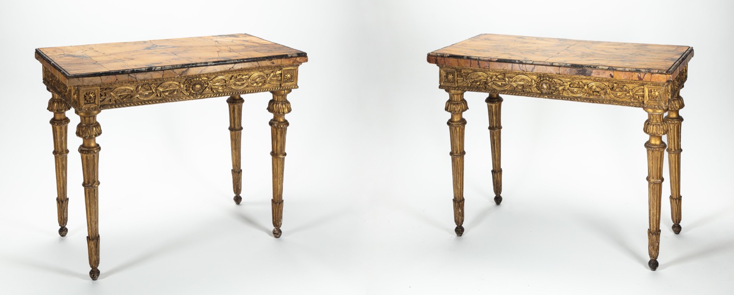 Coppia di consoles in legno intagliato con piani in marmo giallo antico. Roma, fine secolo XVIII