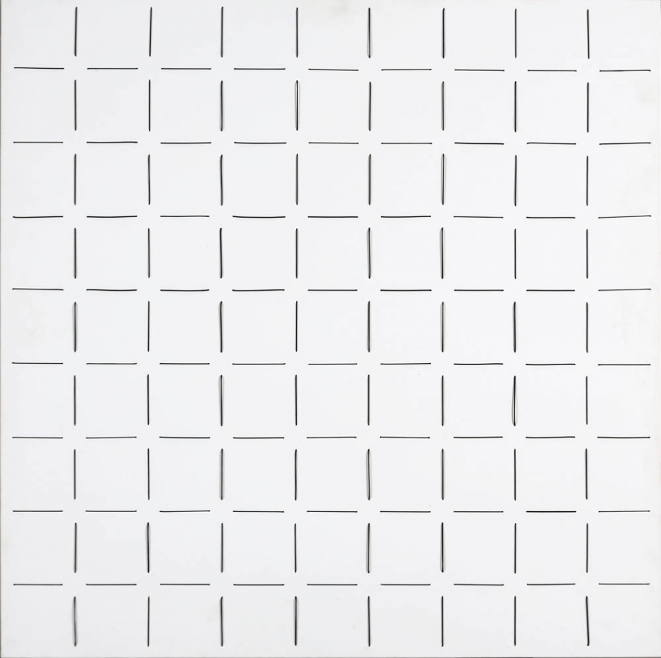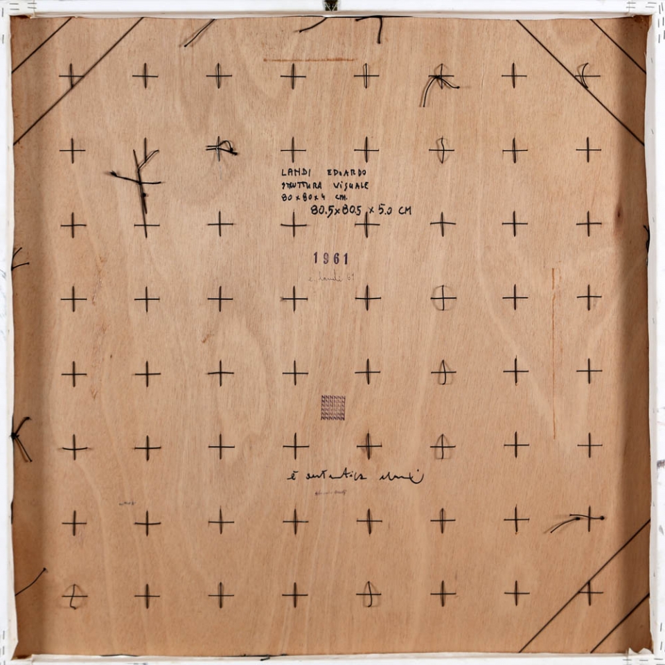 EDOARDO LANDI 1937 " Struttura visuale ", 1961 Fili elastici su tela su tavola, cm. 80,5 x 80,5 x 5 Firmato e datato sul retro Timbro Gruppo N sul retro Autentica dell'artista su fotografia Prov. Collezione Privata